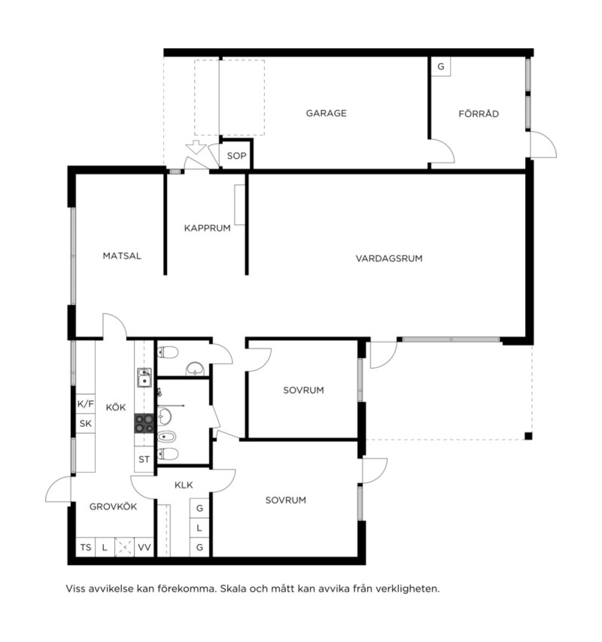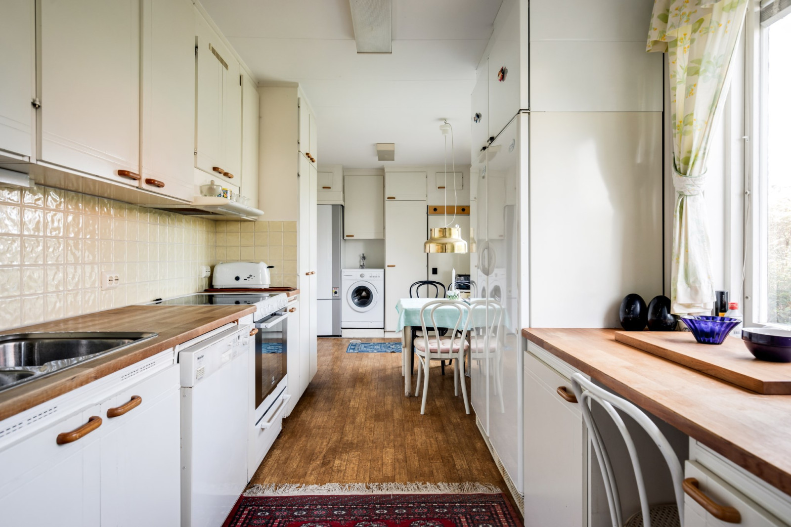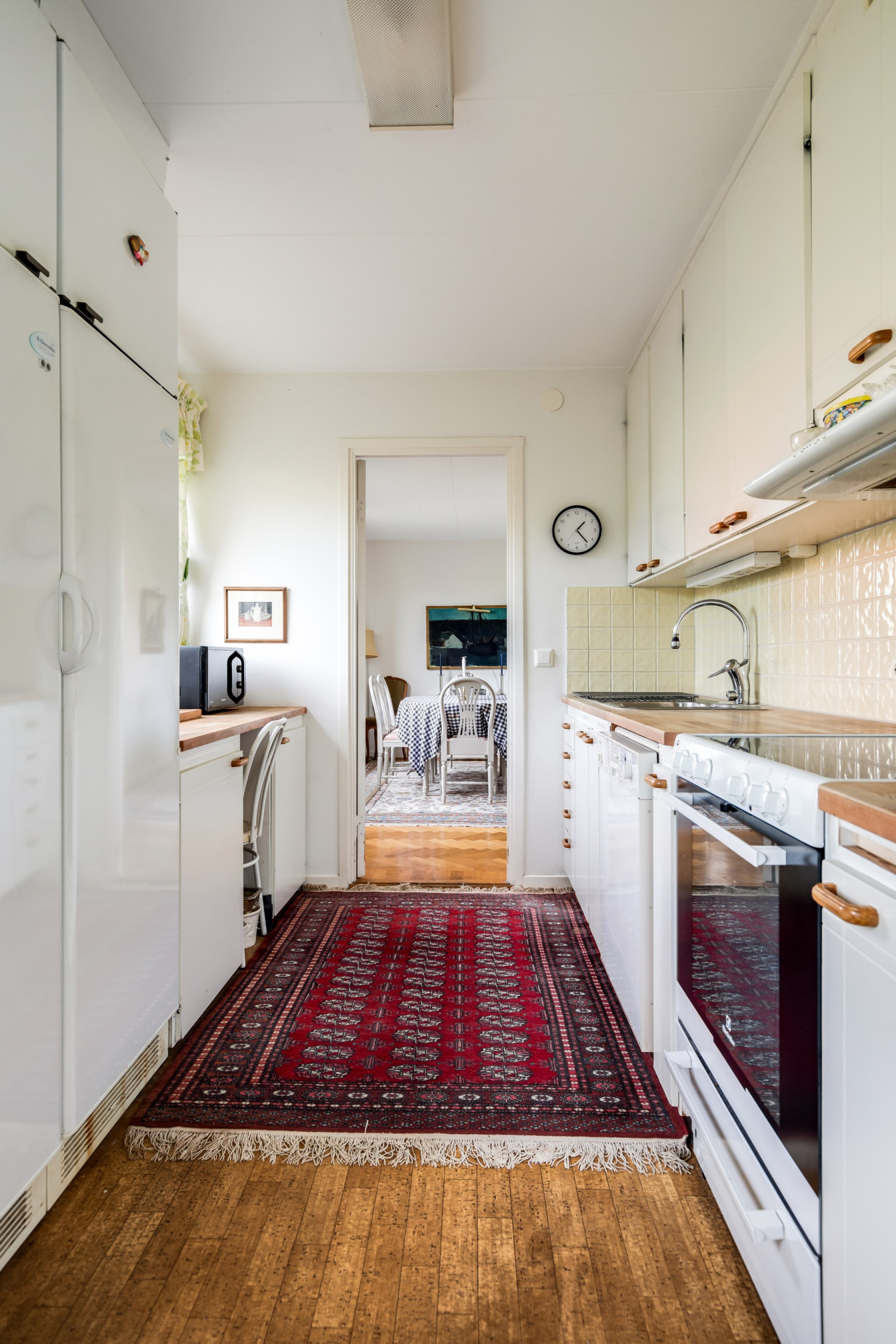 med plastmatta, kyl/frys, spis, diskmaskin, tvättmaskin, torkskåp, plats för mindre matbord och i ena delen finns tvättavdelning