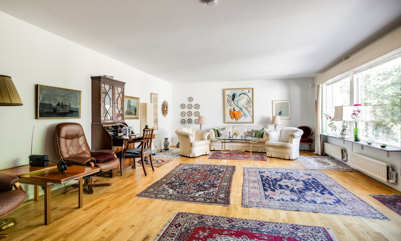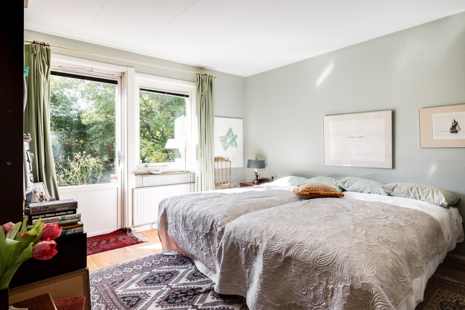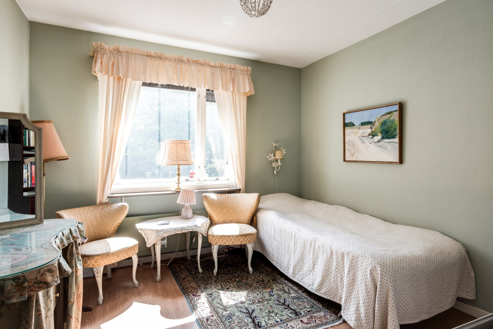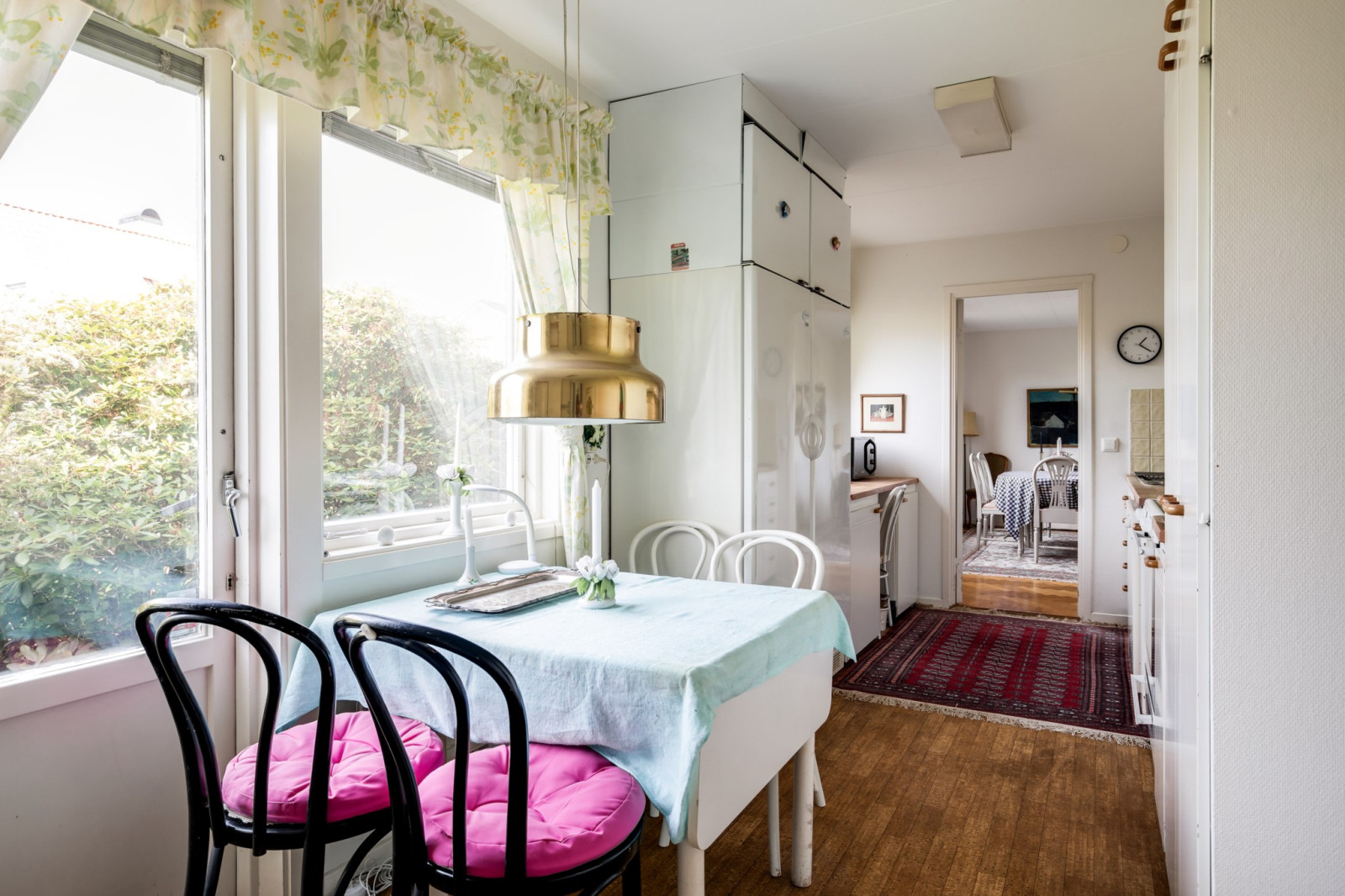 med parkettgolv och utgång till trädgården, rymligt och drygt 40 kvm stort