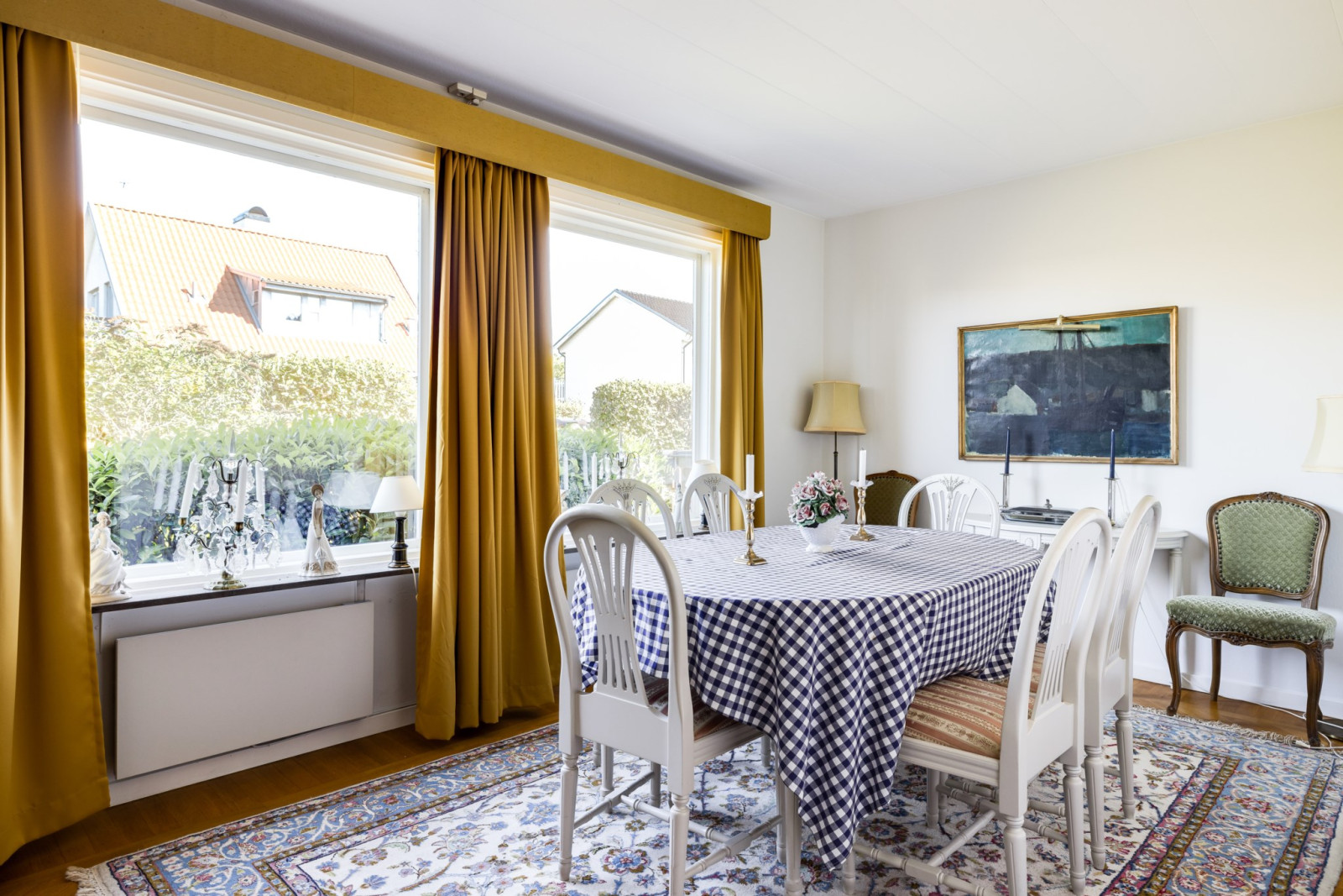 En rymlig hall välkomnar dig när du kommer in i huset. Ett väl tilltaget vardagsrum har utgång till stenlagt uteplats med sydvästläge. I samband med köket finns ett trevligt matrum och i änden på köket ett grovkök med tvättmaskin och torkskåp. Det finns två sovrum varav ett med klädkammare samt ett badrum och gästtoalett.