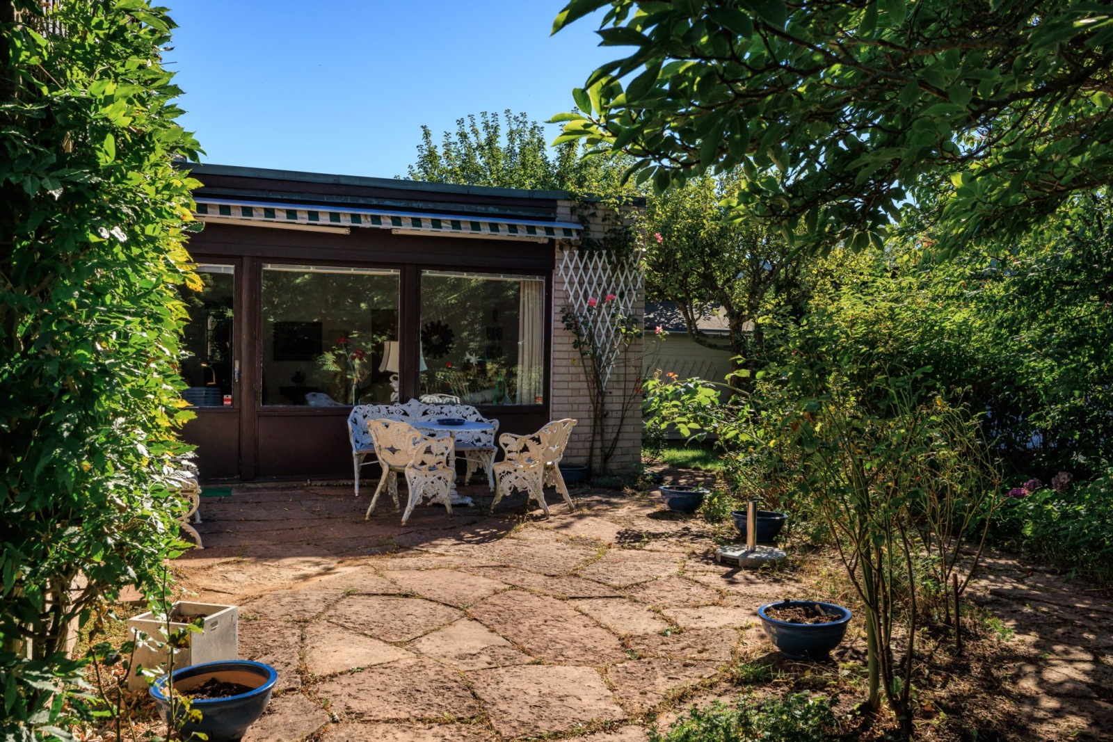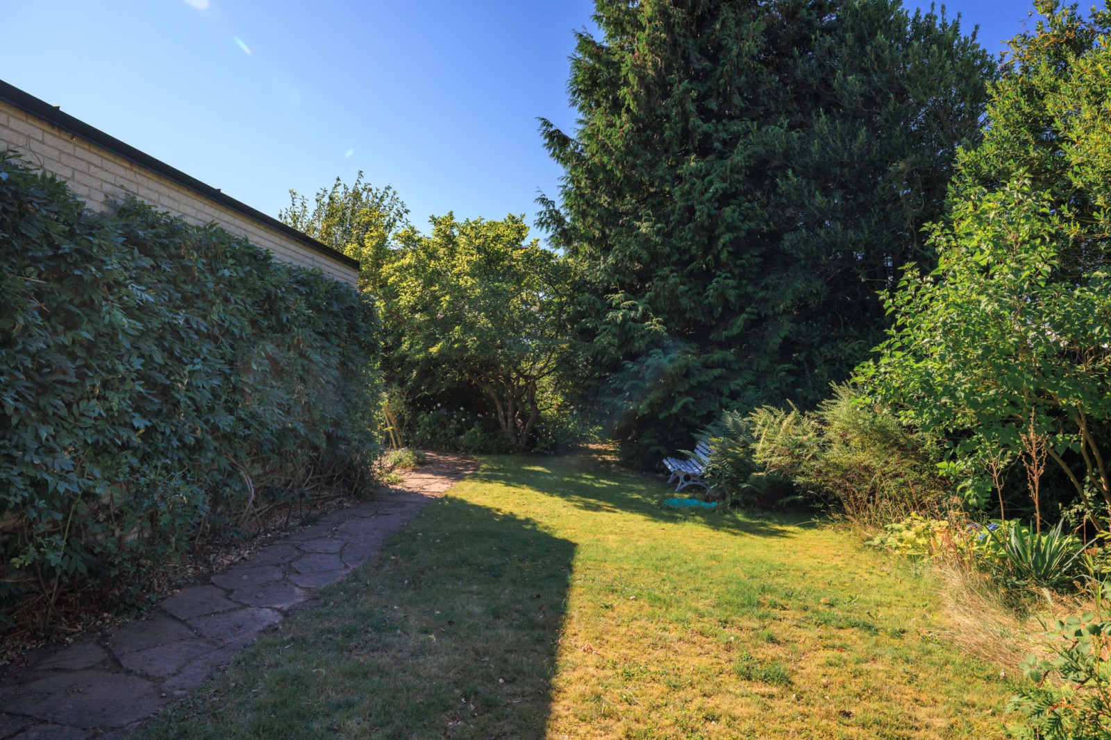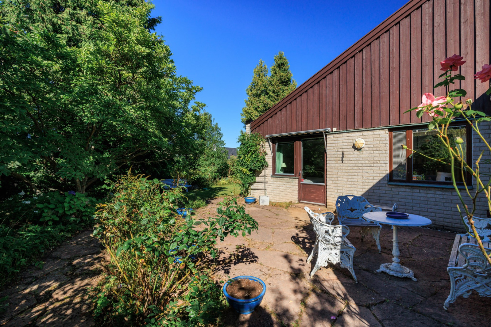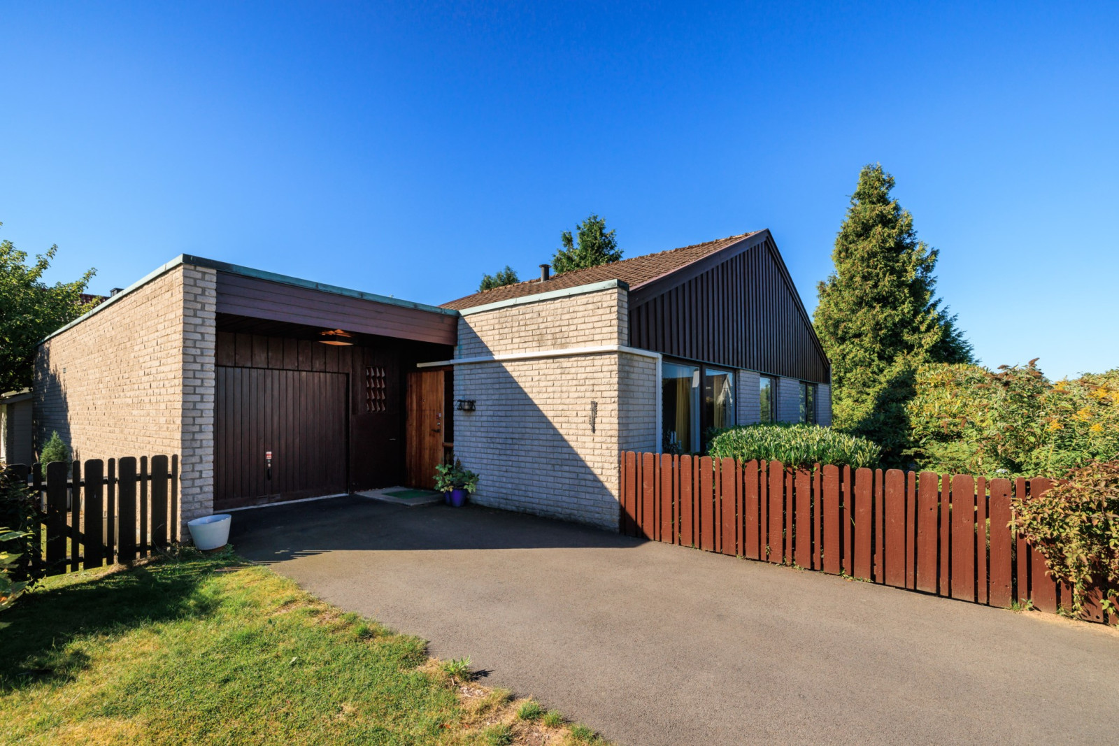 Trädgården är väl uppväxt och är omgärdad av en häck. Vidbyggt garage och förråd finns.
