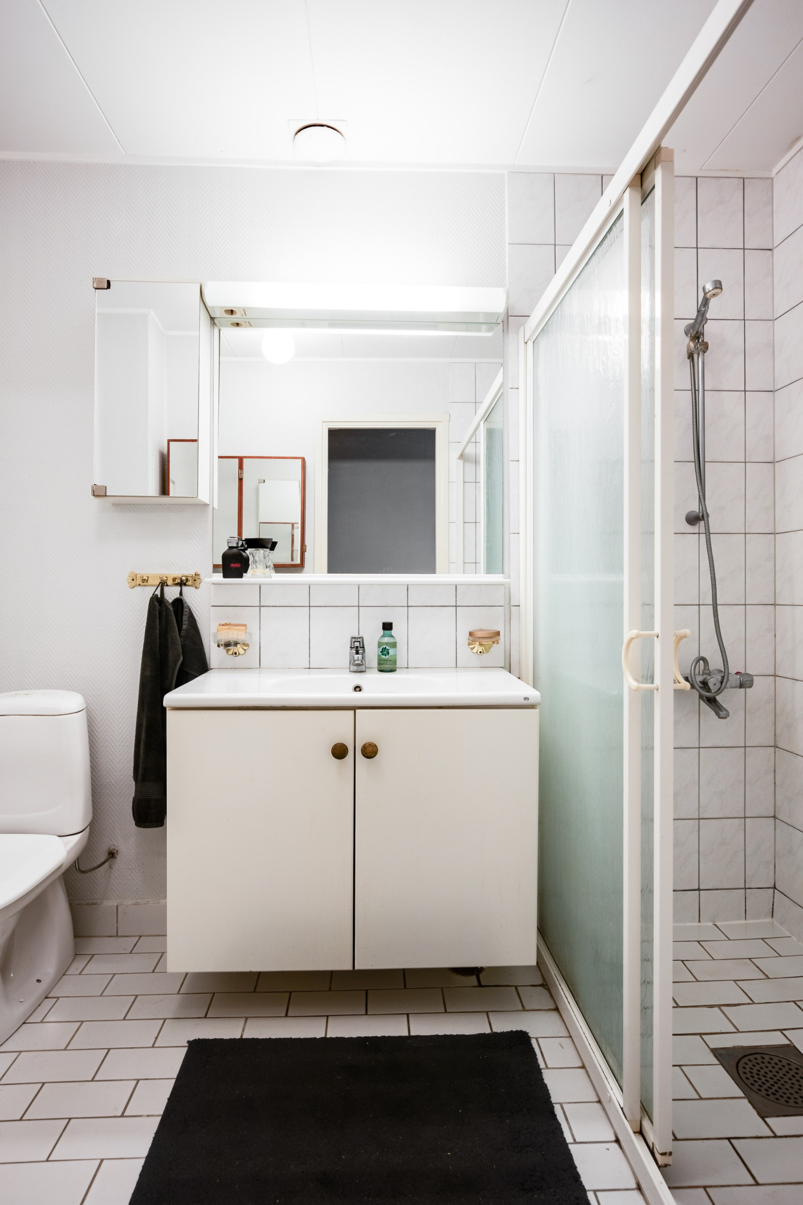 med kakel, klinker och målade väggar, dusch, handfat med kommod och toalett