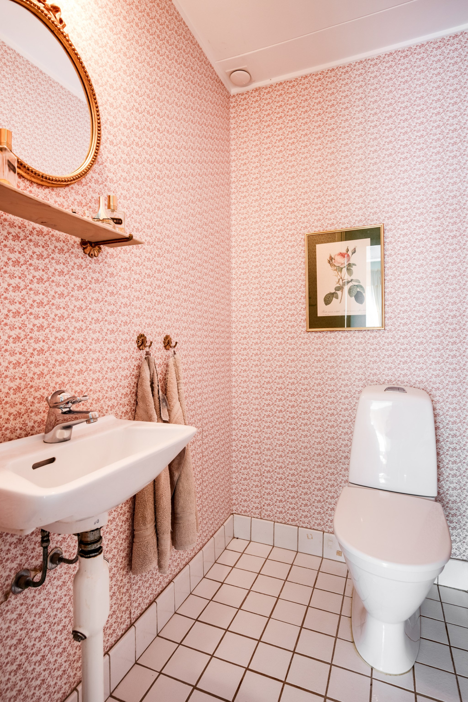 med klinker på golvet och tapet på väggen, handfat och toalett