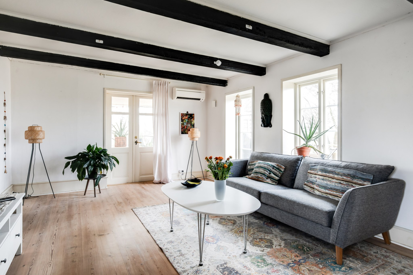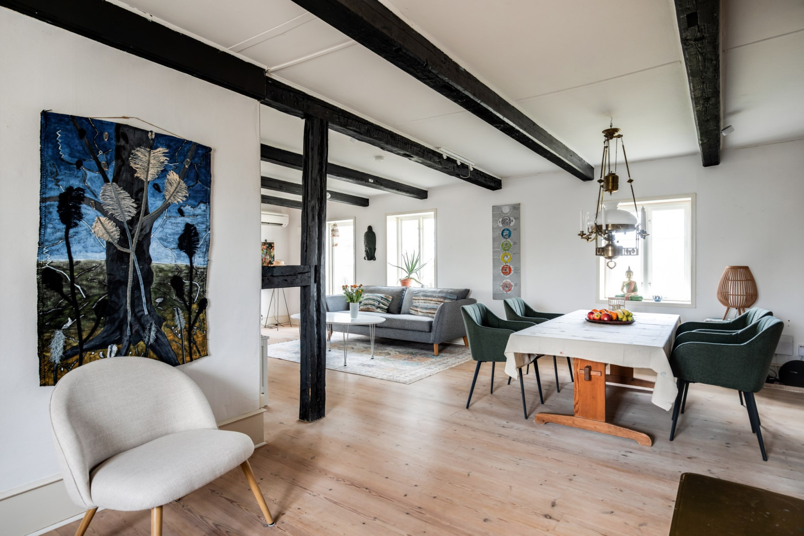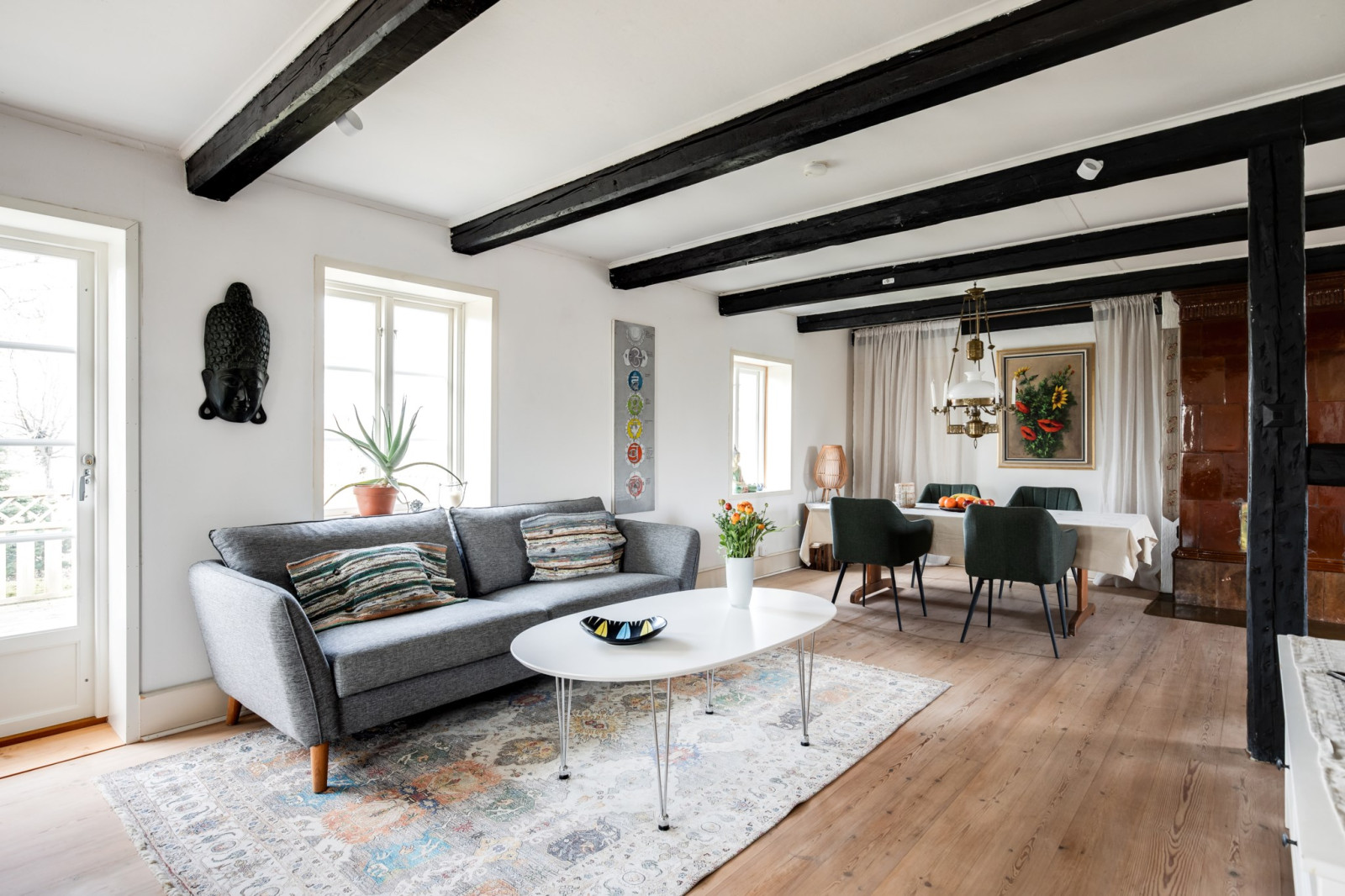 Ljust rum med vackert furugolv och vitmålat innertak med bjälkar.