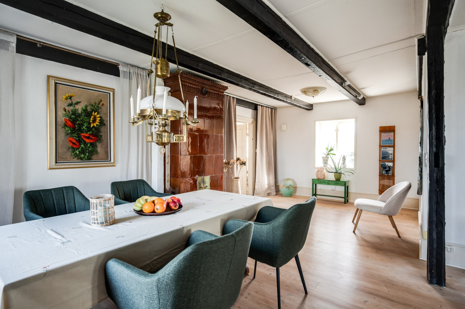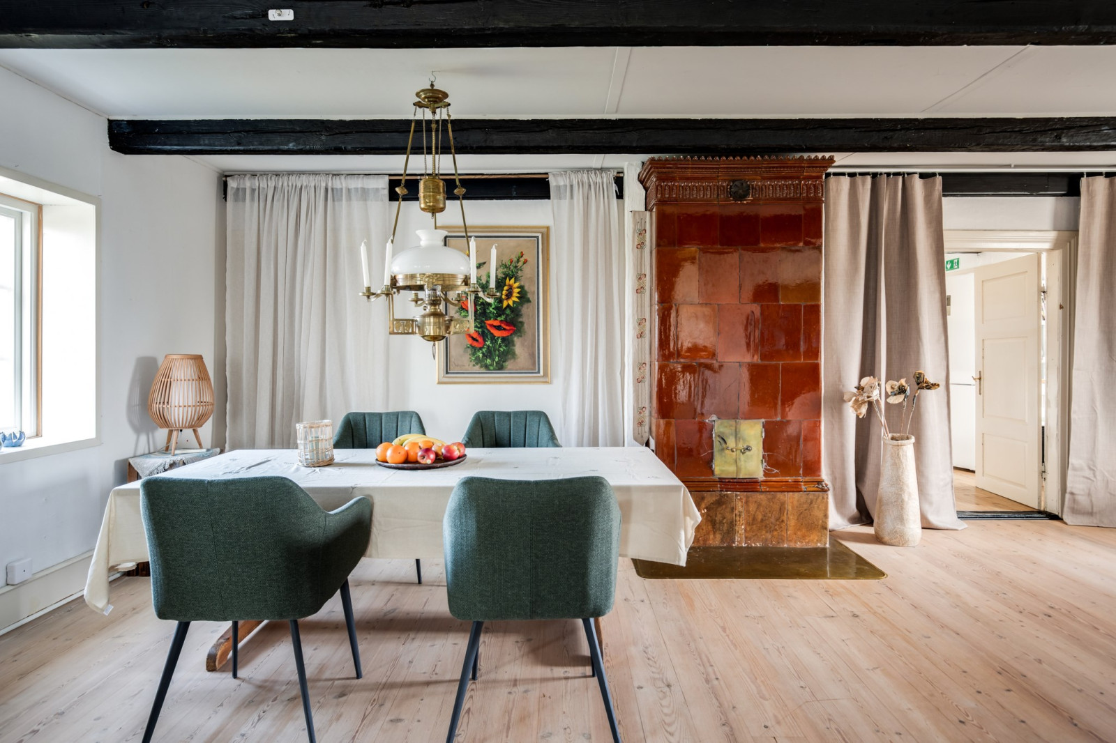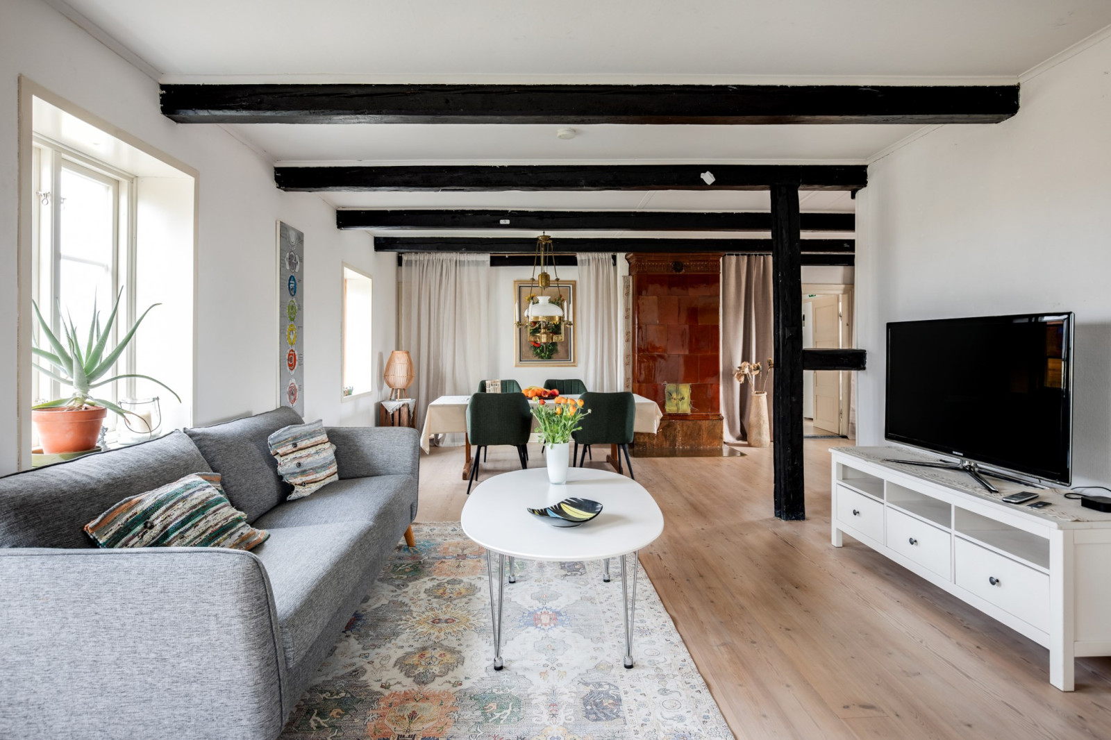 Ljust rum med vackert furugolv och vitmålat innertak med bjälkar.
