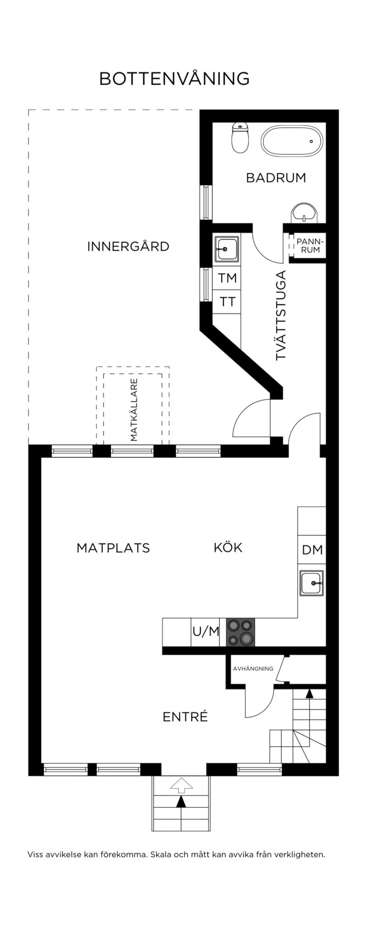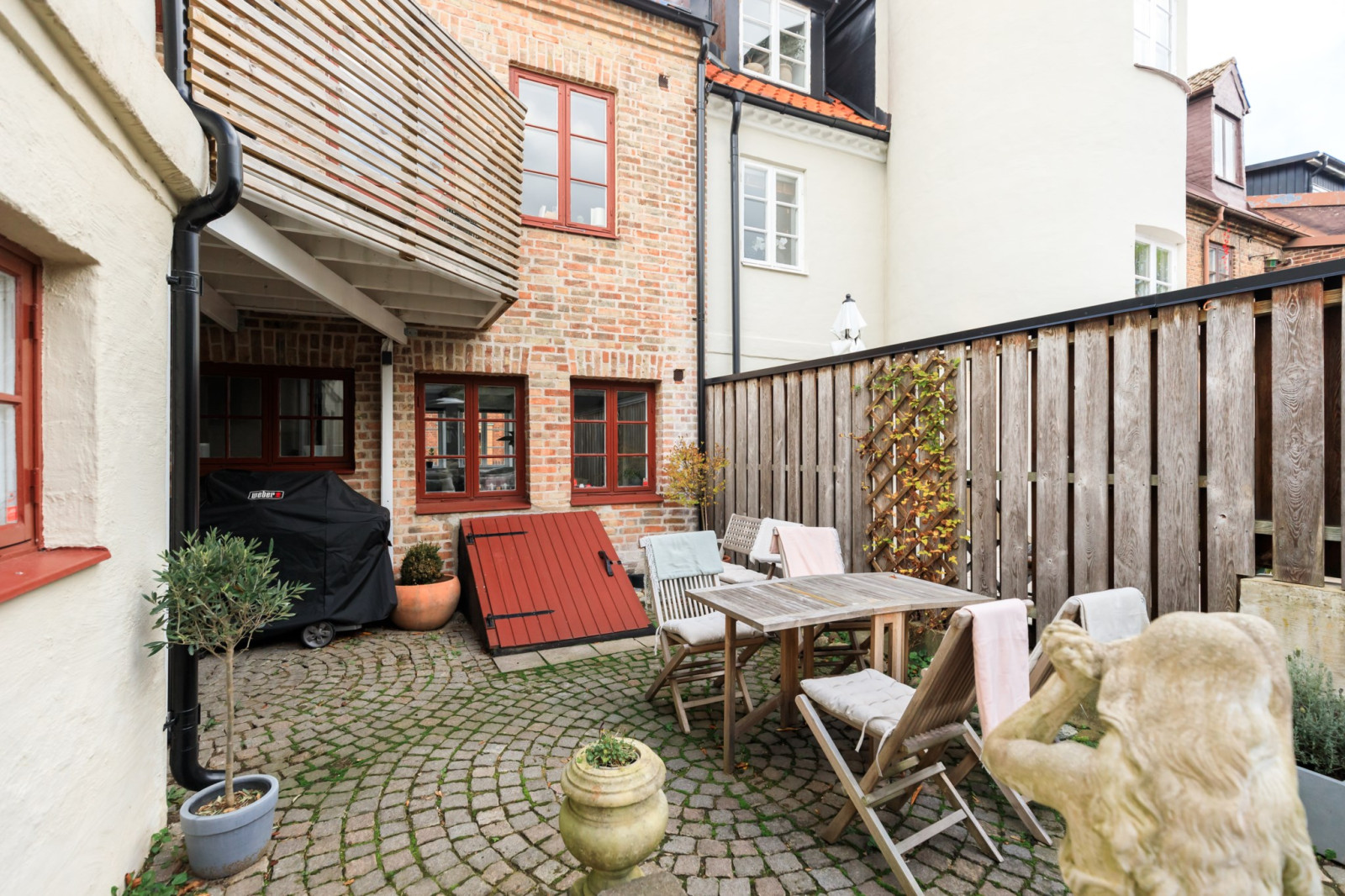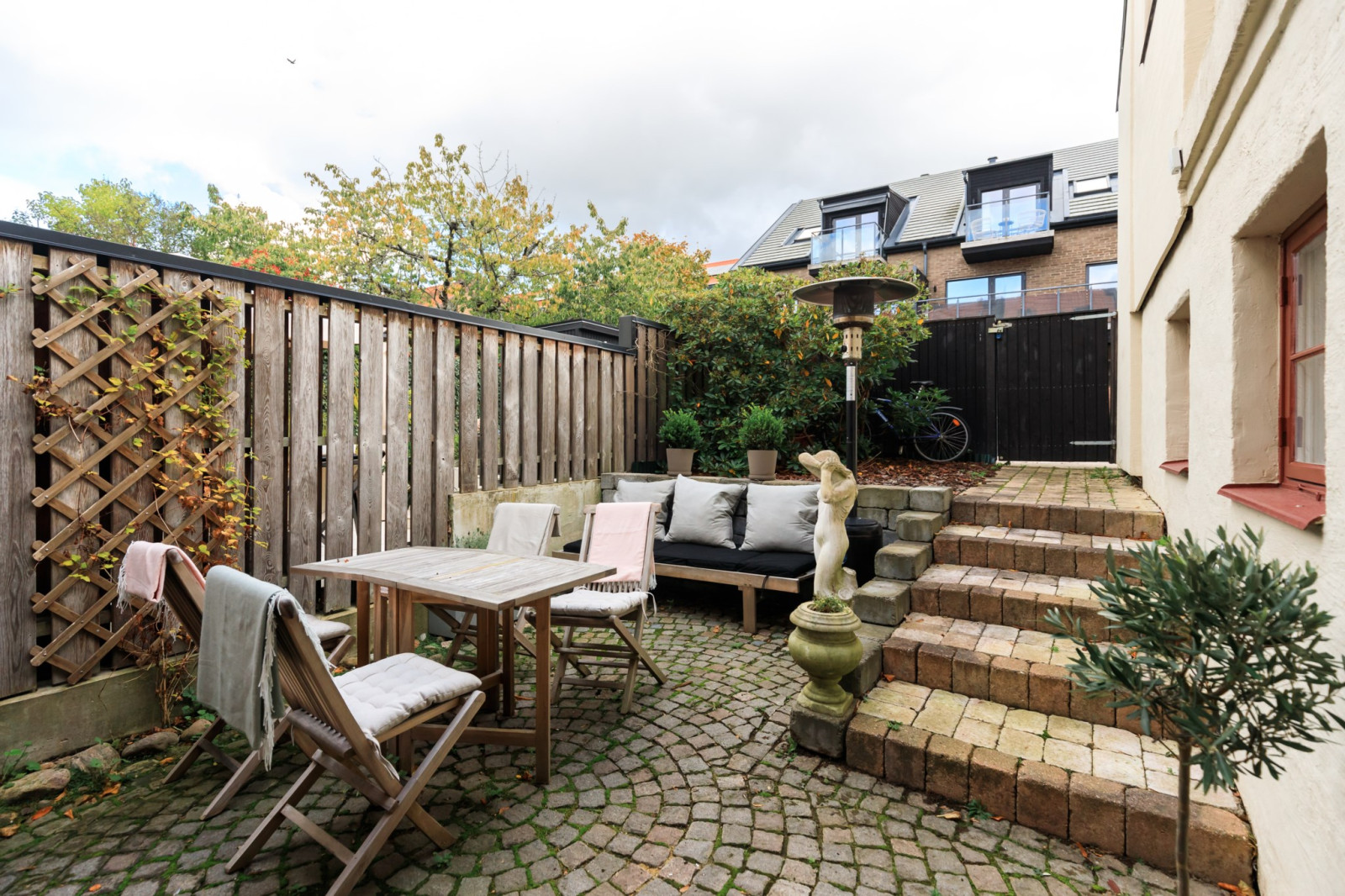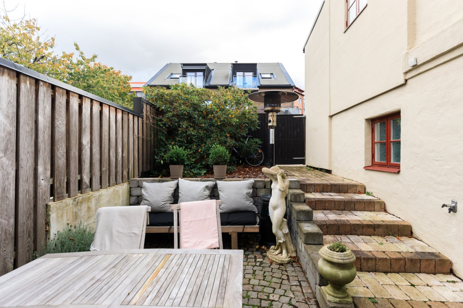 Smågatsten och staket mot grannen med klättrande växter. Mindre soffgrupp inbyggd mot muren, trappa upp mot Hebsackersgatan. Källarutrymme under huset, (kallt)