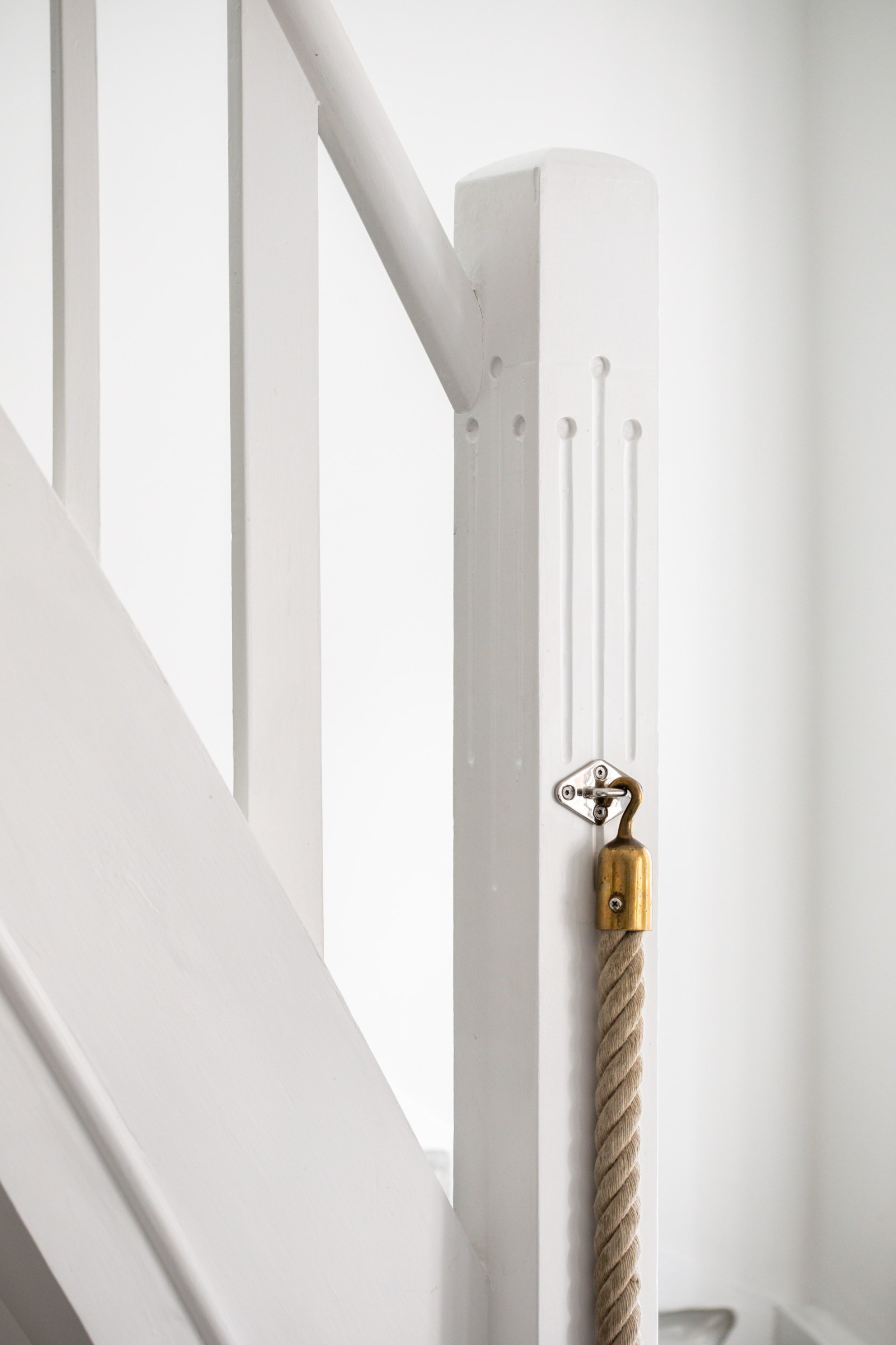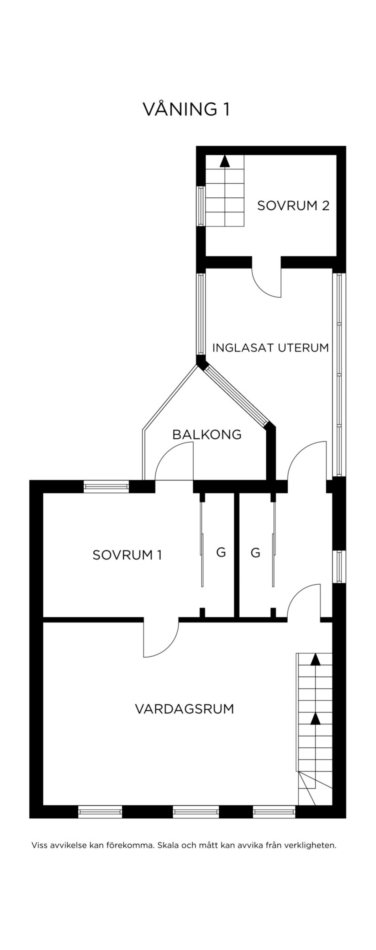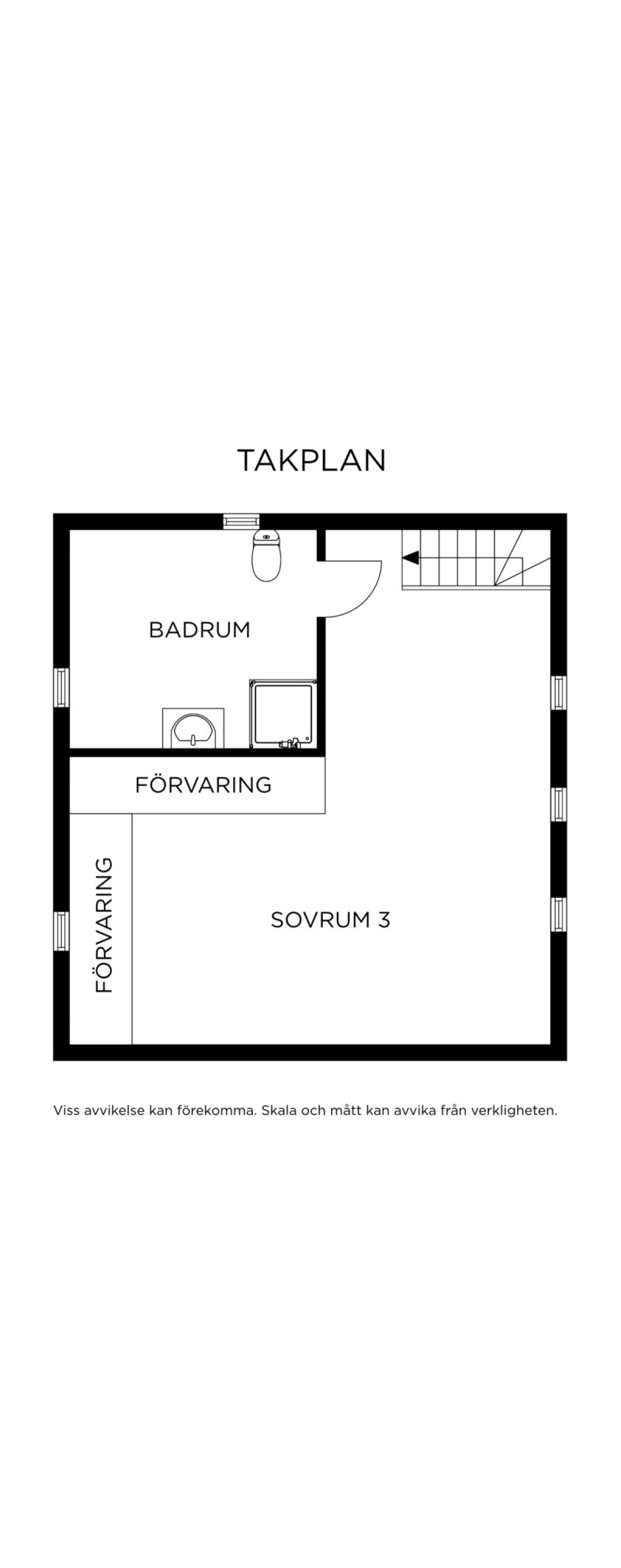 Grått laminatgolv, vitmålade väggar och tak. Ett öppningsbart fönster mot söder och ett mot norr. Trappa ner till förvaringsmöjligheter