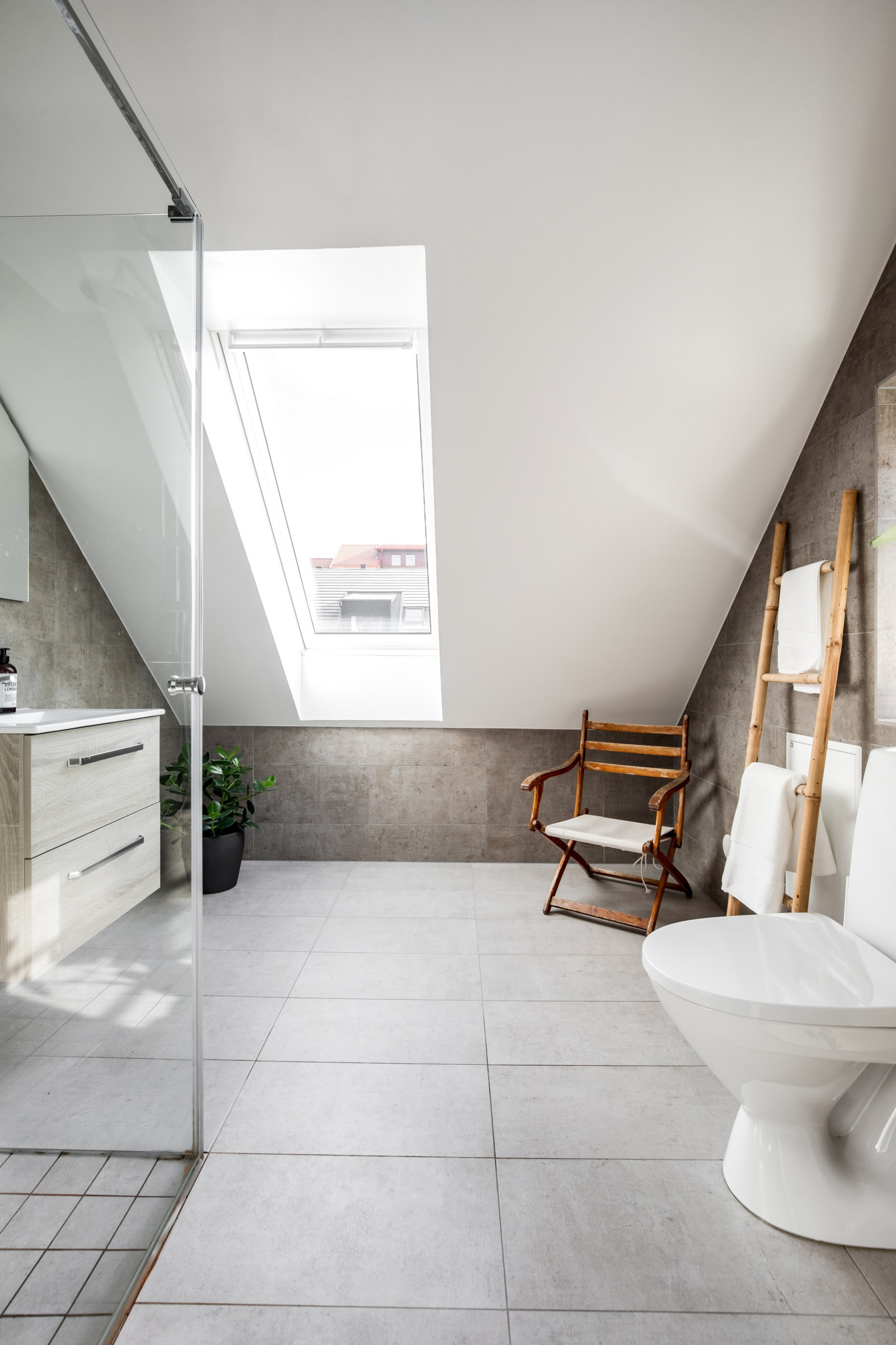 Grå klinker på golv och grå kakel på väggarna. Kommod, spegel, ett takfönster, infällda spotlights, ventilation med pax fläkt, synliga takstolar, inspektionslucka till rördragning