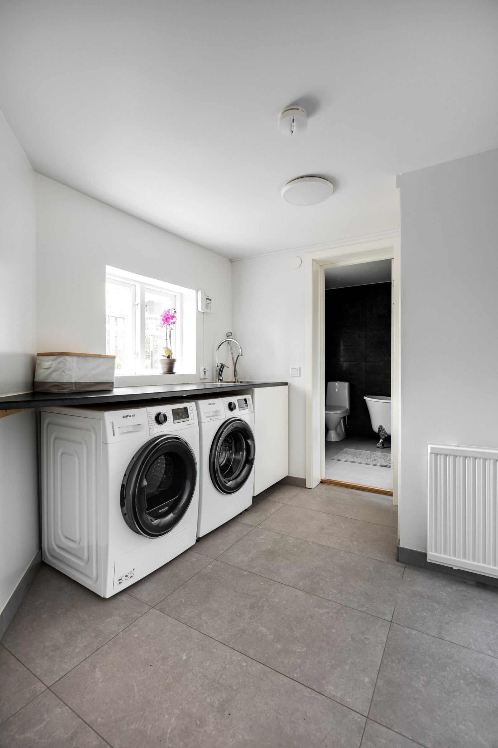 Grått laminatgolv, vitmålade väggar och tak. Tvättmaskin och torktumlare Elektrolux (2020), svart laminat bänksiva, vask, förvaring, ett öppningsbart fönster mot innergård, element