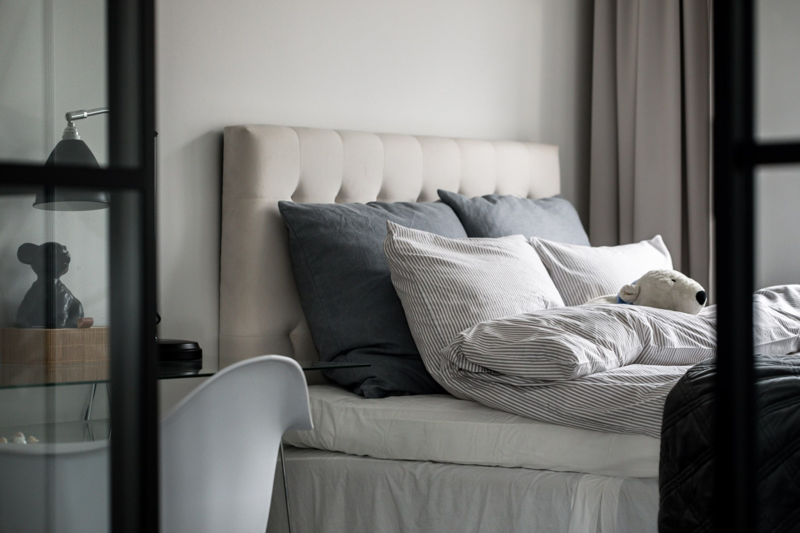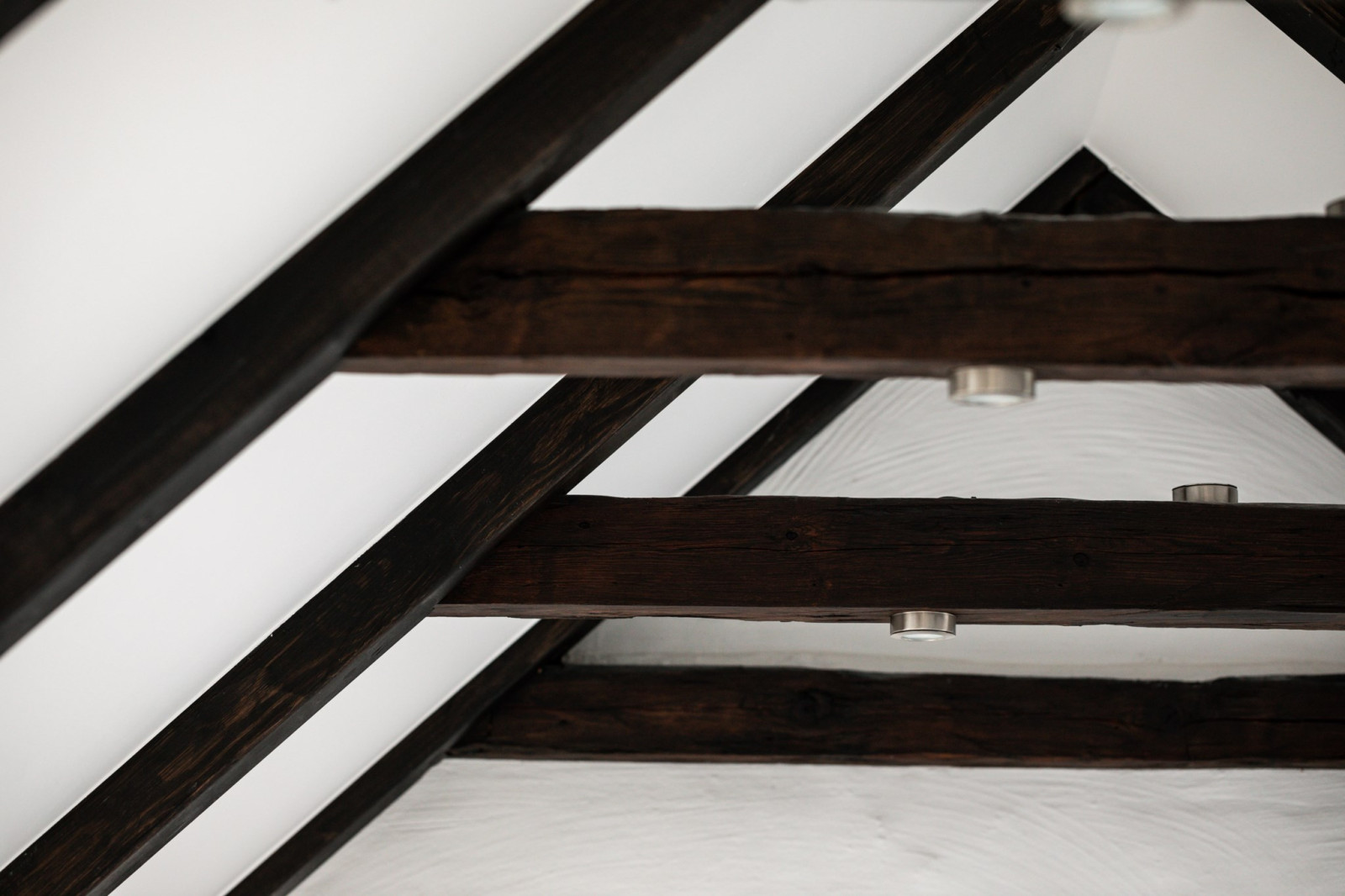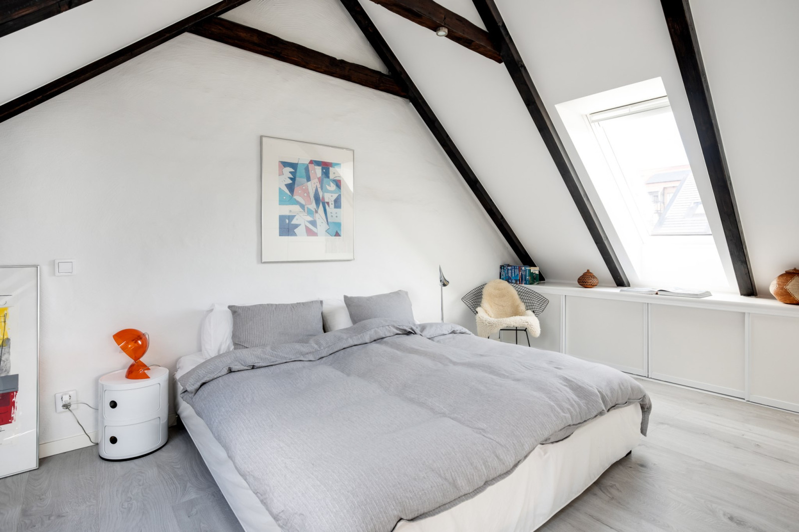 Grått laminatgolv, vitmålade väggar och tak. Synliga takstolar och bjälkar, garderober, utgång till balkong