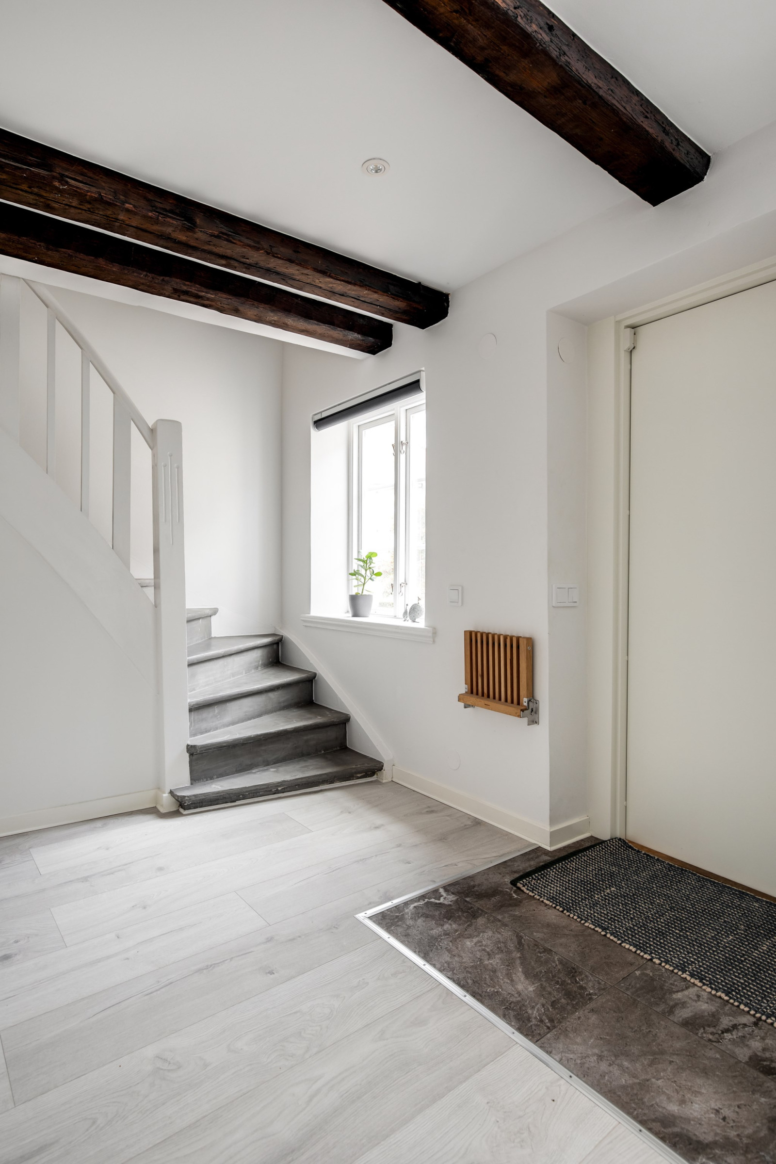 Grått laminatgolv, grå klinker vid entré dörr, två öppningsbara fönster mot Övre långvinkels gatan, vitmålade väggar och tak. Synliga takstolar och bjälkar. Förvaringsutrymme och rum till rördragning och panna