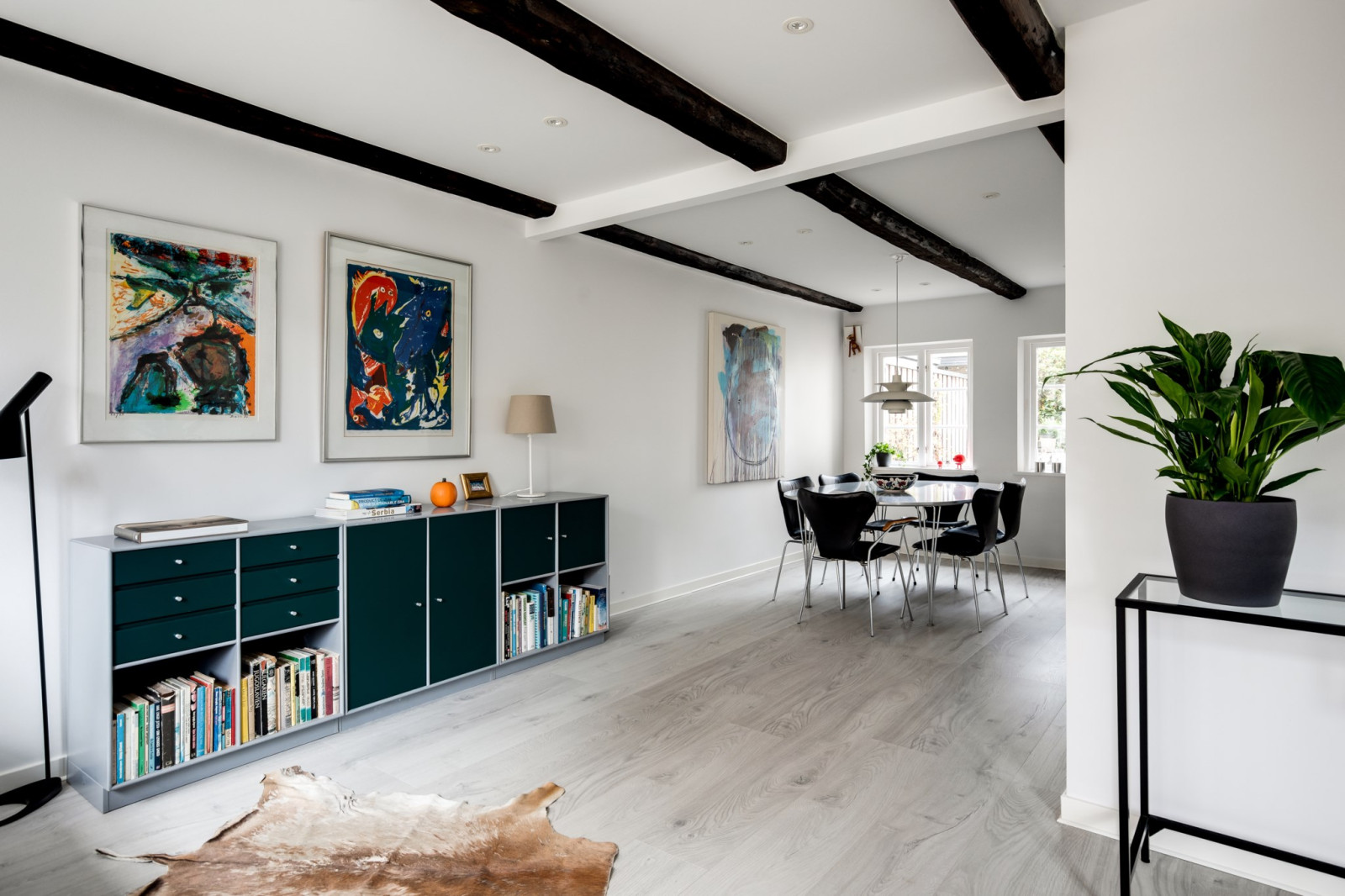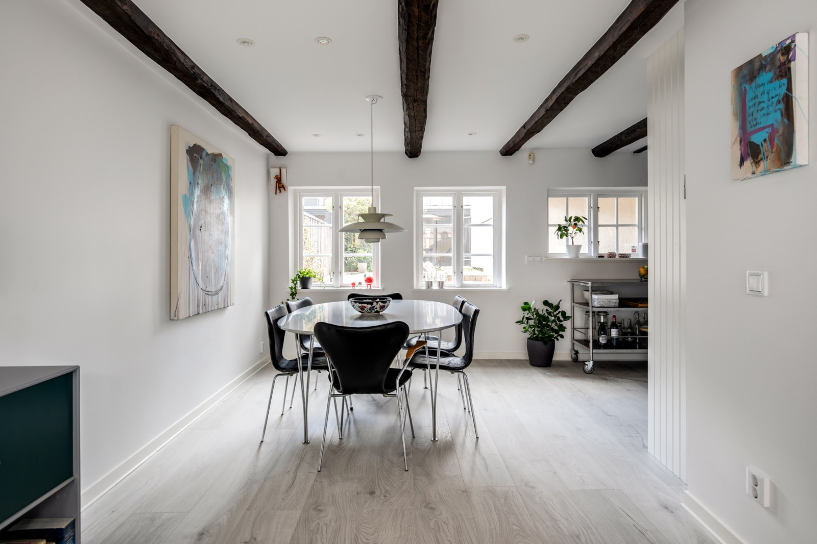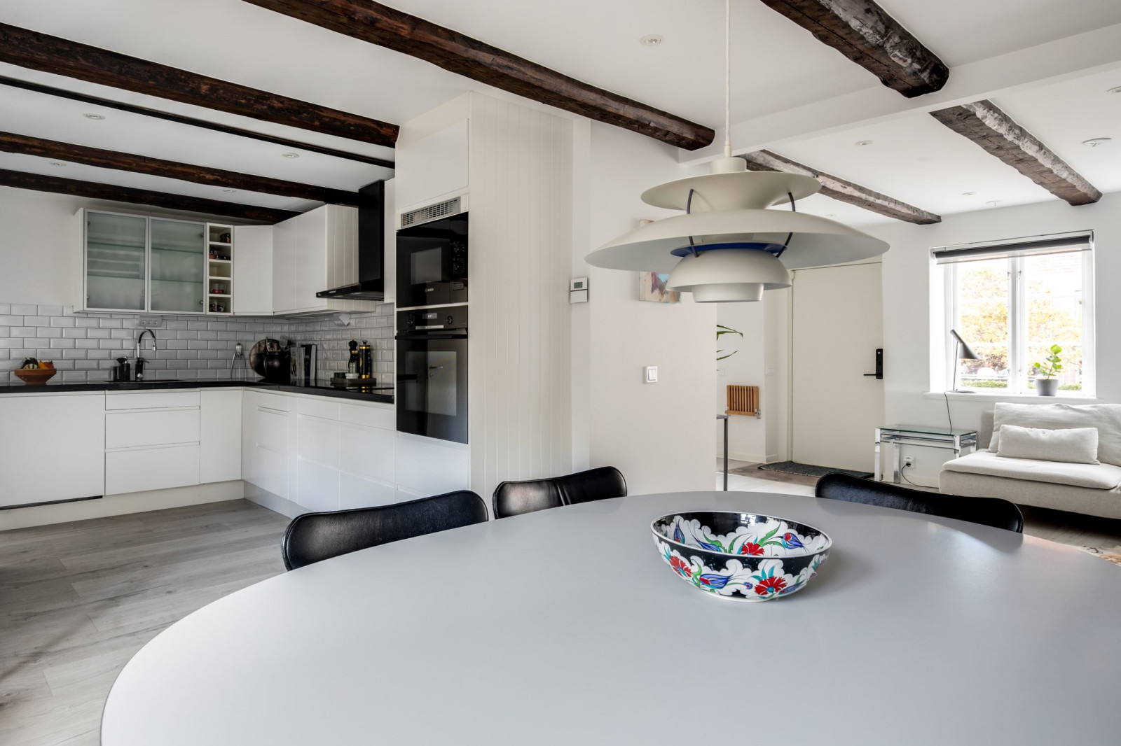 Grått laminatgolv, vitmålade väggar och tak. Synliga takstolar och bjälkar. Två öppningsbara fönster mot innergård. Kök från Epok, vit slät lucka, svart granit, underlimmad vask, vitt kakel klassiskt stil som stänksskydd vid bänksksivan i köket, spishåll induktion IKEA (2023), mikrovågsugn Bosch (2020), ugn Bosch (2020), fläkt Thermex (2020), kyl och frys från side by side Samsung ( 2020), diskmaskin Elektrolux (2023)