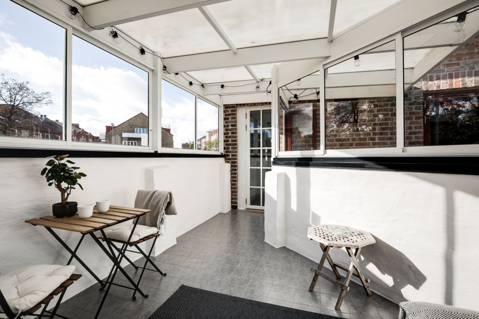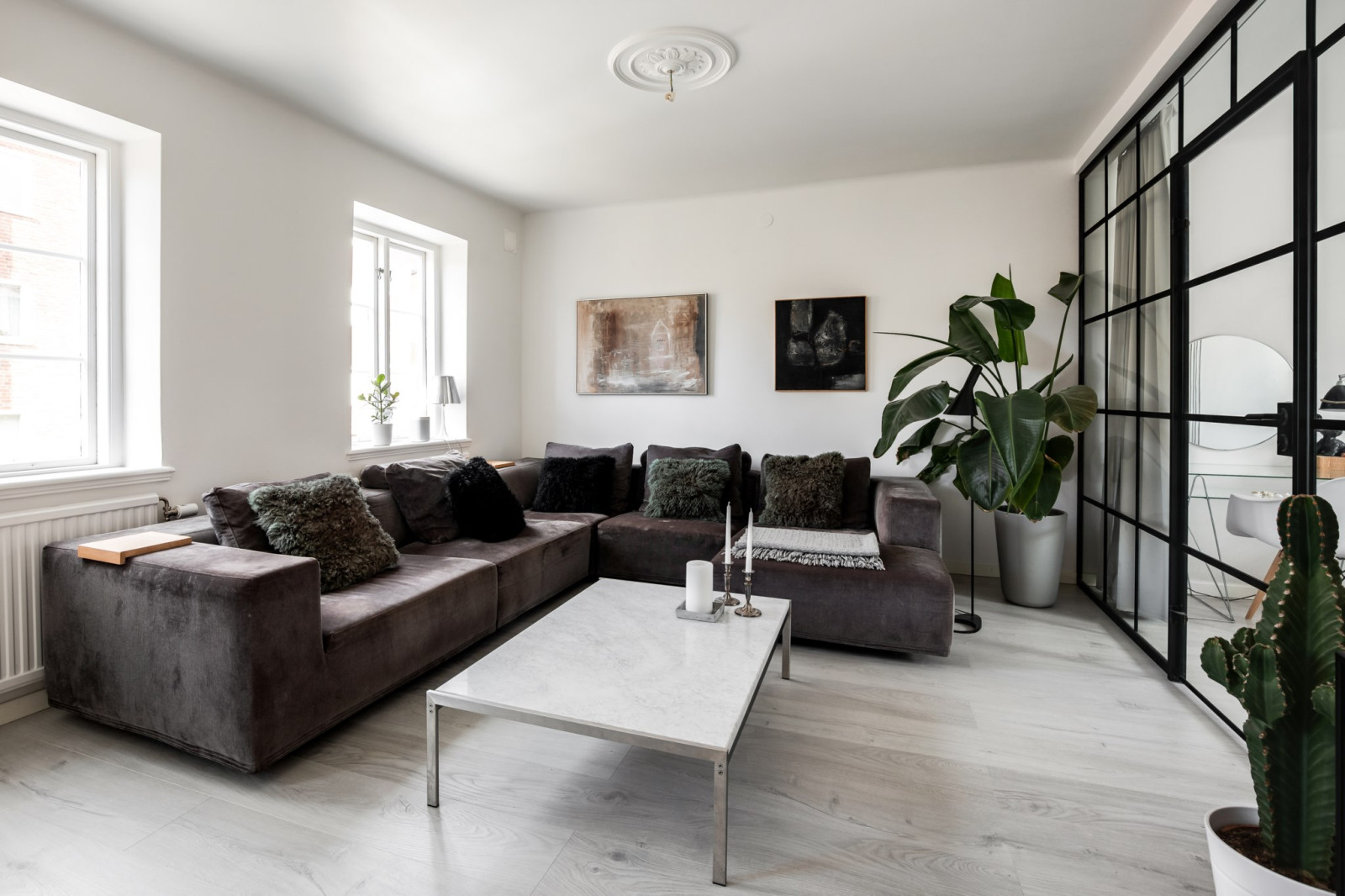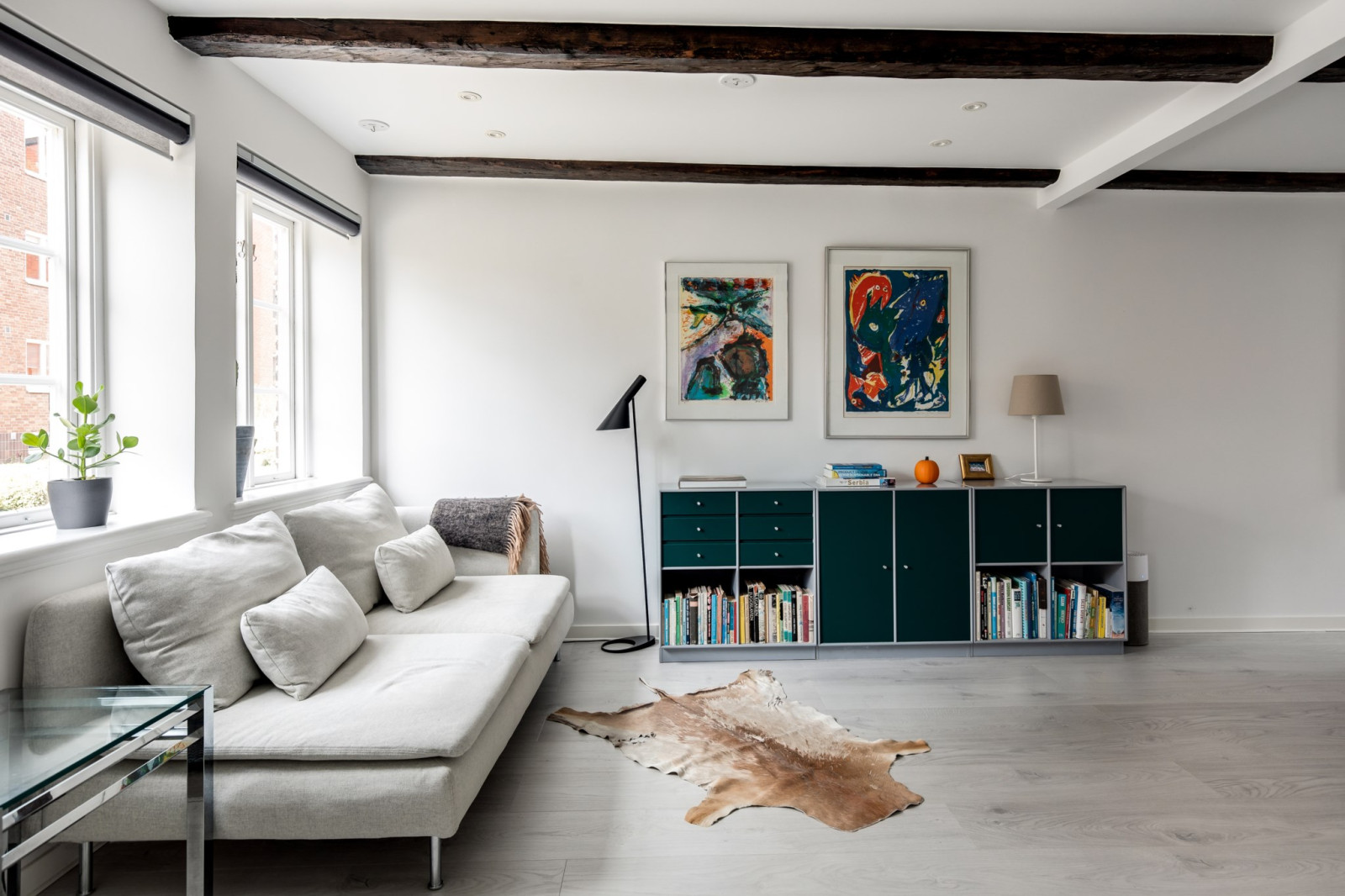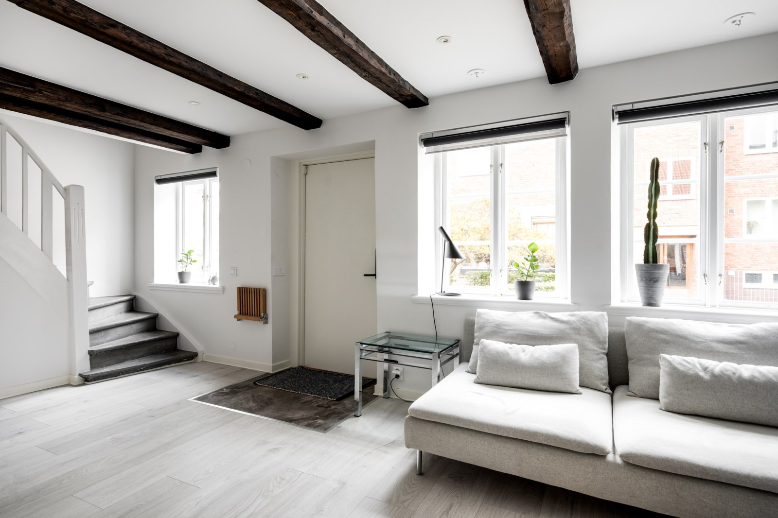 Grått laminatgolv, vitmålade väggar och tak. Synliga takstolar och bjälkar. Två öppningsbara fönster mot innergård. Kök från Epok, vit slät lucka, svart granit, underlimmad vask, vitt kakel klassiskt stil som stänksskydd vid bänksksivan i köket, spishåll induktion IKEA (2023), mikrovågsugn Bosch (2020), ugn Bosch (2020), fläkt Thermex (2020), kyl och frys från side by side Samsung ( 2020), diskmaskin Elektrolux (2023)