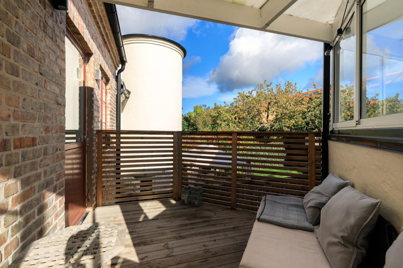 Trä trall, skjutpartier i glas, det finns två ingångar till denna balkong, en från sovrum 1 våningsplan två och ett efter genomgångsrummet våningsplan två