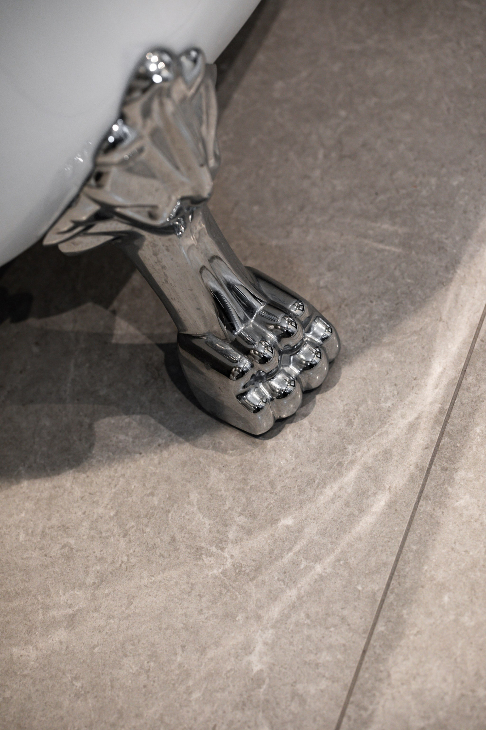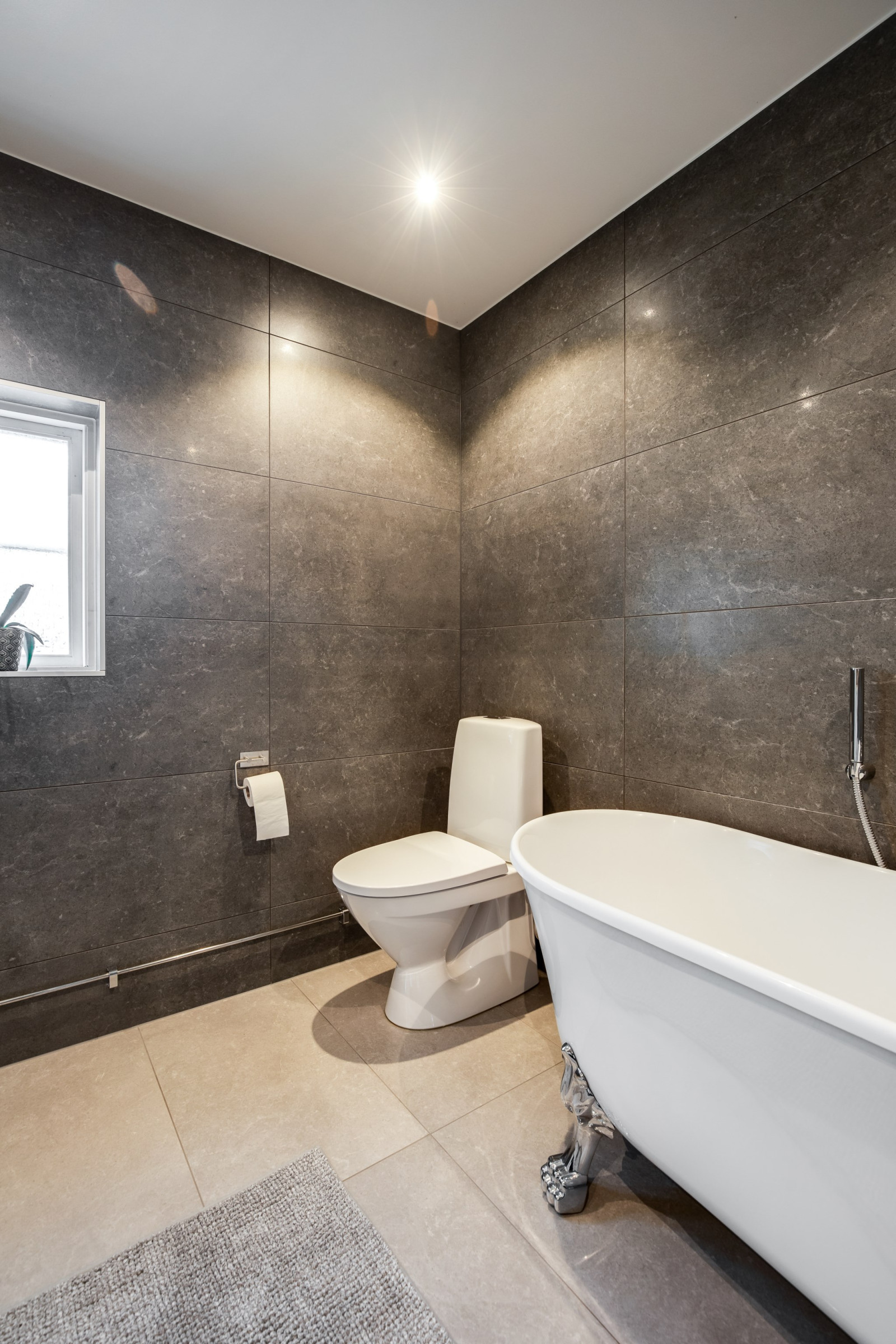 Ljusgrå klinker på golv och mörkare grå kakel på väggarna, vitmålat tak, infällda spotlights, badkar, kommod vitt med två lådor, wc, ett öppningsbart fönster