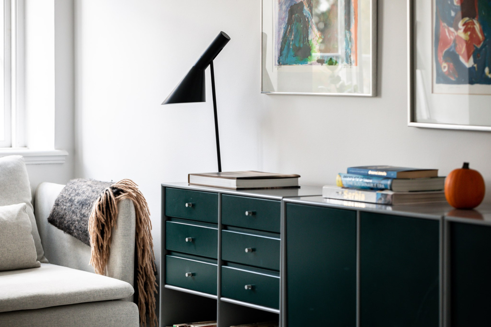 Grått laminatgolv, vitmålade väggar och tak. synliga takstolar och bjälkar, trappa ner mot entréplan och upp till våning tre. Tre öppningsbara fönster mot Övre Långvinkels gatan. Svart industriglas från Ryds glas i Helsingborg som är ljudisolerat. Glasräcke till trappan upp i huset. Det finns möjlighet för att installera en kamin