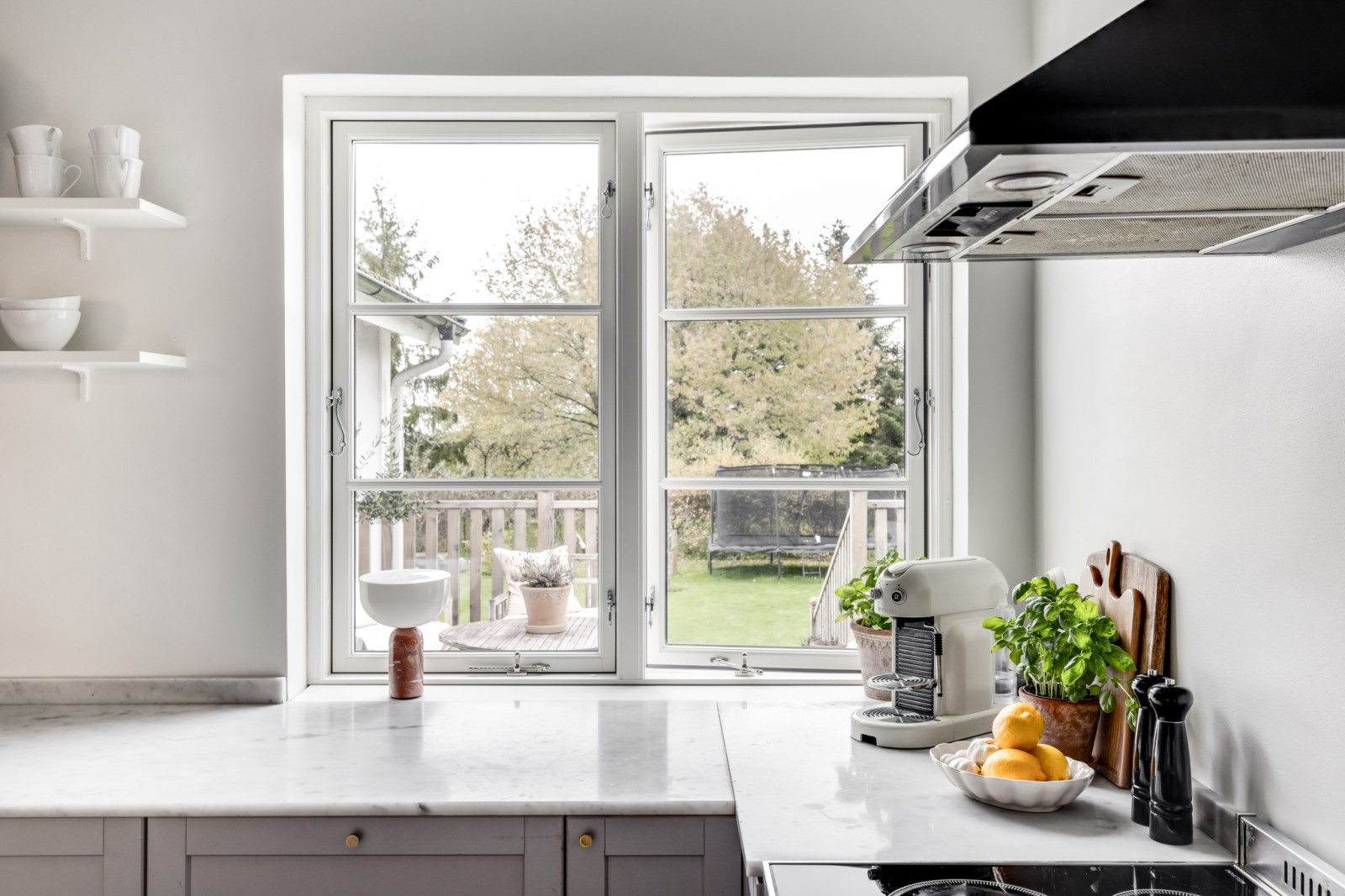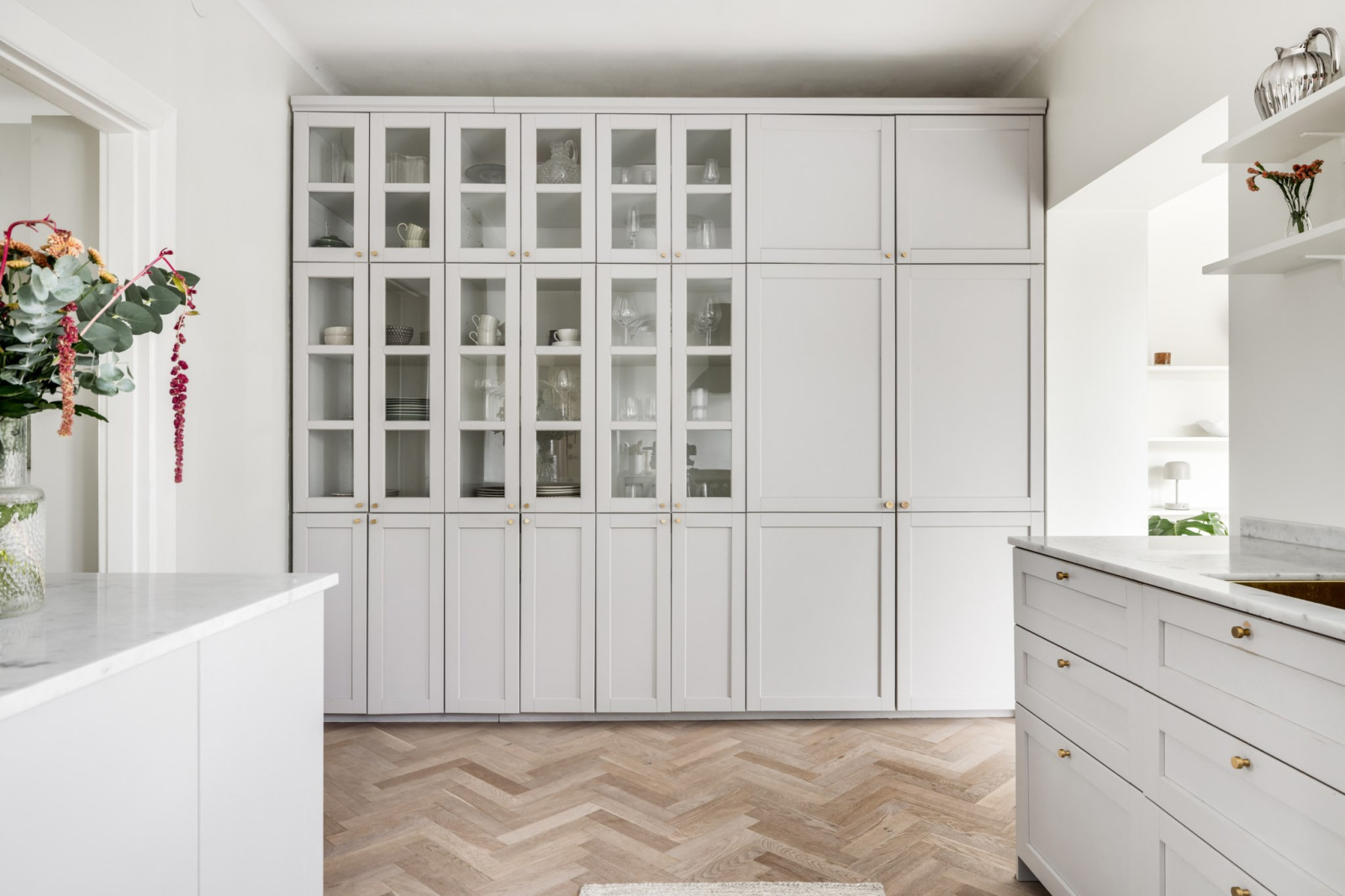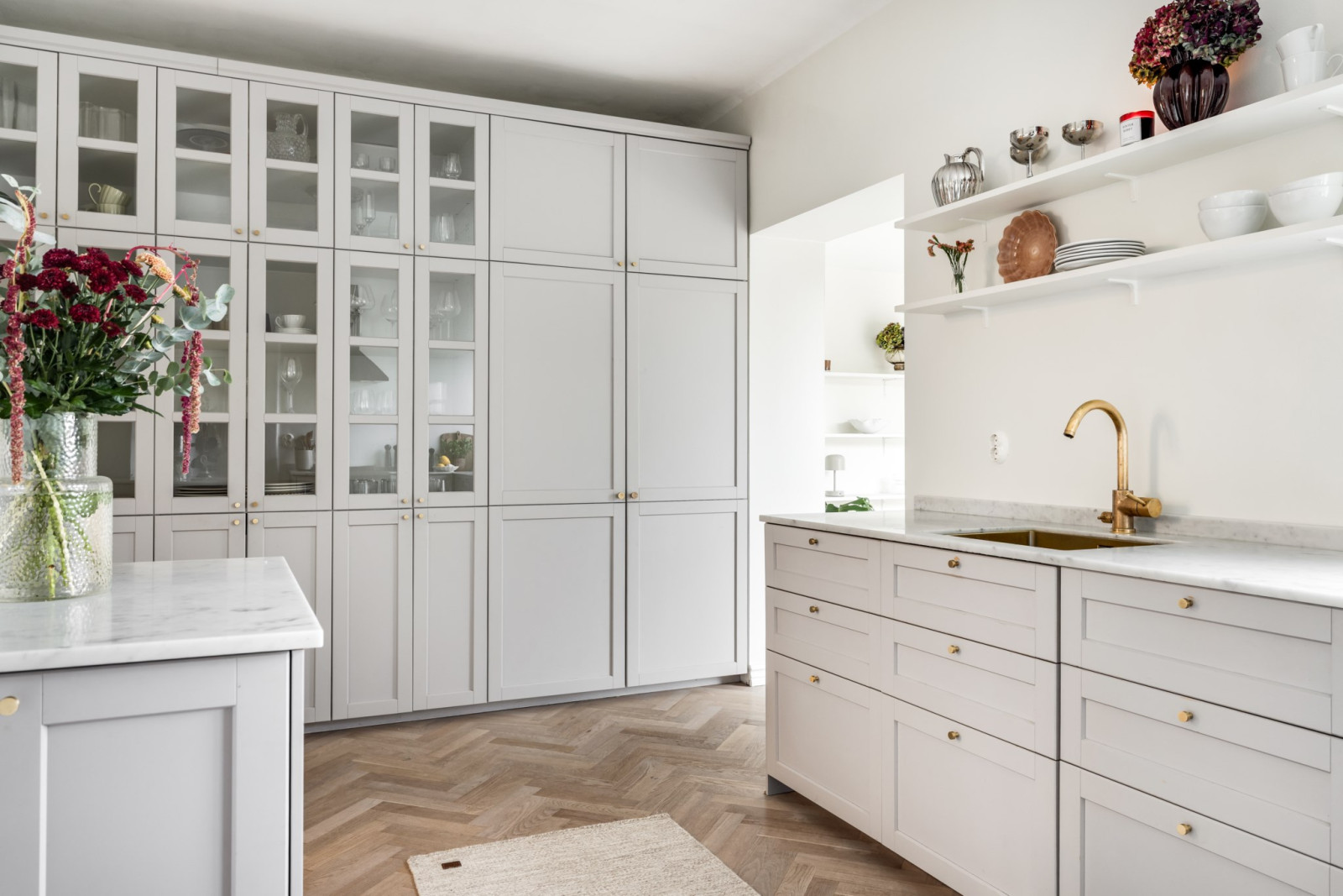 - Kök renoverades tidstypiskt med vackra vitrinskåp, god förvaring och stora bänkytor i carraramarmor. Samtliga vitvaror från 2020. Blandare från Tapwell.