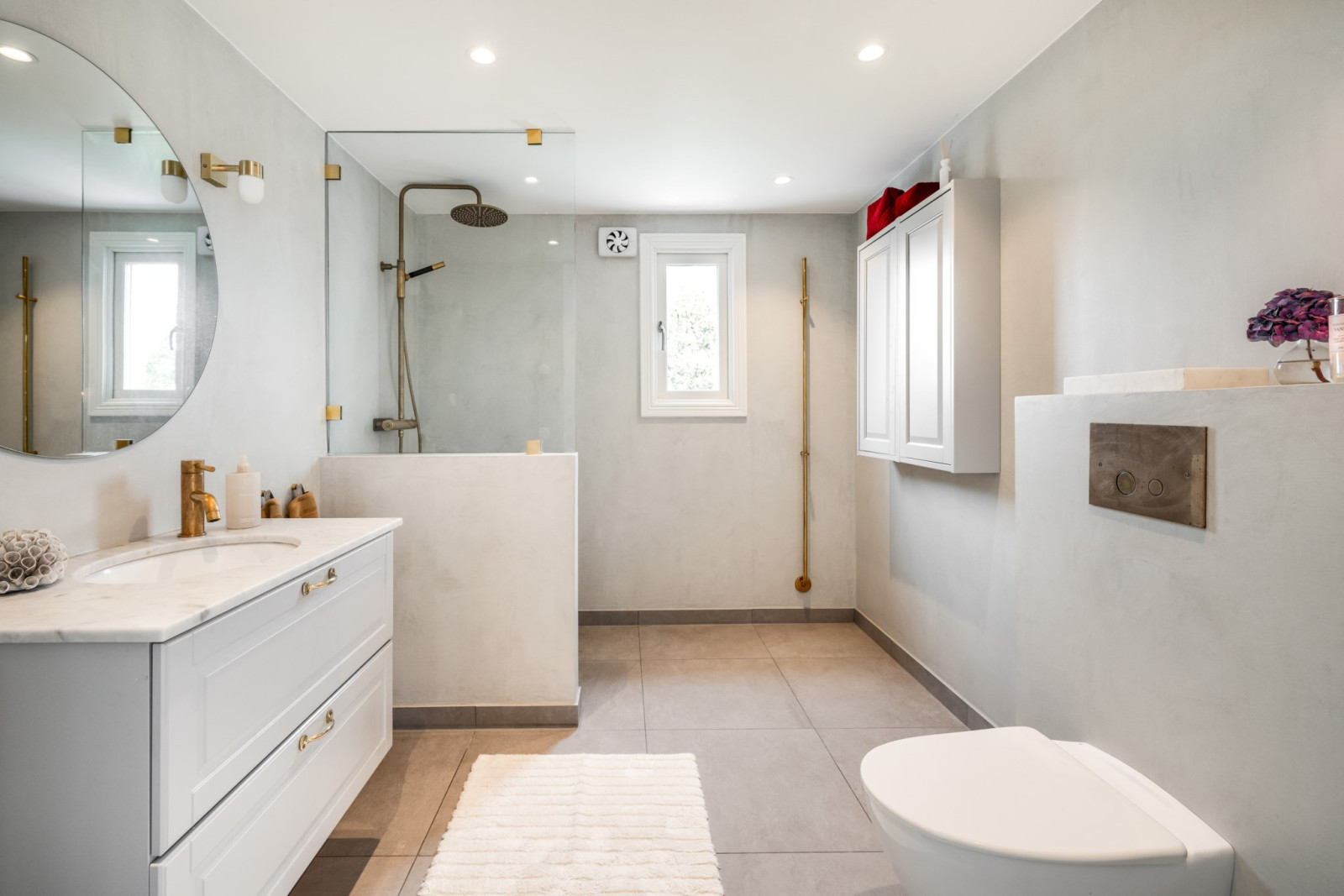 - Under 2020 renoverades även badrummet i microcement samt klinkergolv. Takdusch och blandare från Tapwell och även här ligger carraramarmor som bänkskiva på kommoden. Våtrumsintyg finns.