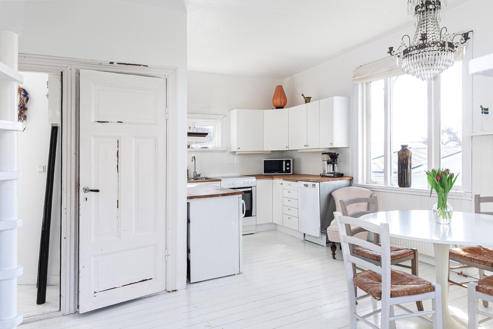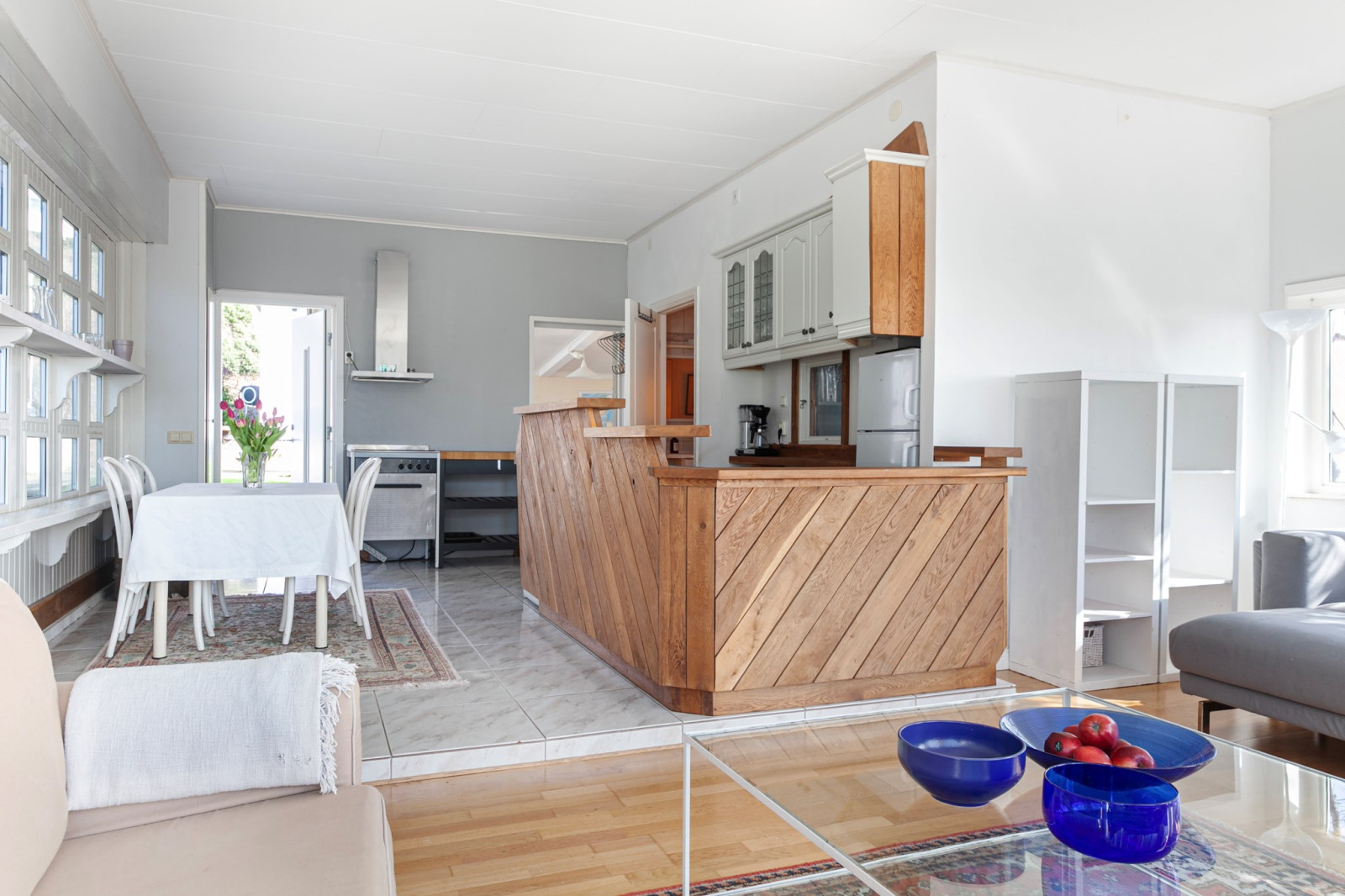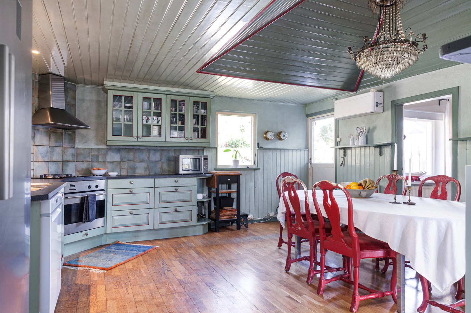 Ljus och trevlig köksyta öppen mot sällskapsytan. Spis, spisfläkt, kyl/frys, diskmaskin och tvättmaskin.