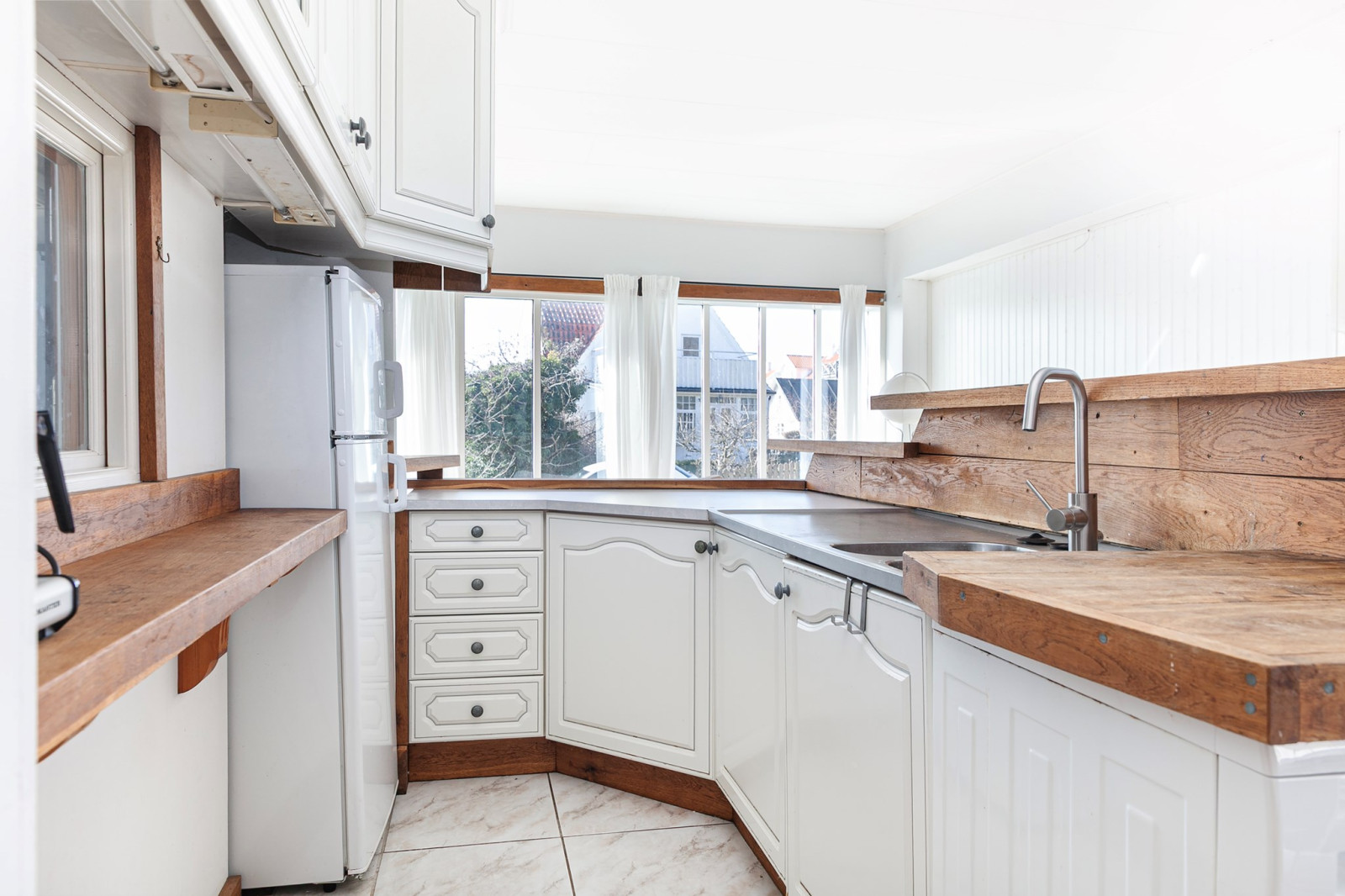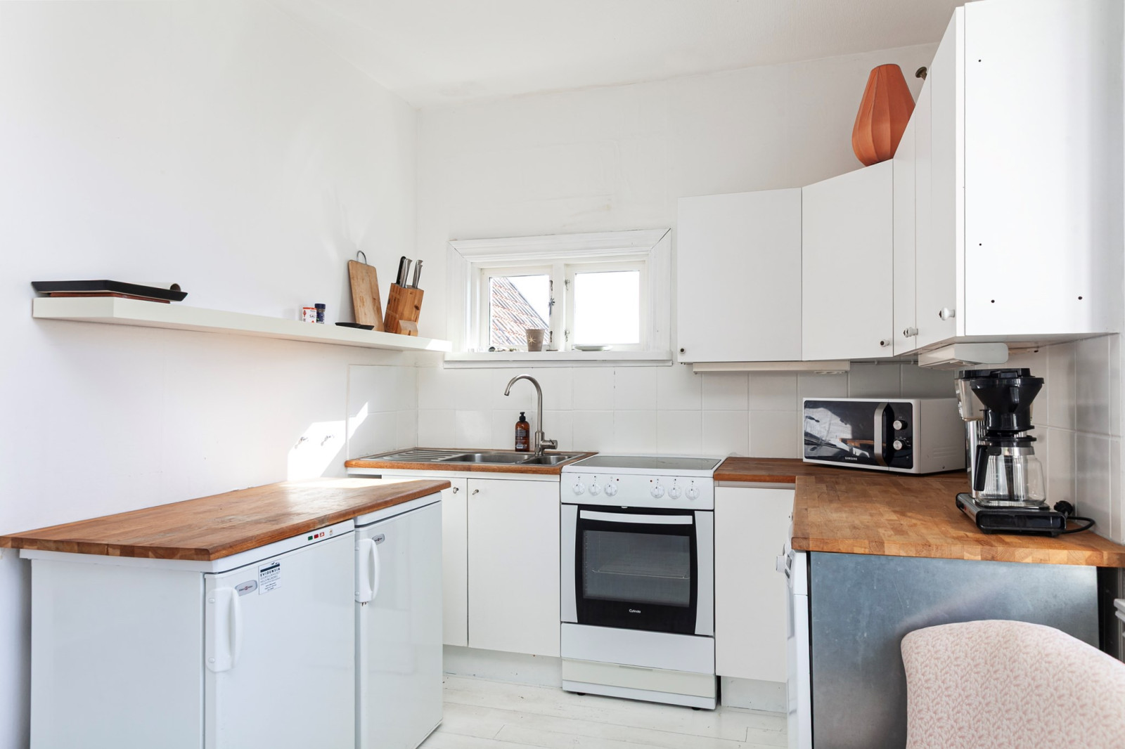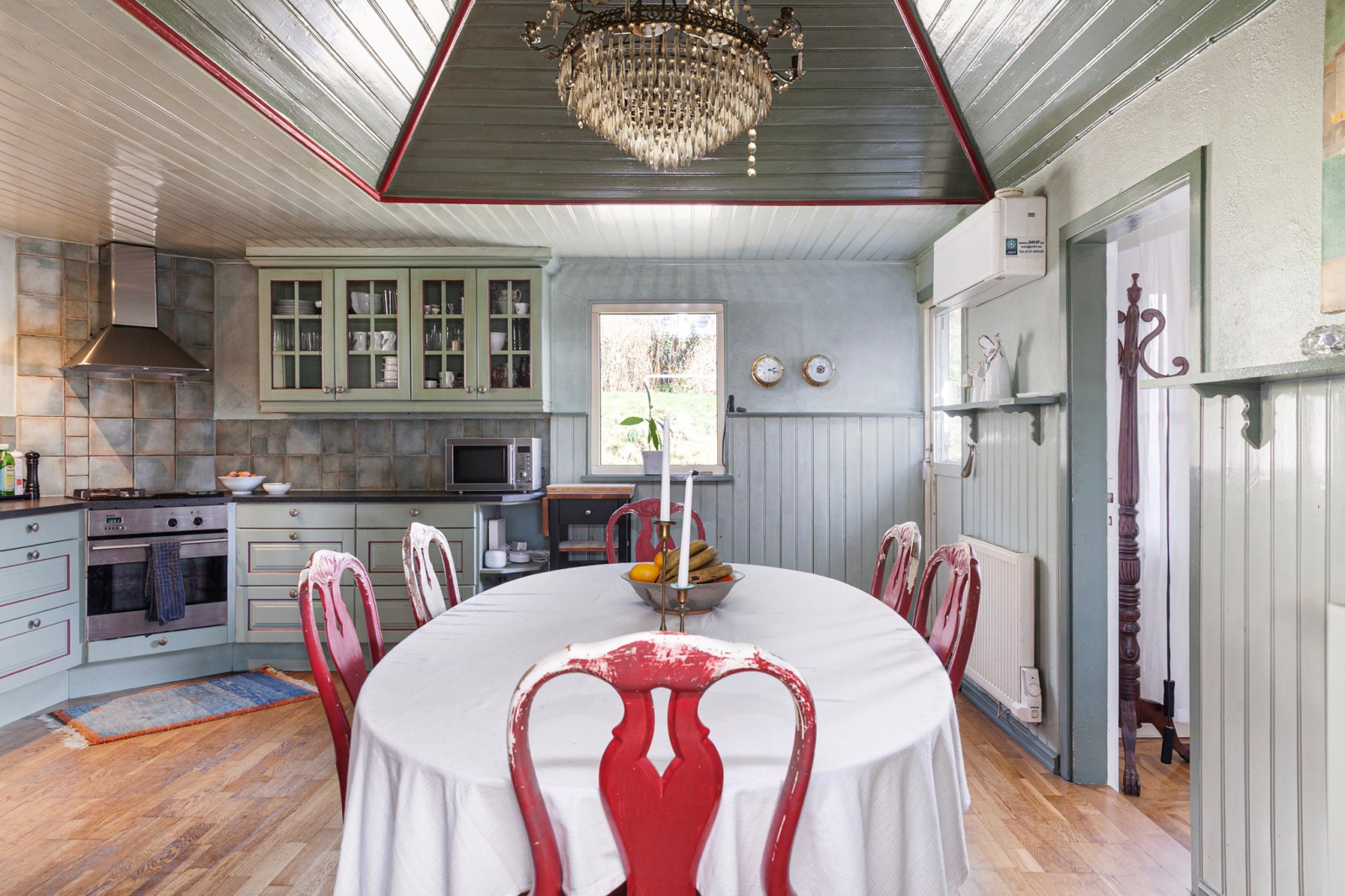 Ljus och trevlig köksyta öppen mot sällskapsytan. Spis, spisfläkt, kyl/frys, diskmaskin och tvättmaskin.