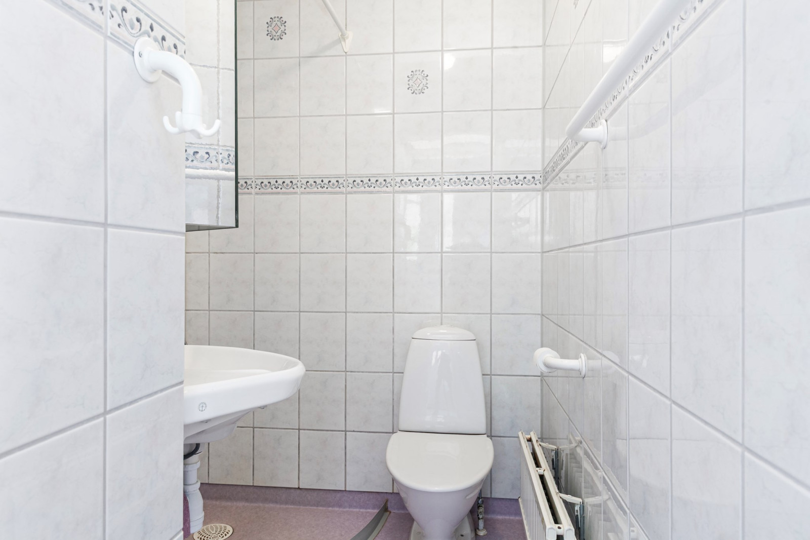 Kakelklädda väggar och plastmatta. Duschplats, wc och tvättställ.