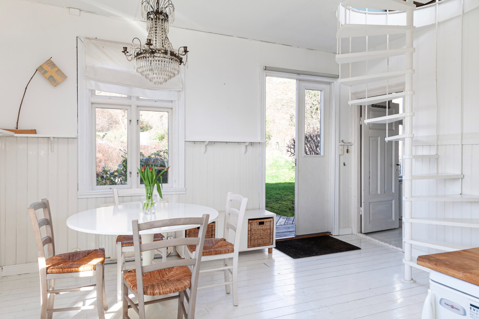 Trevligt kök med matplats och utgång till trädgården. Spis, spisfläkt, kyl, frys och diskmaskin.