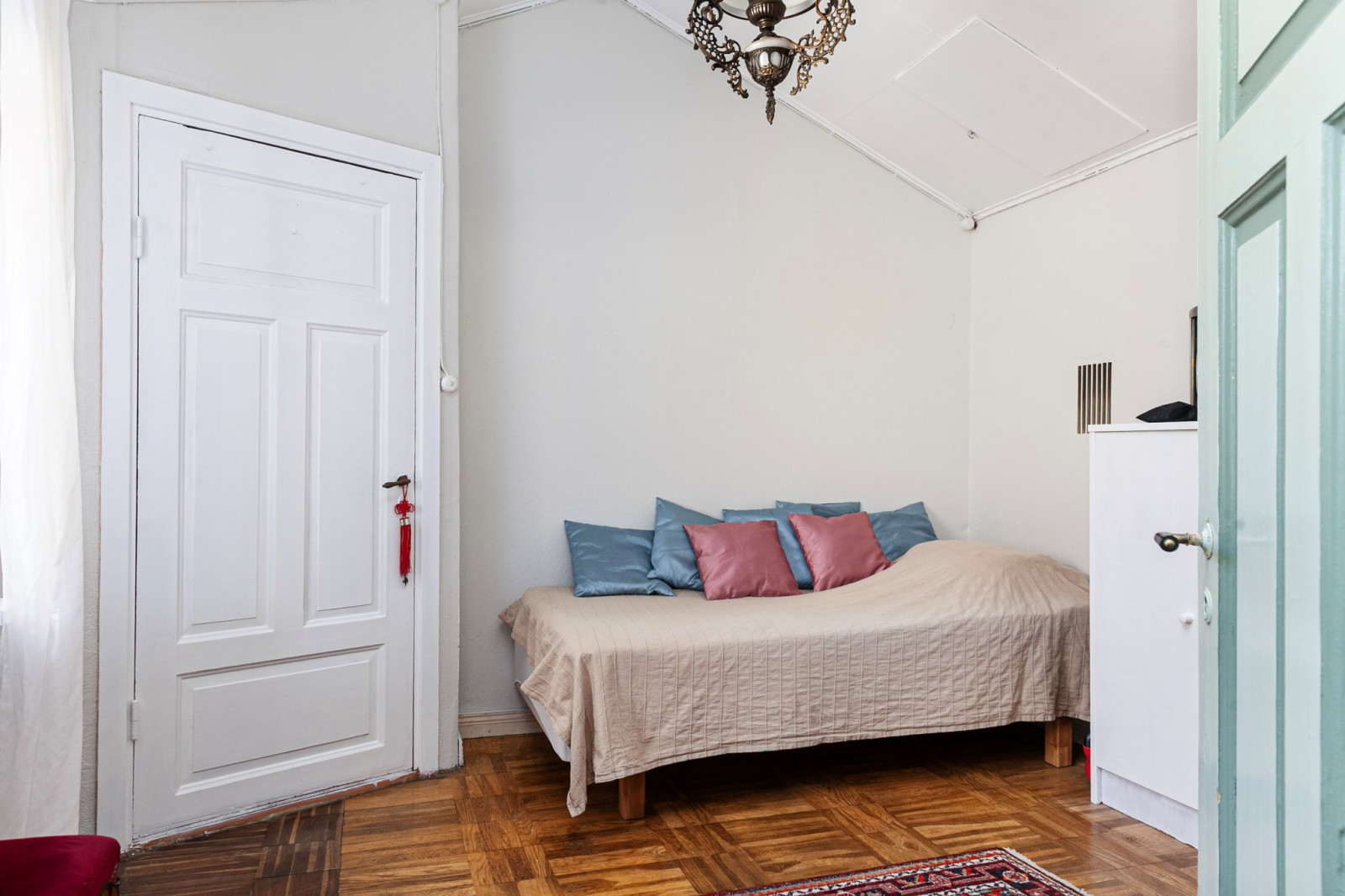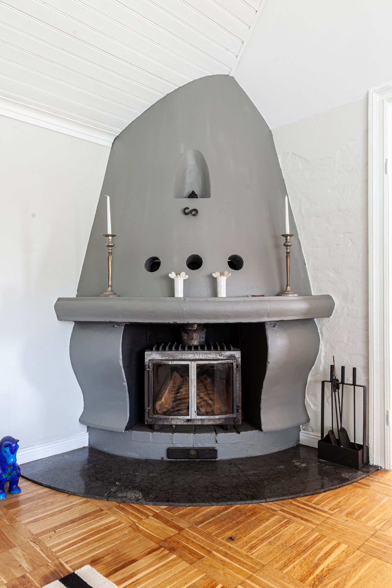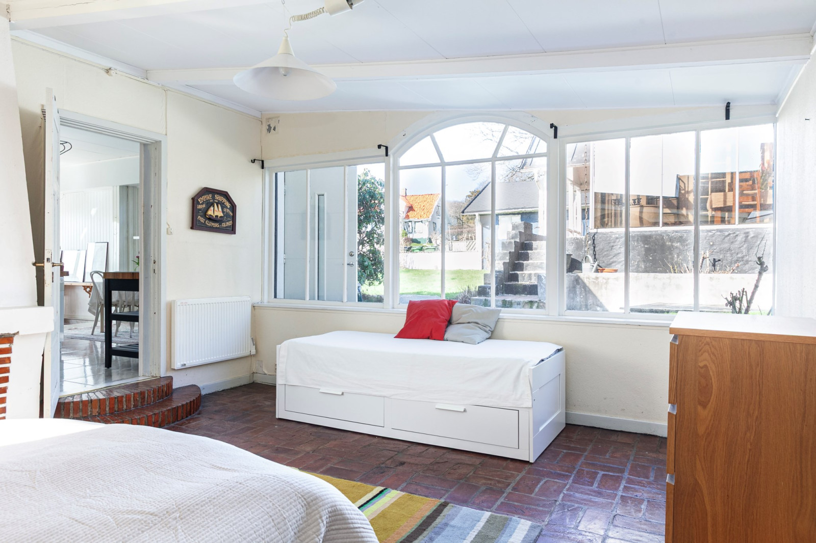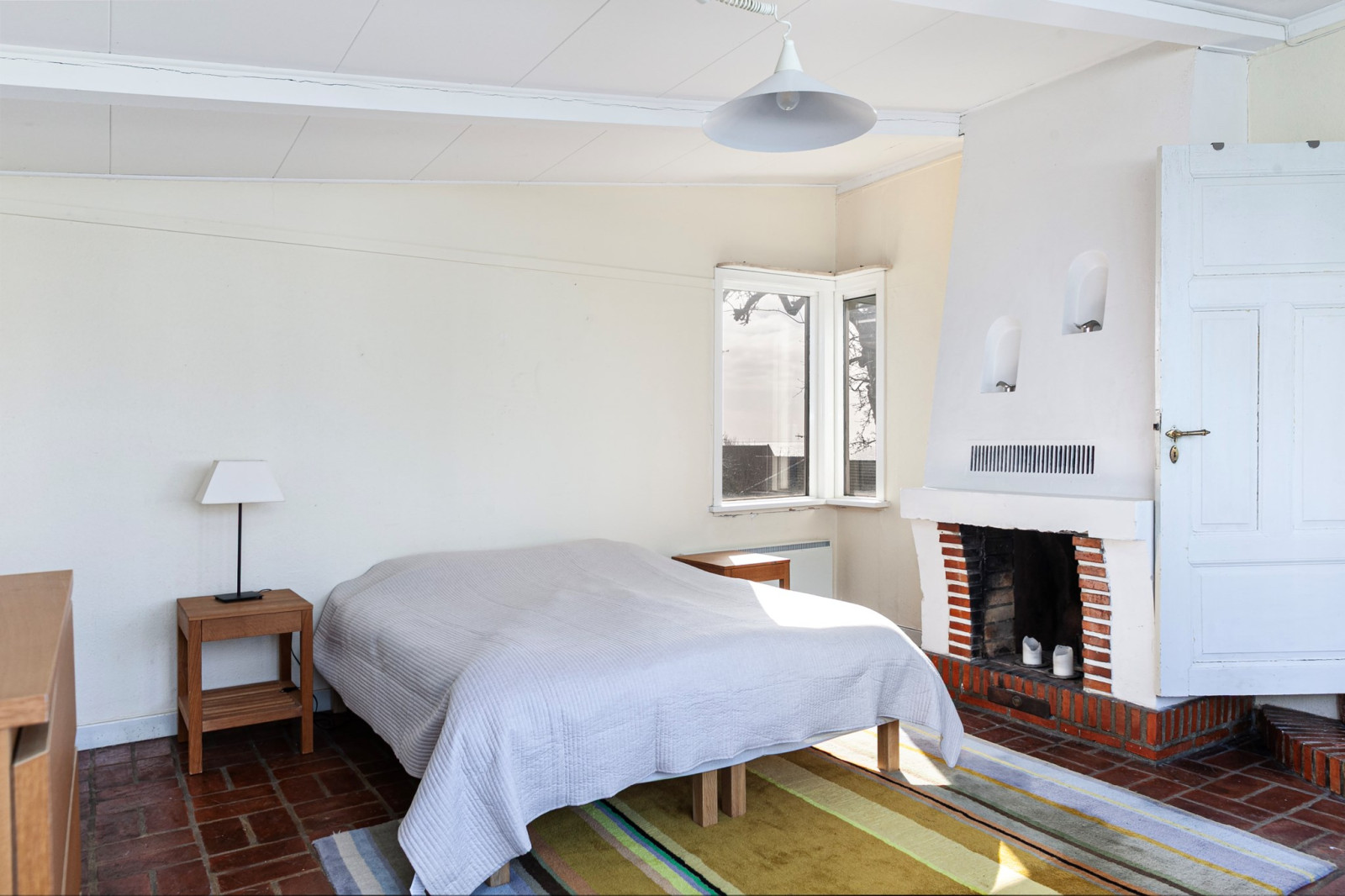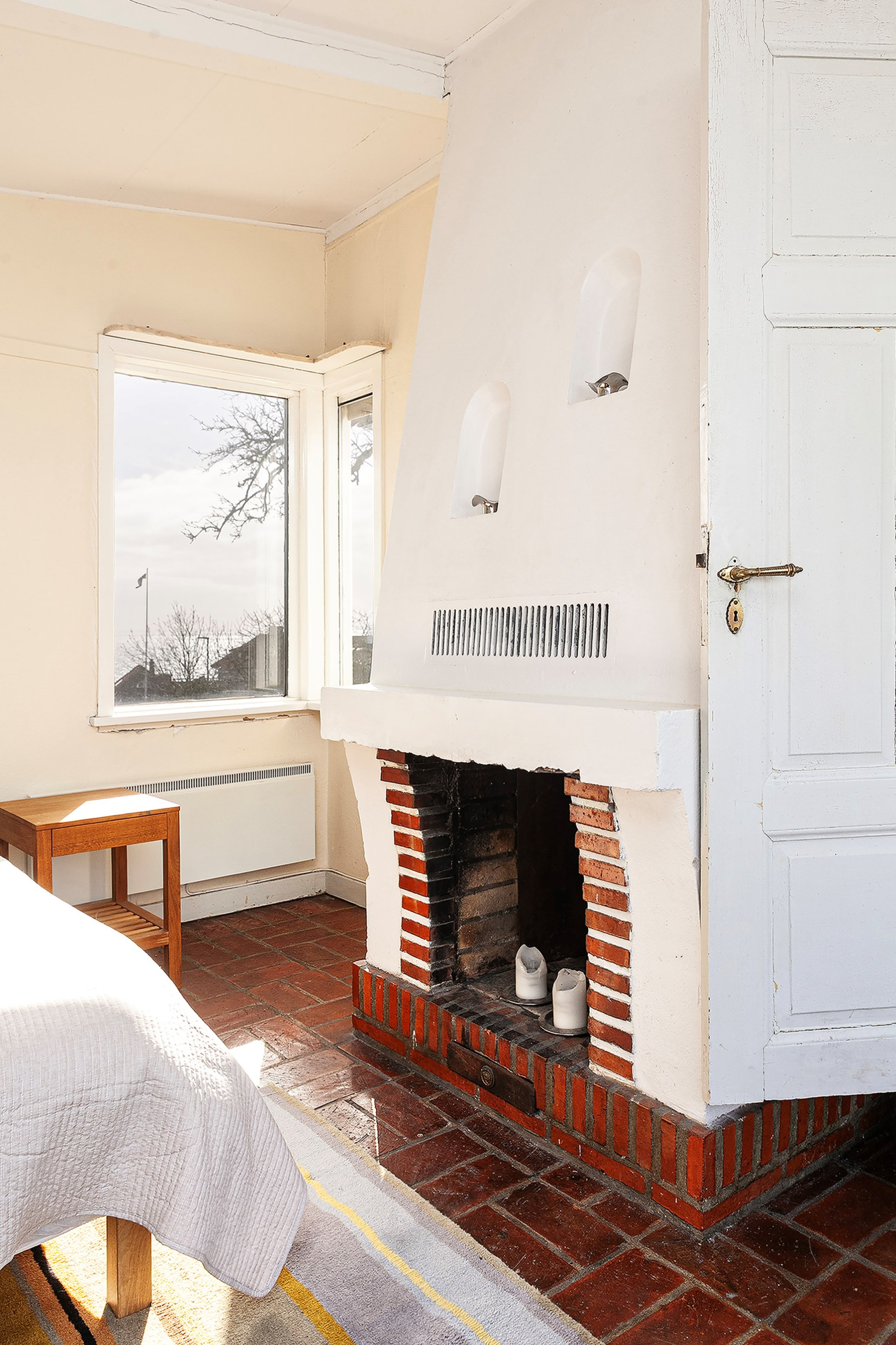 Mysigt all-/sovrum med handslaget tegelgolv och vacker eldstad (används ej idag).
