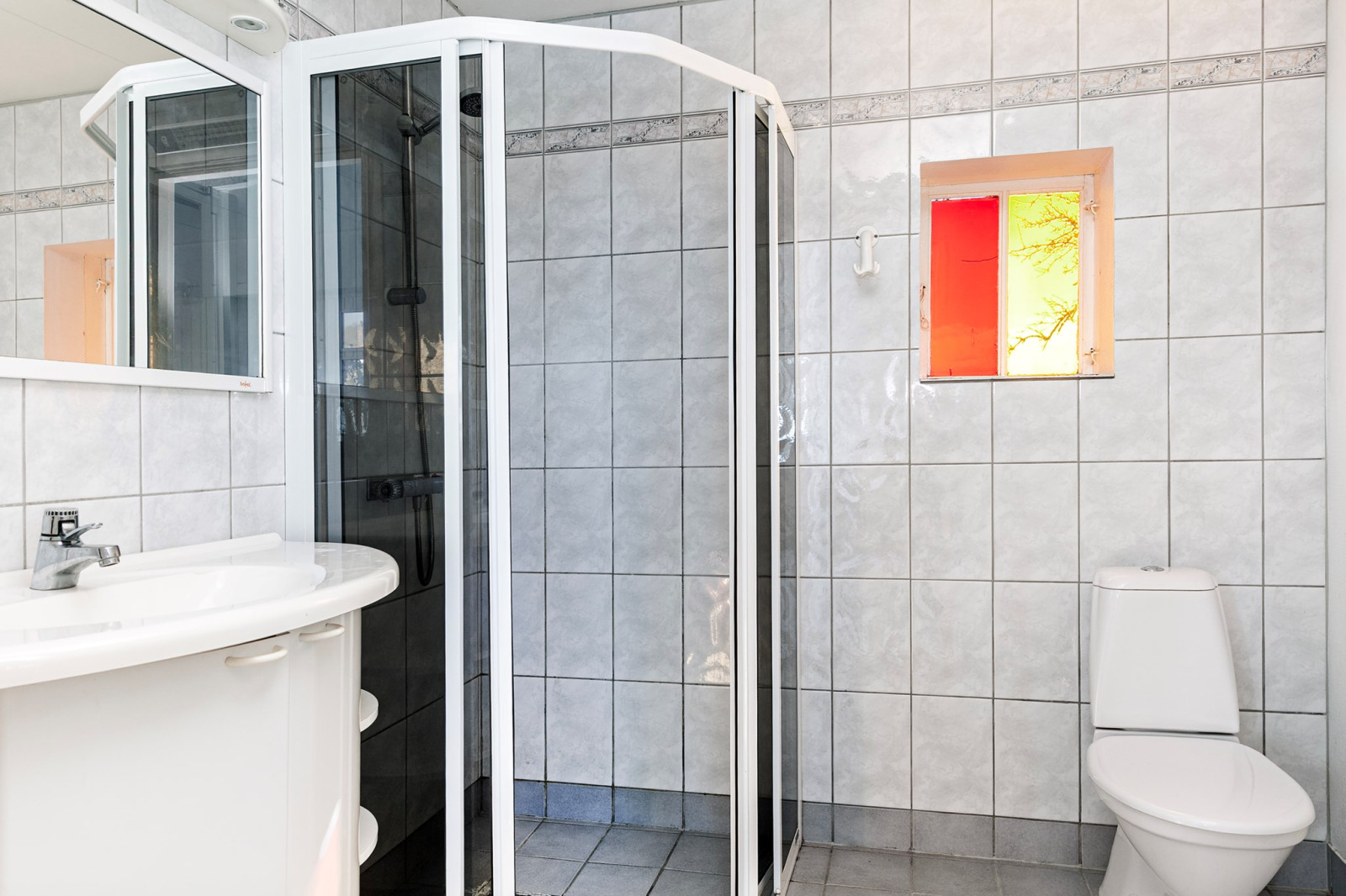 Helkaklat badrum med duschplats, wc och tvättställ.