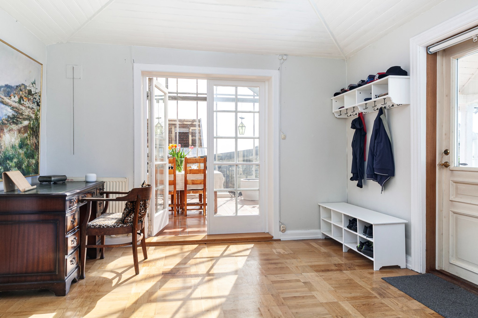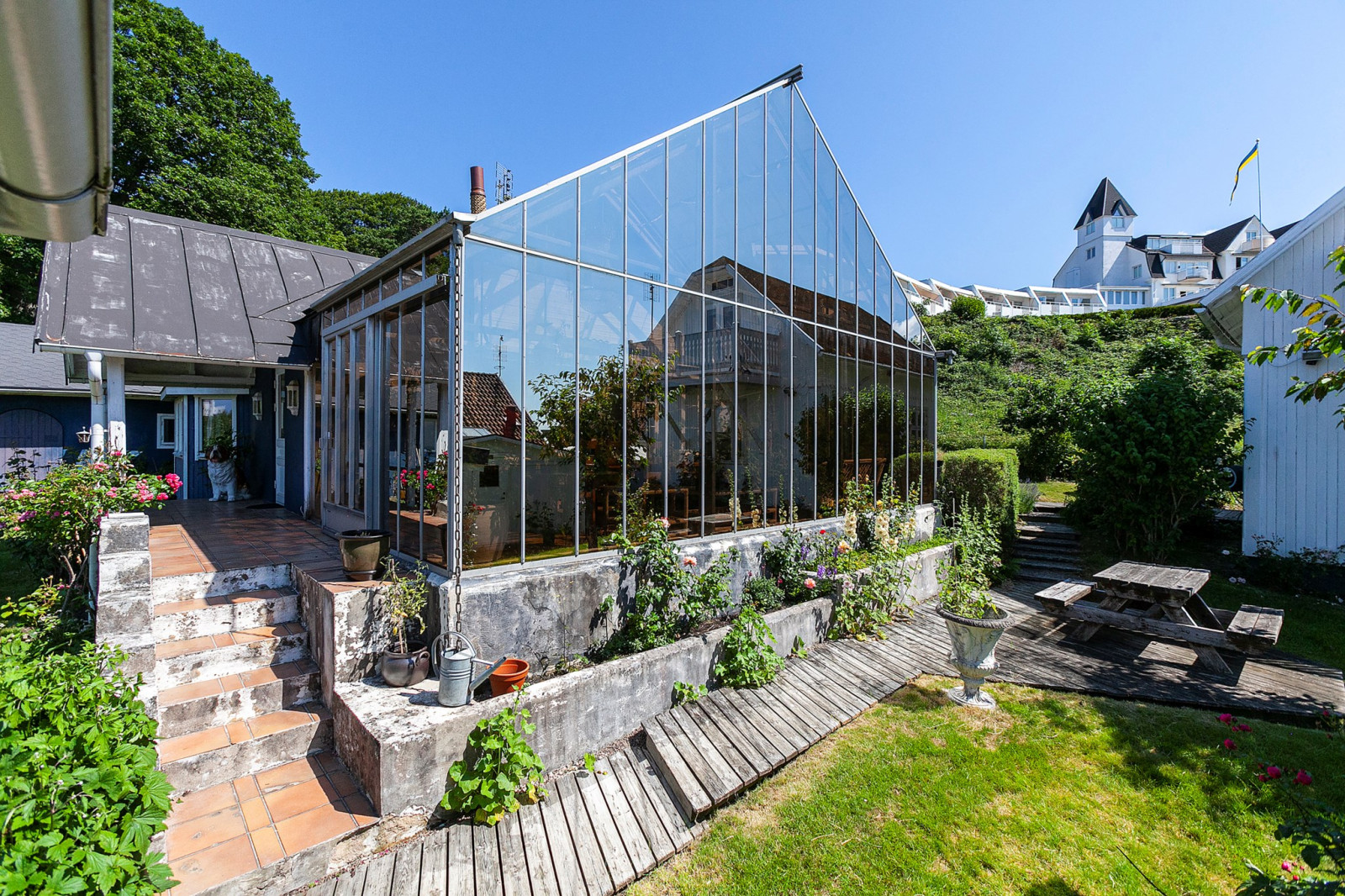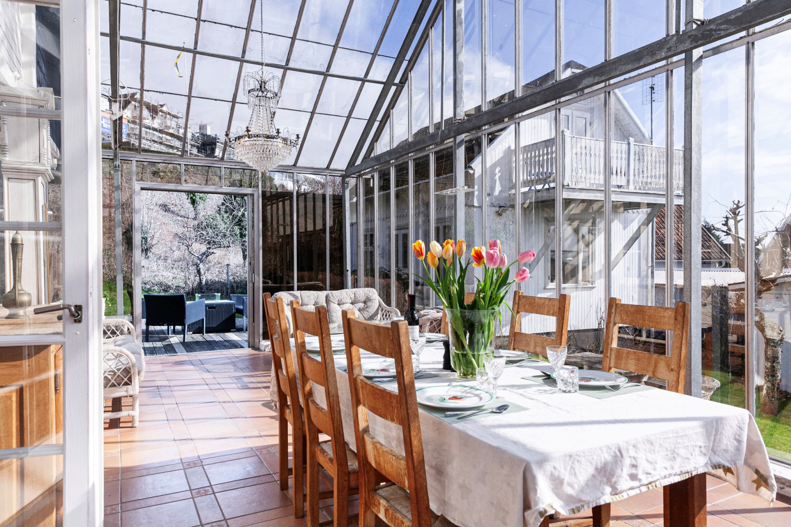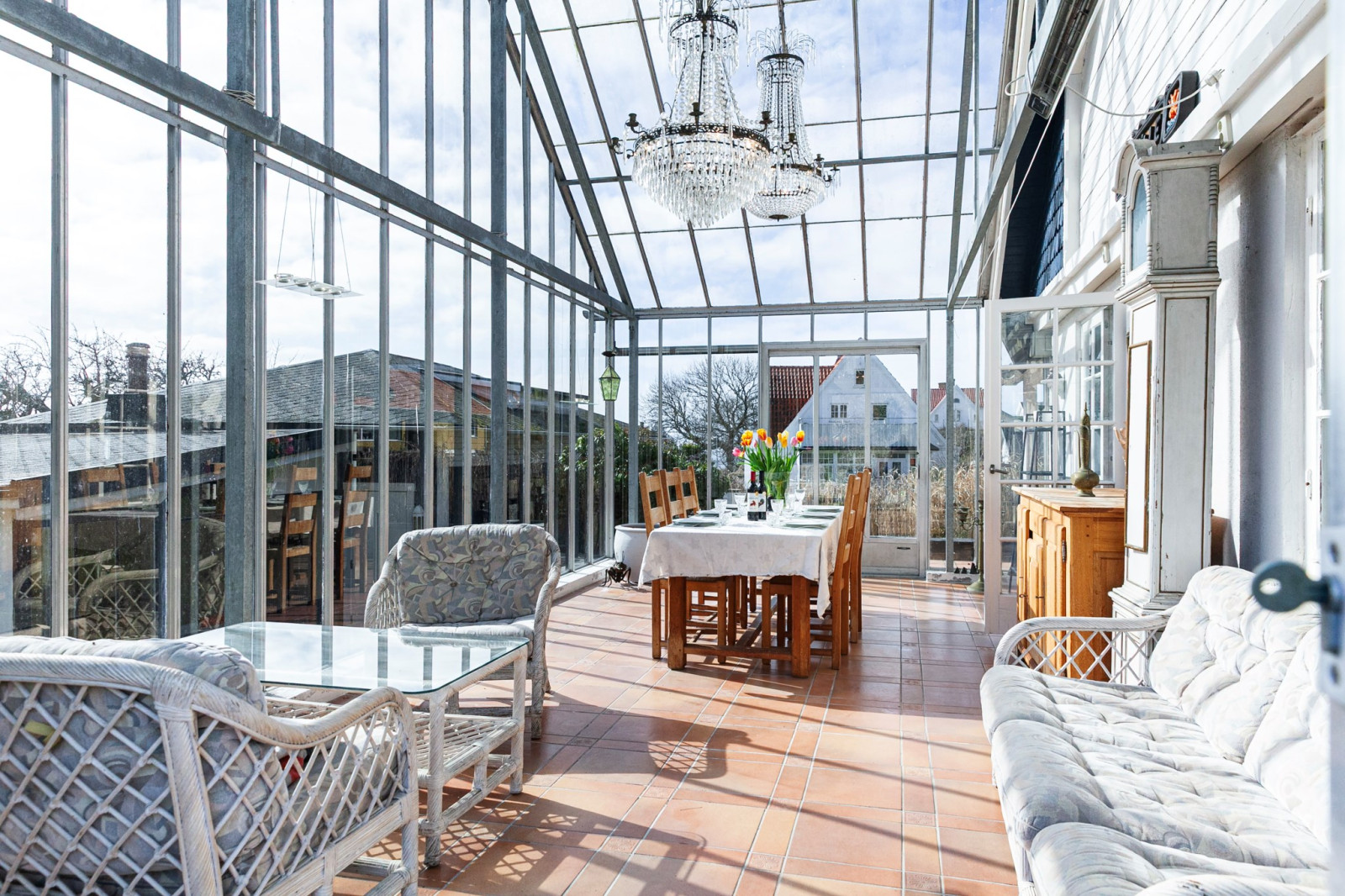 Underbart orangeri med vackert klinkergolv och skjutpartier mot trädgården.
