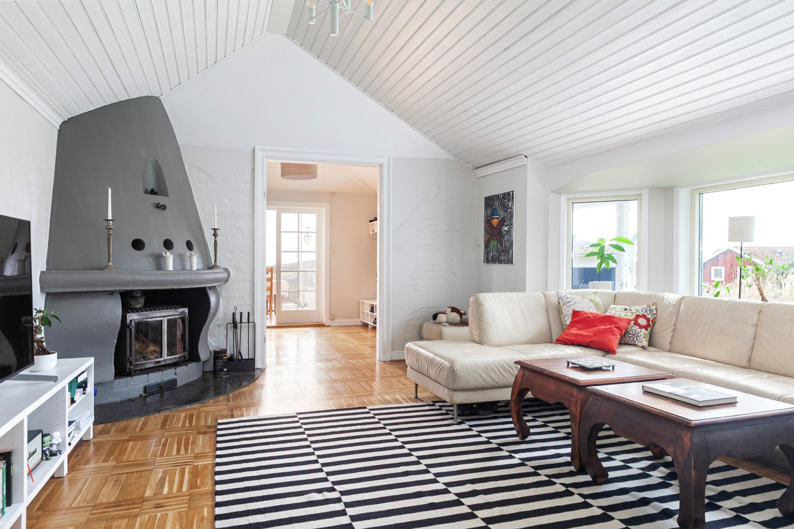 Ljust, rymligt vardagsrum med trevlig eldstad.