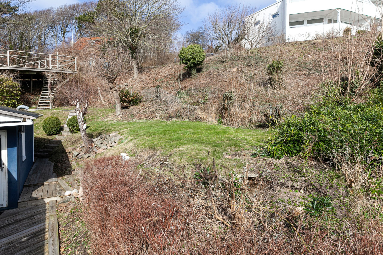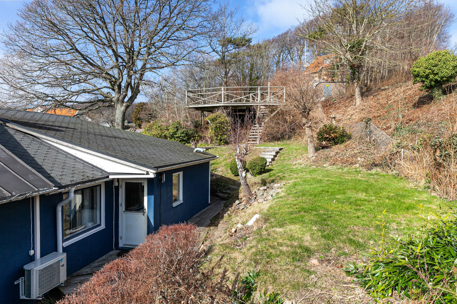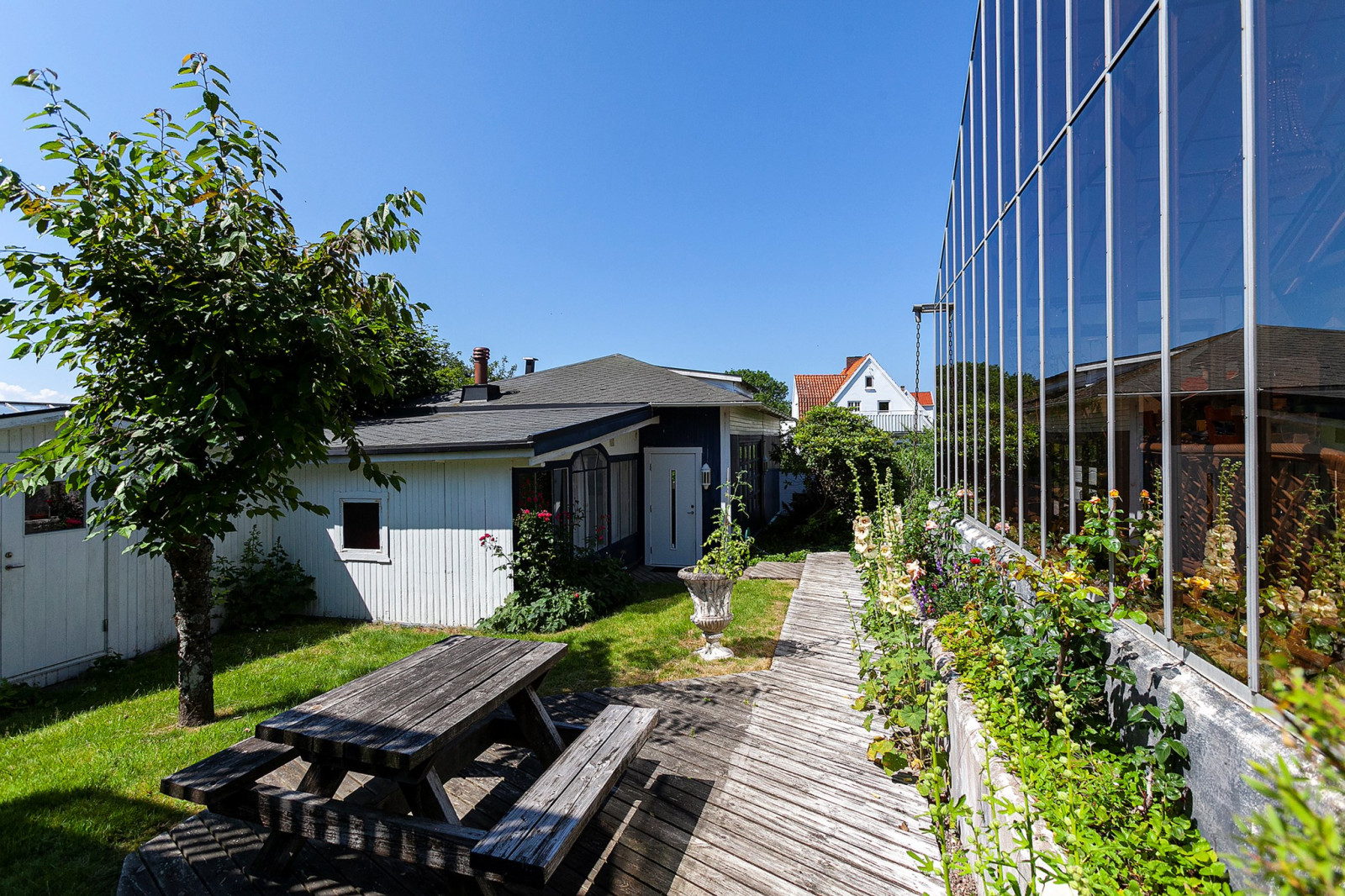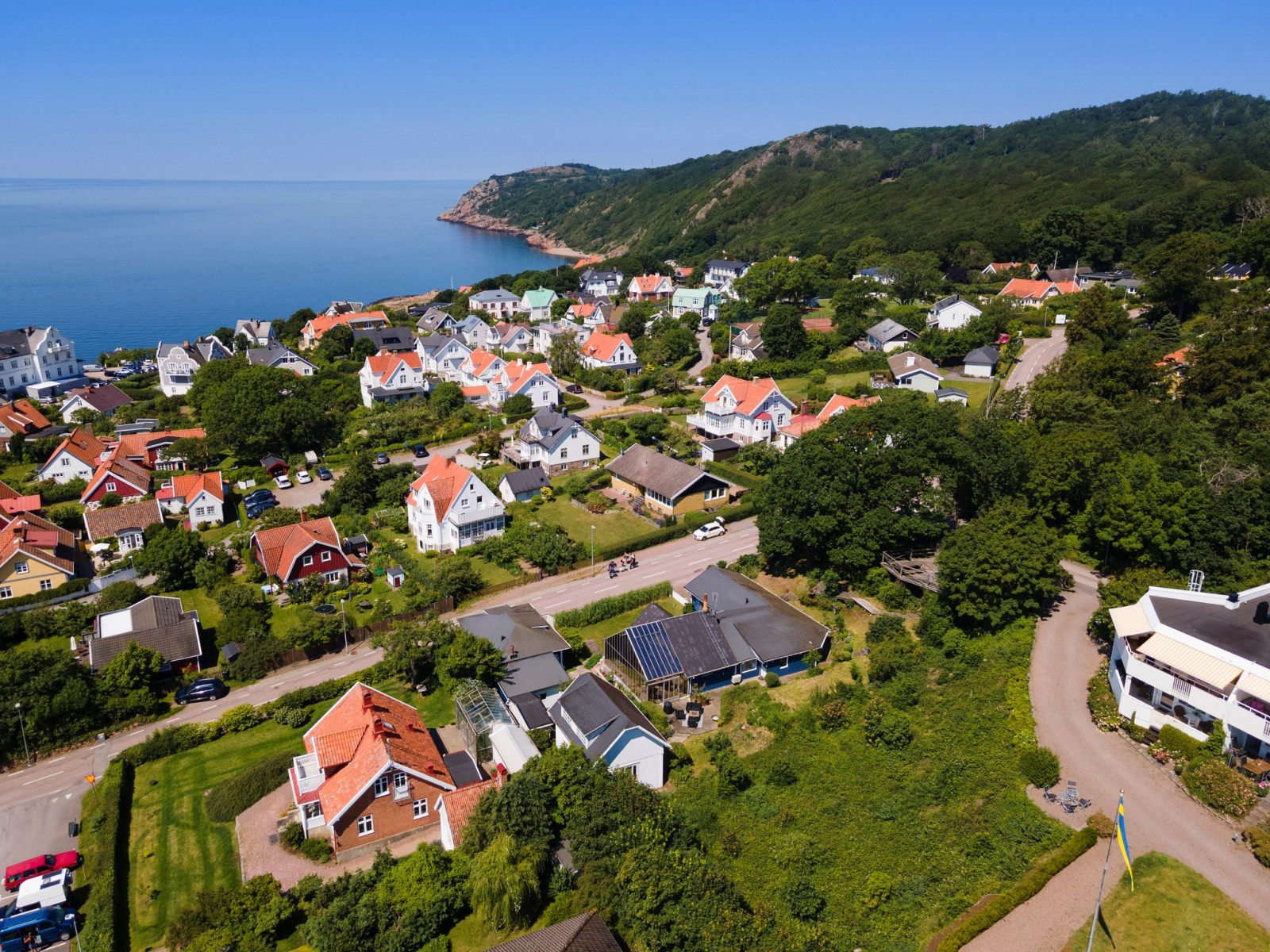 Tomten är lummig och rogivande med vacker havsutsikt som skapar en harmonisk inramning året om. Här bor du med trevligt läge, en kort promenadavstånd till tennisbanor, den charmiga hamnen, salta bad och Kullabergs mäktiga natur med vandring, klättring, golf och natursköna upplevelser.