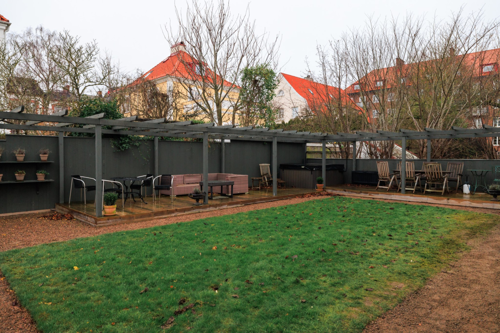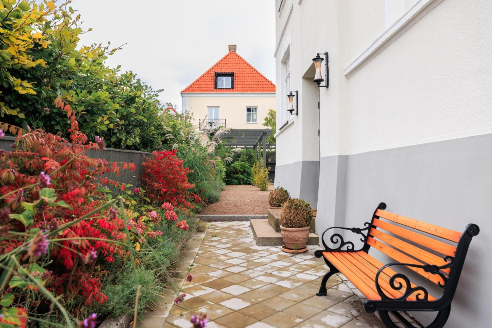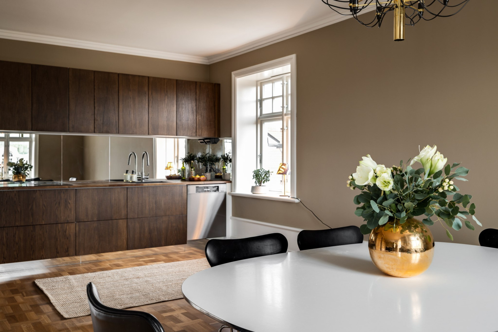 Ekparkett, stuckatur, pentry och utgång till trädgård.