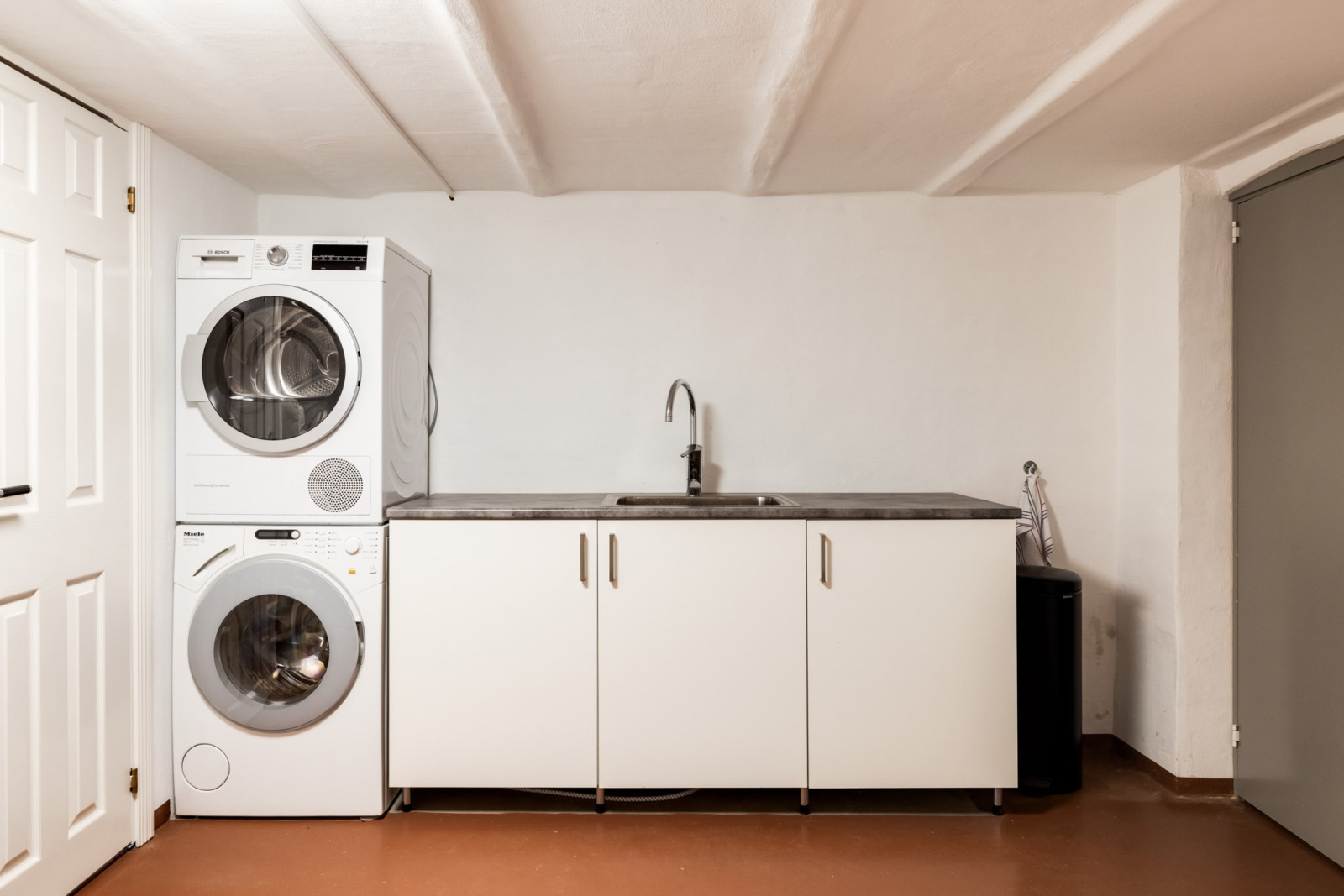 Målad betonggolv samt vitmålade och putsade väggar. Tvättmaskin, torktumlare, arbetsbänk och vask. Toalett.