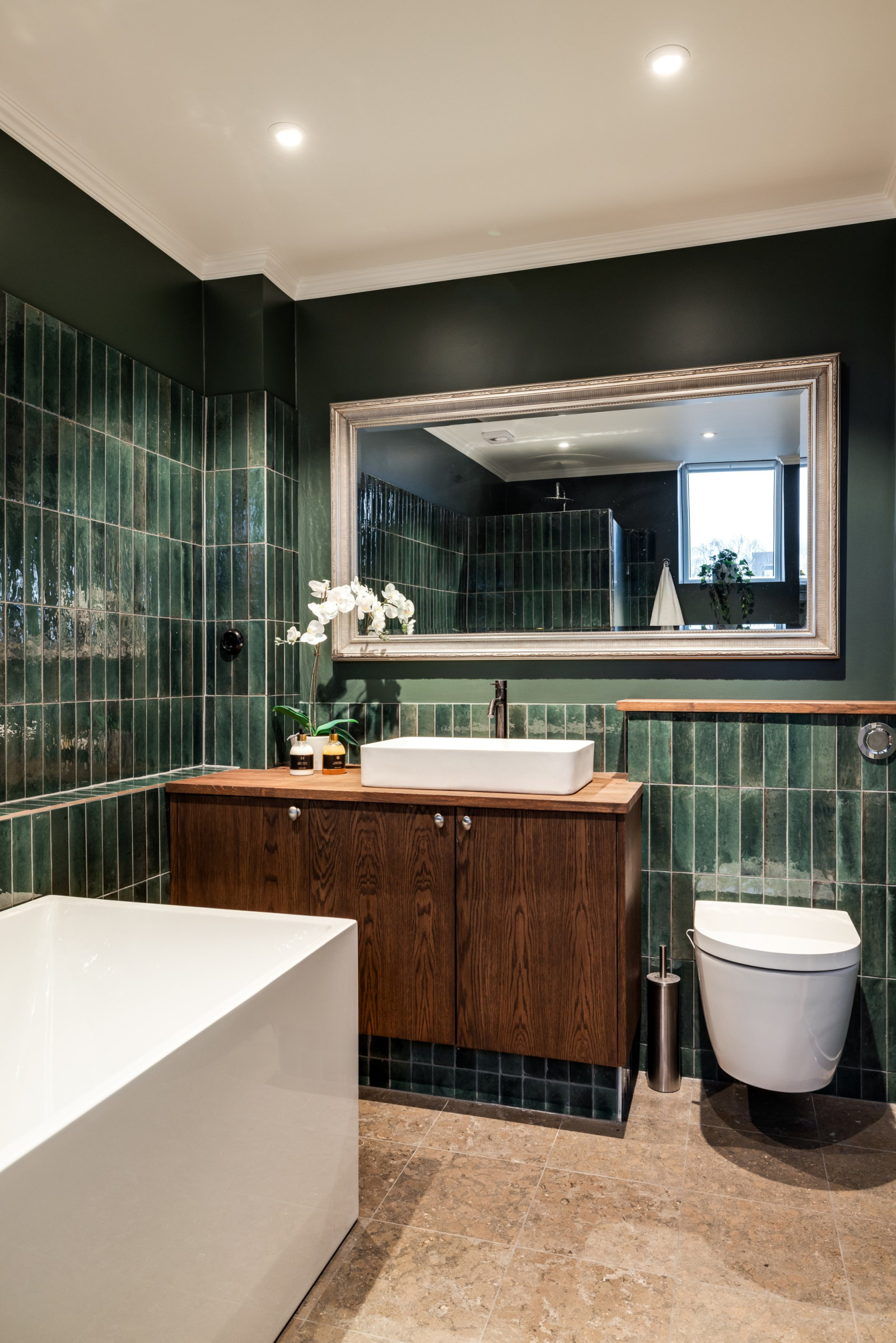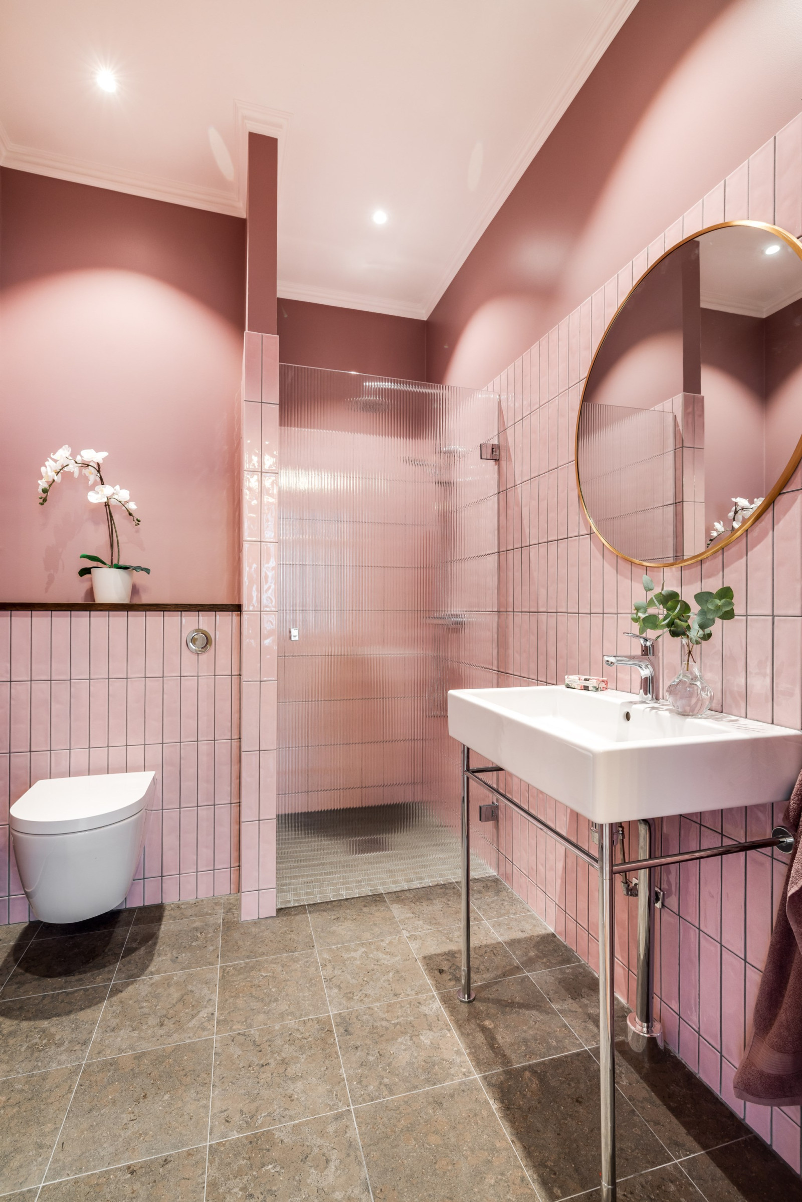 Kakel, klinker, dusch, handfat, toalett samt spotlights i tak.