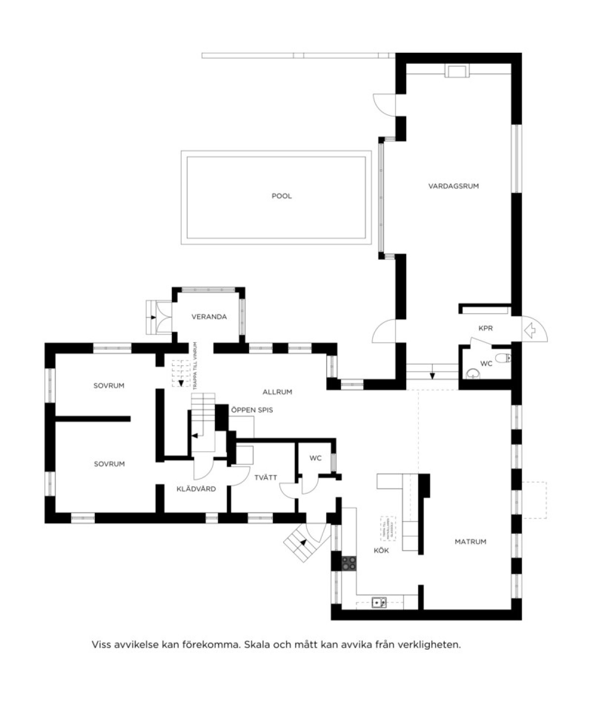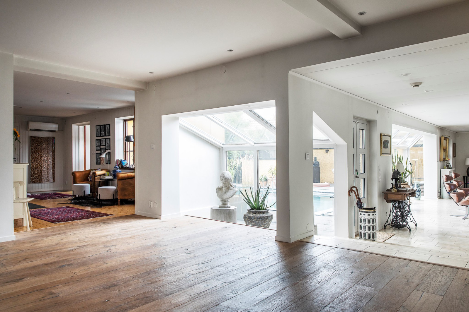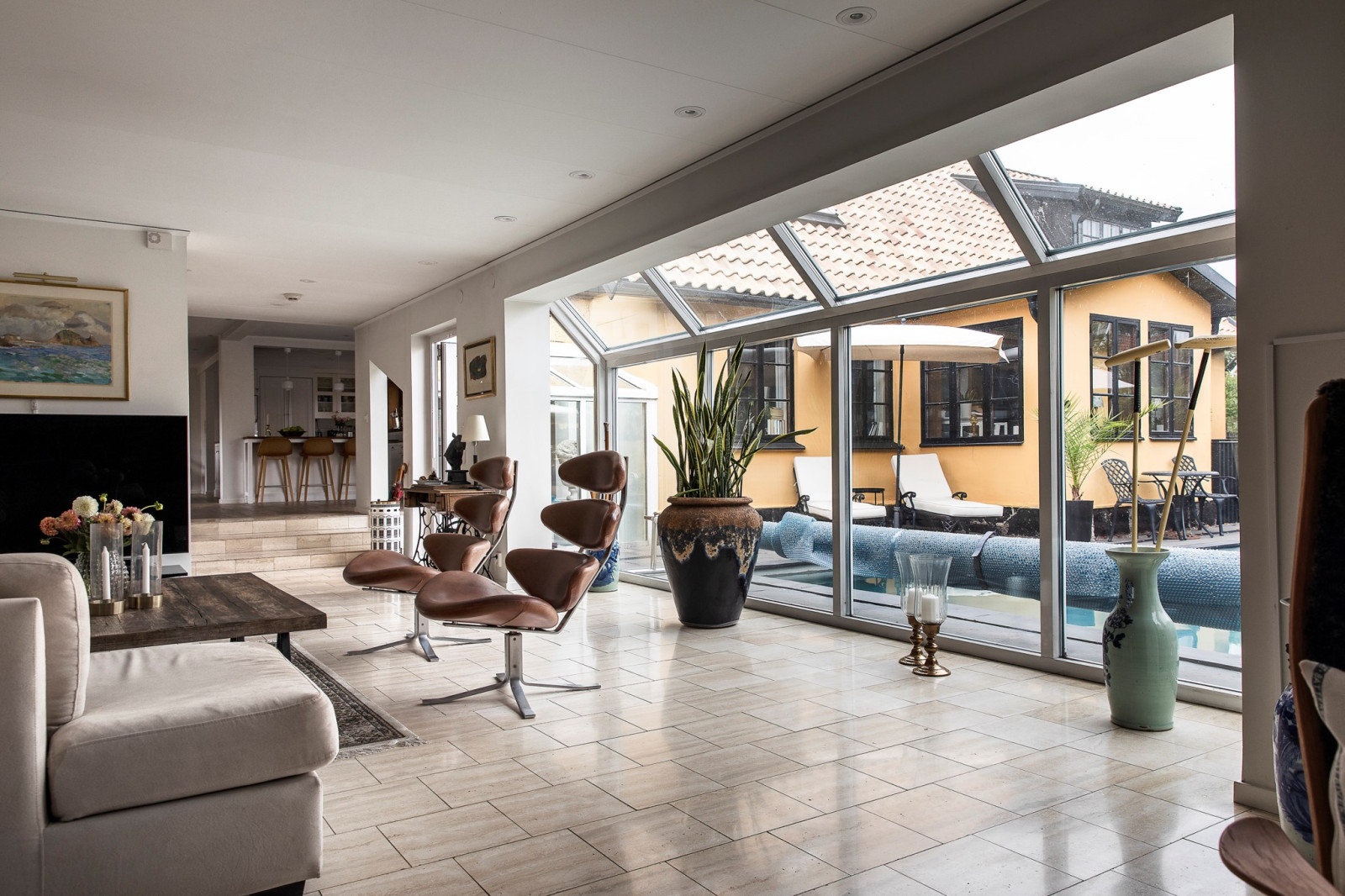 Vardagsrummet imponerar med sina generösa ytor och sin luftiga känsla. De stora fönsterpartierna släpper in rikligt med ljus och bjuder på vacker utsikt över det inbjudande poolområdet. Här finns gott om plats för stora möblemang och möjlighet att skapa flera olika zoner – oavsett om du vill ha en avslappnad loungedel, plats för läsning eller sociala sammankomster.
