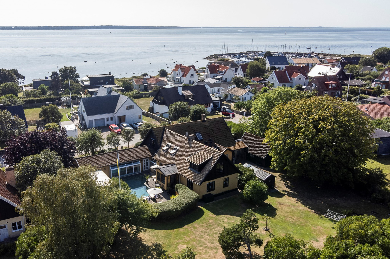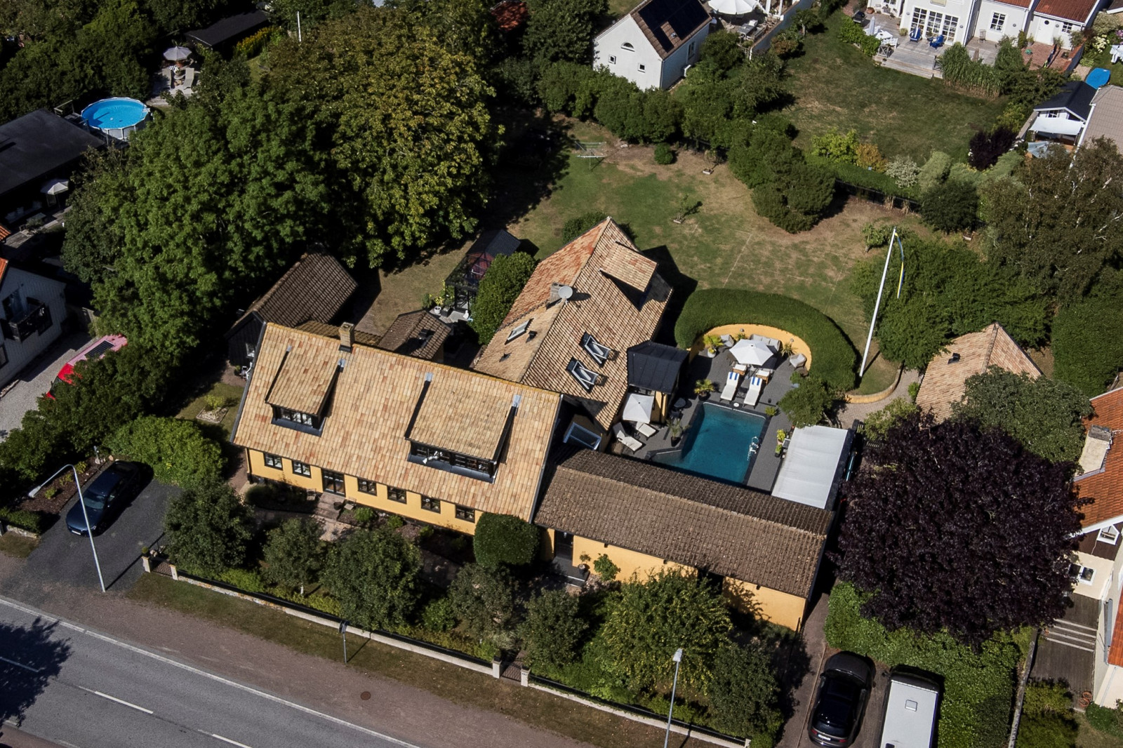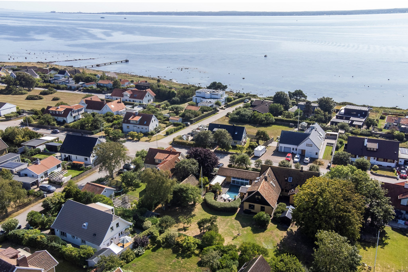 Vardagsrummet imponerar med sina generösa ytor och sin luftiga känsla. De stora fönsterpartierna släpper in rikligt med ljus och bjuder på vacker utsikt över det inbjudande poolområdet. Här finns gott om plats för stora möblemang och möjlighet att skapa flera olika zoner – oavsett om du vill ha en avslappnad loungedel, plats för läsning eller sociala sammankomster.