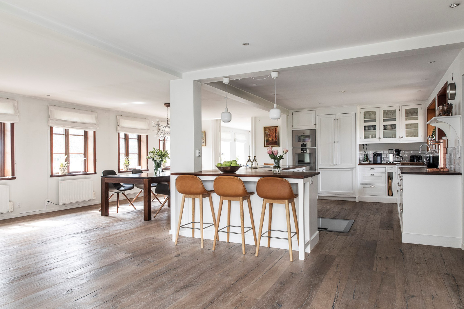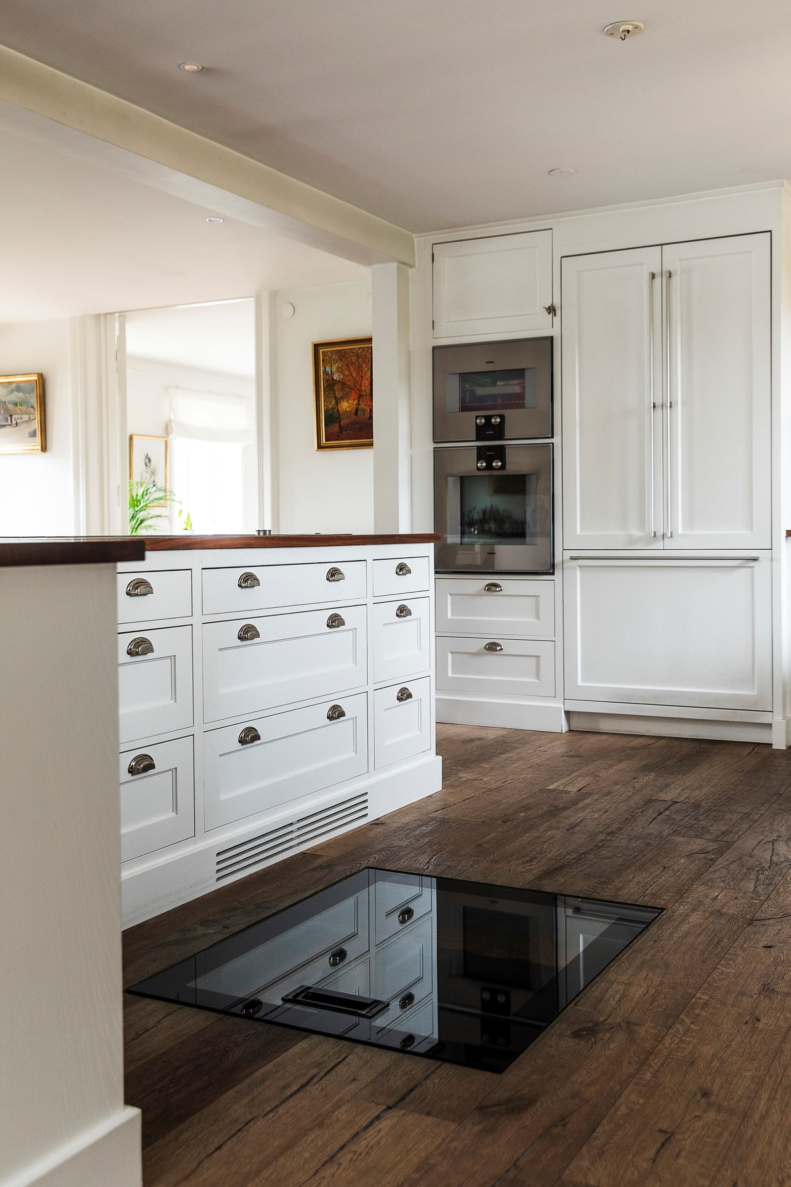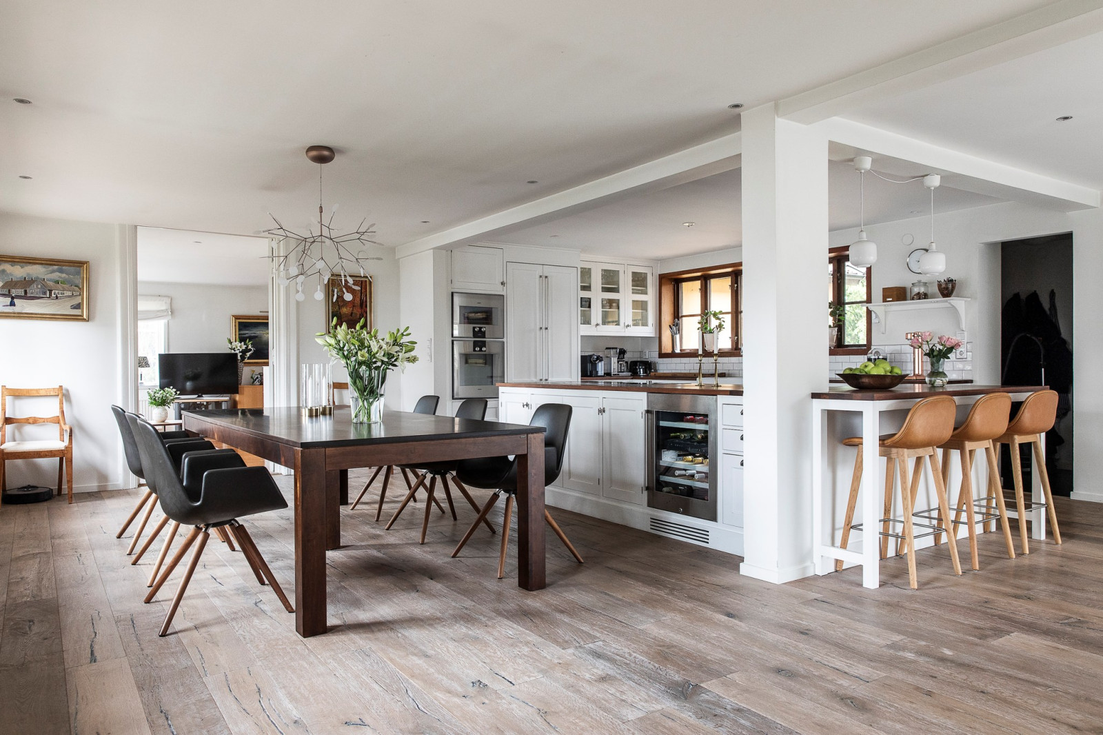 Hemmets hjärta är det stora, inbjudande köket från Kvänum – ett kök som kombinerar klassisk elegans med modern funktionalitet. Här finns gott om arbetsyta tack vare en generös köksö, samt plats för ett stort matbord där hela familjen får plats. Köket har fin utsikt mot baksidan och erbjuder en härlig kontakt med sällskapsytorna, vilket skapar ett socialt flöde mellan matlagning, måltider och umgänge. Den exklusiva maskinparken är noggrant utvald för att möta höga krav på både design och prestanda – ett kök att trivas i varje dag.