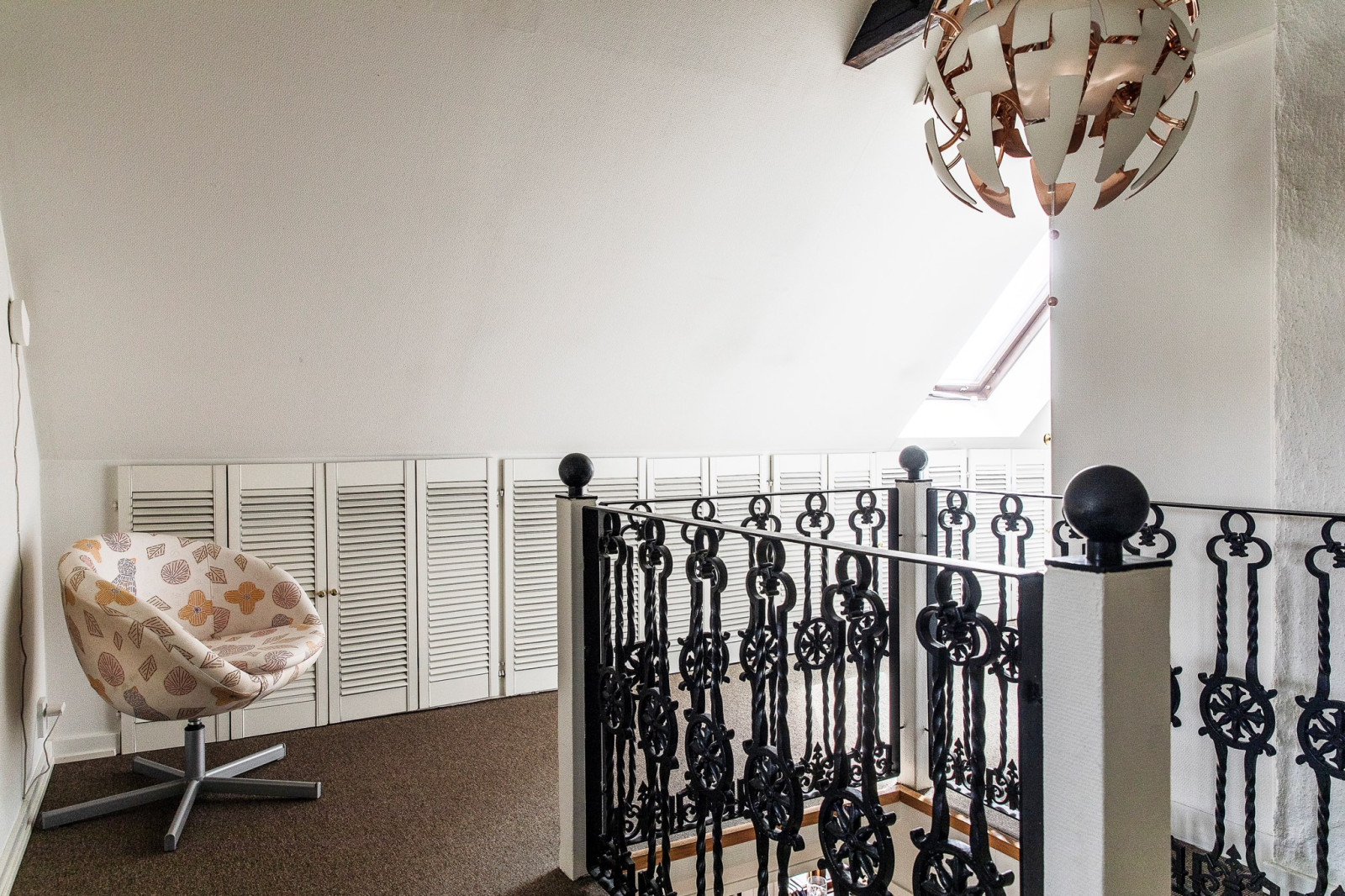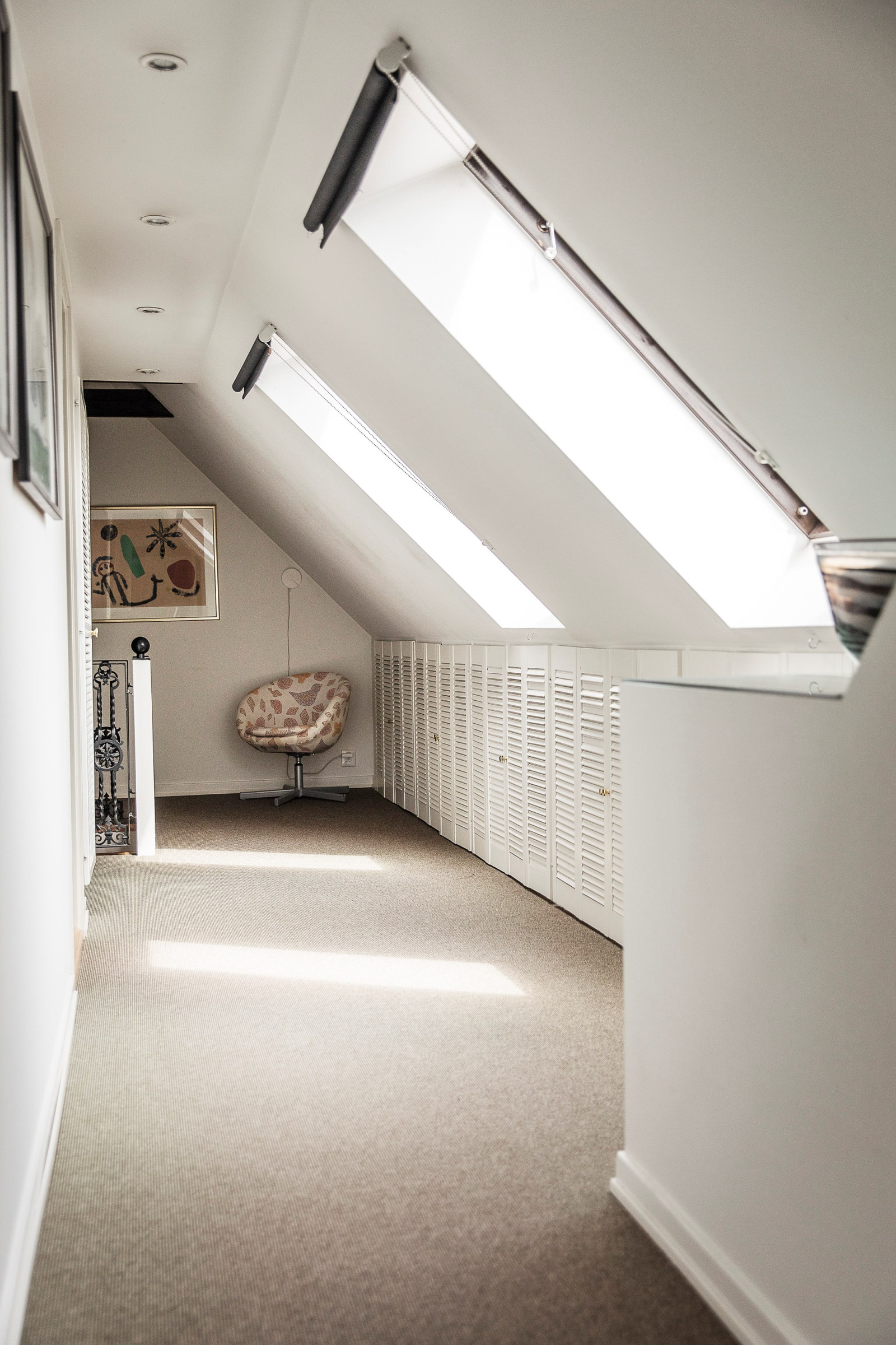På övre plan möts du av en ljus och rymlig hall som fungerar som nav för husets privata delar. Hallen ger smidig tillgång till sovrum och badrum, samtidigt som den erbjuder plats för förvaring eller en liten mysig läshörna. Här skapas en luftig och välkomnande känsla som binder samman övervåningens rum på ett harmoniskt sätt.