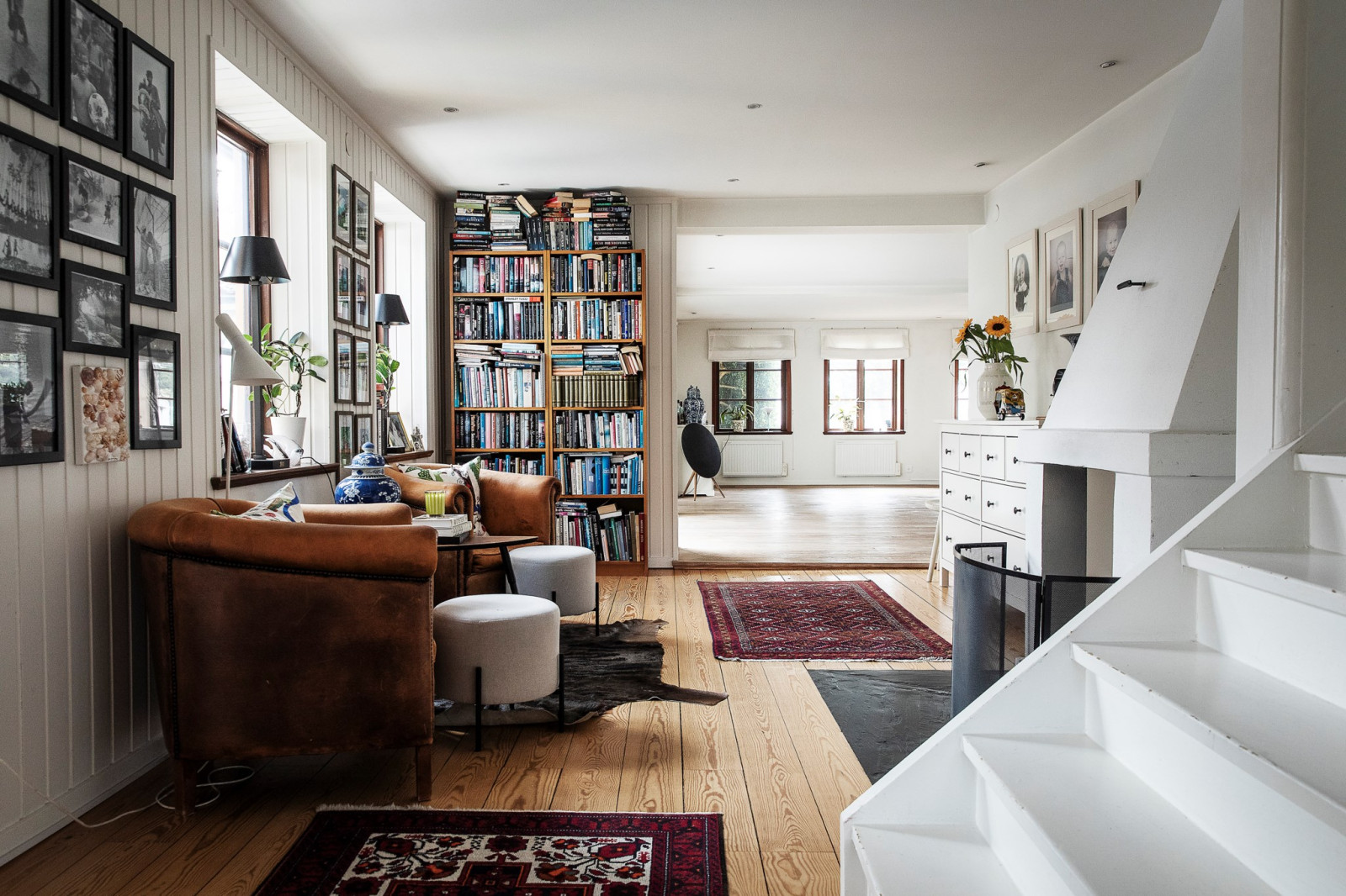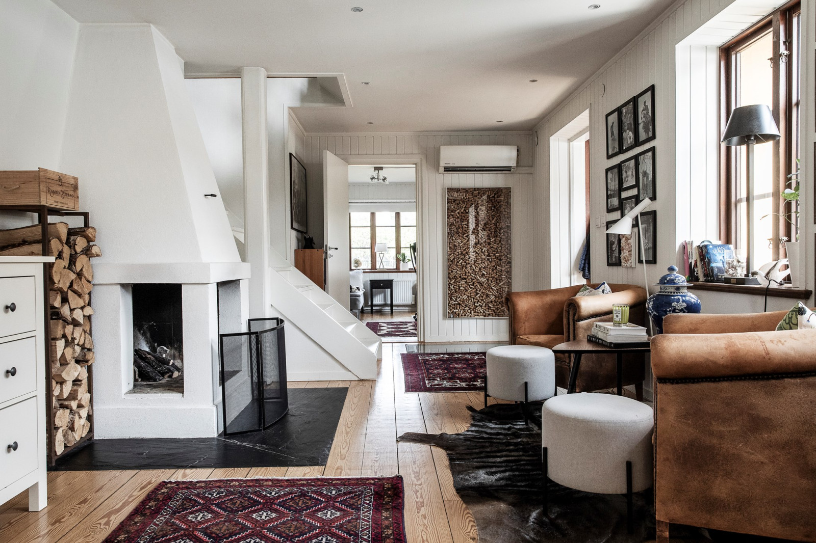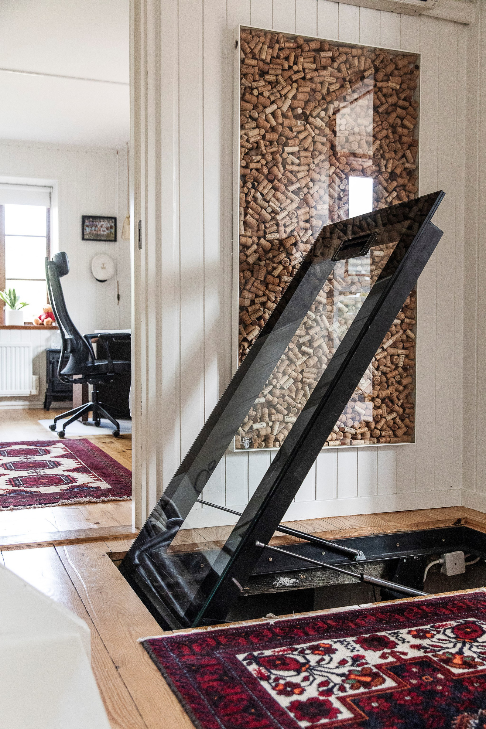 I en vinkel, strax innan husets mer privata delar, ligger ett mindre allrum som bjuder på en varm och inbjudande atmosfär. Den öppna spisen skapar en intim och ombonad känsla – perfekt för lugna kvällar eller en kopp te i stillhet. Här har man även byggt in en specialdesignad lucka i golvet som leder ner till husets vinförråd i källaren – en diskret och elegant lösning som verkligen sätter guldkant på tillvaron.
