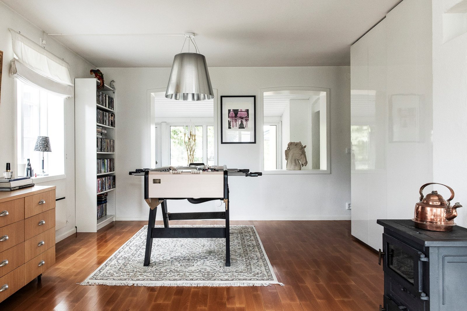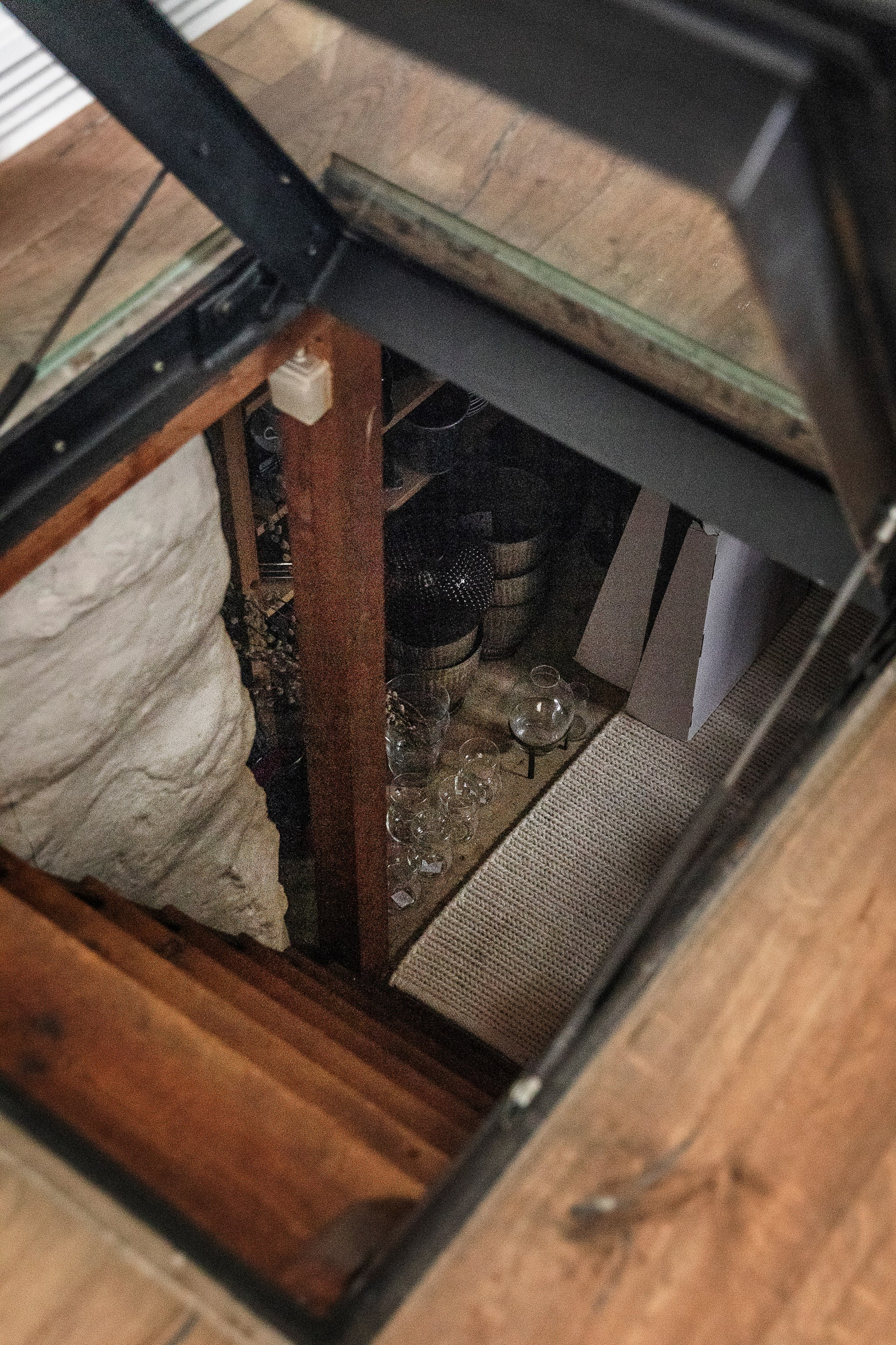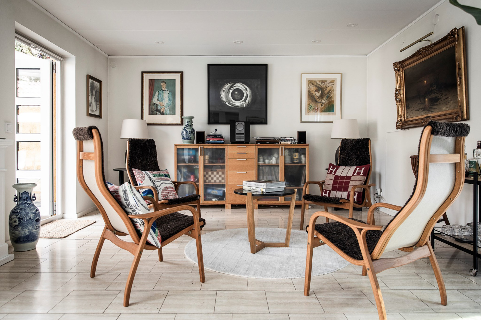 I en vinkel, strax innan husets mer privata delar, ligger ett mindre allrum som bjuder på en varm och inbjudande atmosfär. Den öppna spisen skapar en intim och ombonad känsla – perfekt för lugna kvällar eller en kopp te i stillhet. Här har man även byggt in en specialdesignad lucka i golvet som leder ner till husets vinförråd i källaren – en diskret och elegant lösning som verkligen sätter guldkant på tillvaron.