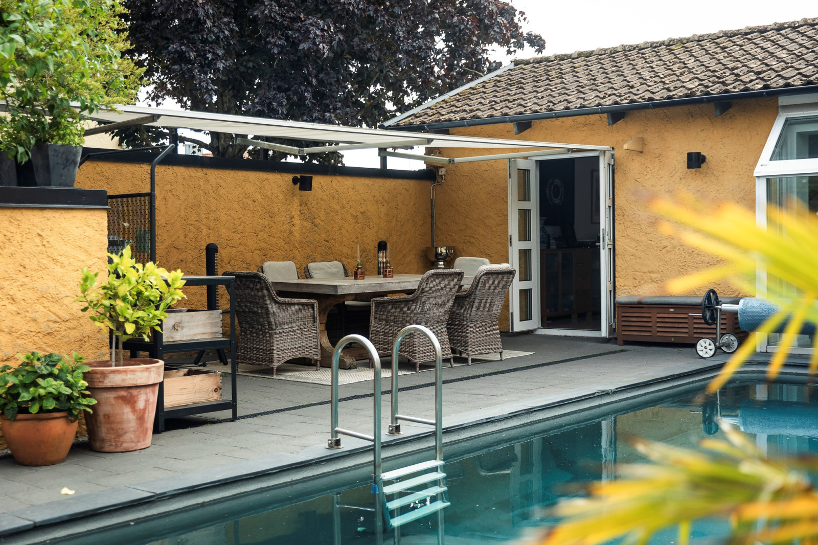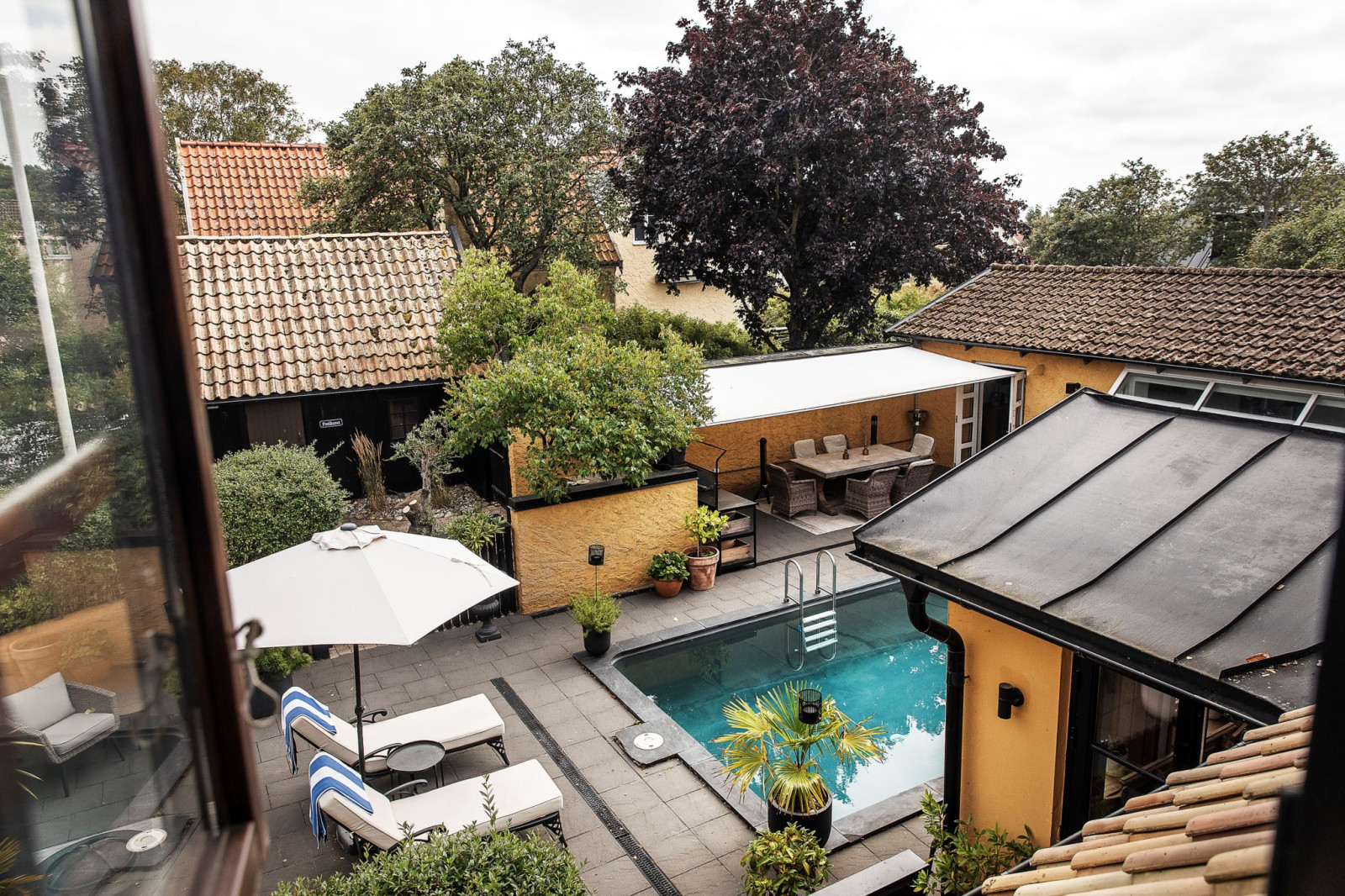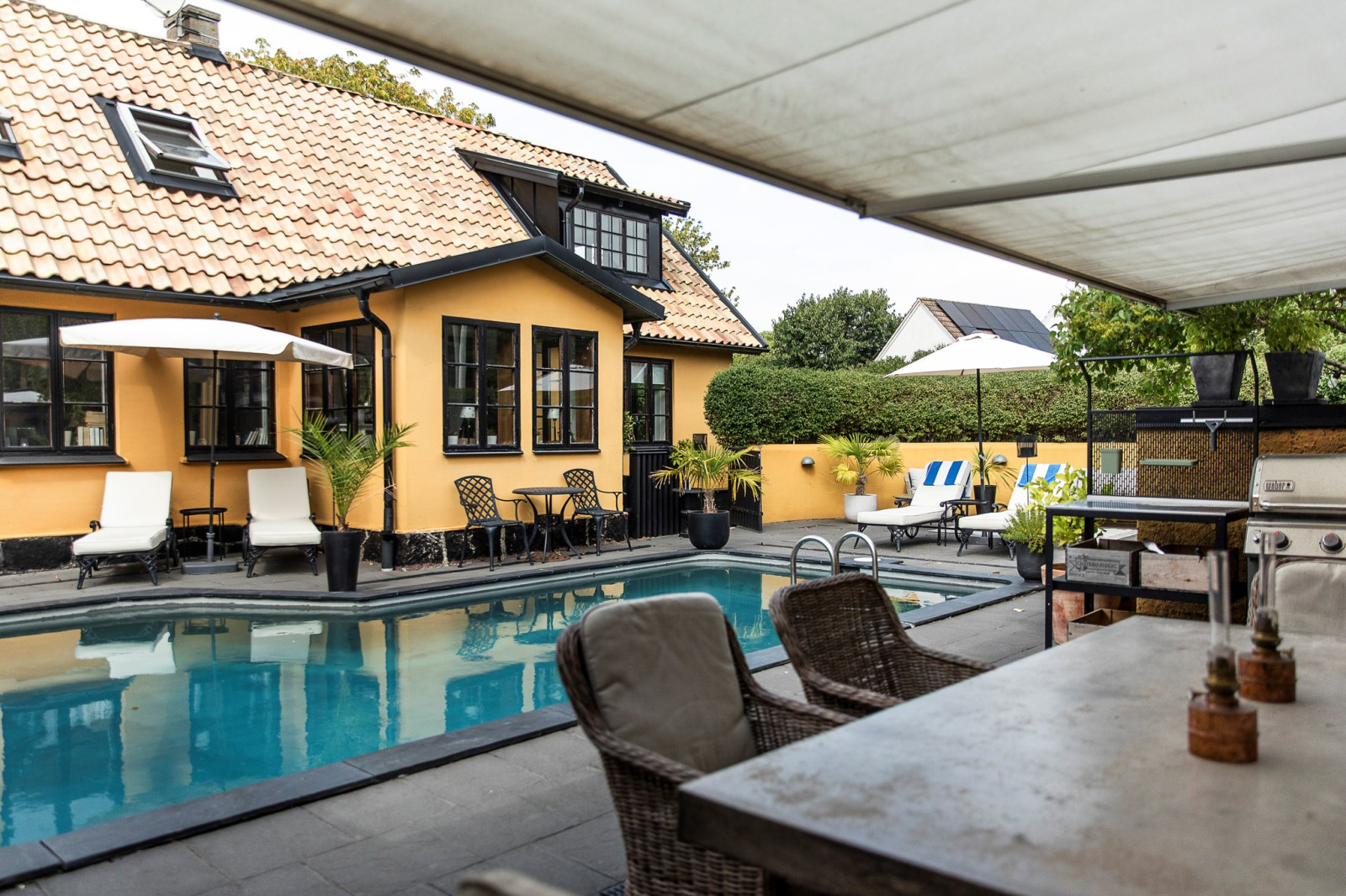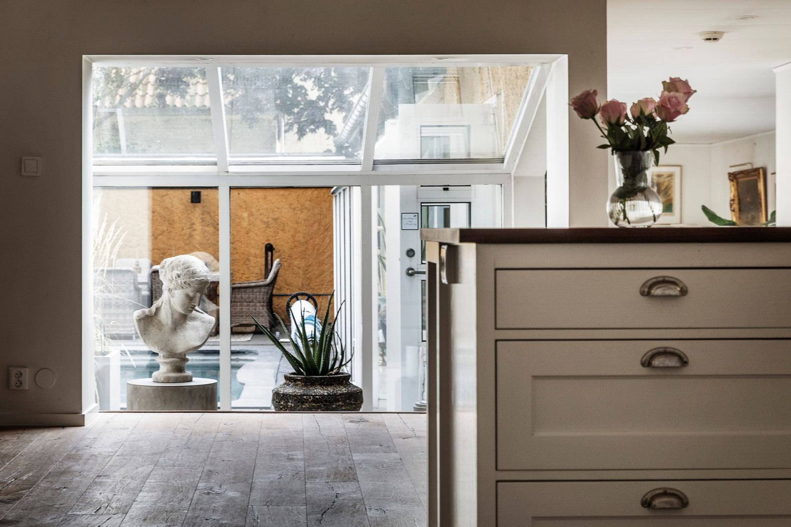 Innan du når utgången till poolområdet och husets innergård finns en ombonad och charmig veranda – en perfekt plats att slå sig ner, koppla av och njuta av lugnet. Här kan du sitta i skuggan under varma dagar eller njuta av svalka på sommarkvällarna, omsluten av en trivsam och rofylld atmosfär. Verandan blir en naturlig förlängning av hemmets sociala ytor och en favoritplats för både vardagsstunder och stilla stunder med en bok eller en kopp kaffe.