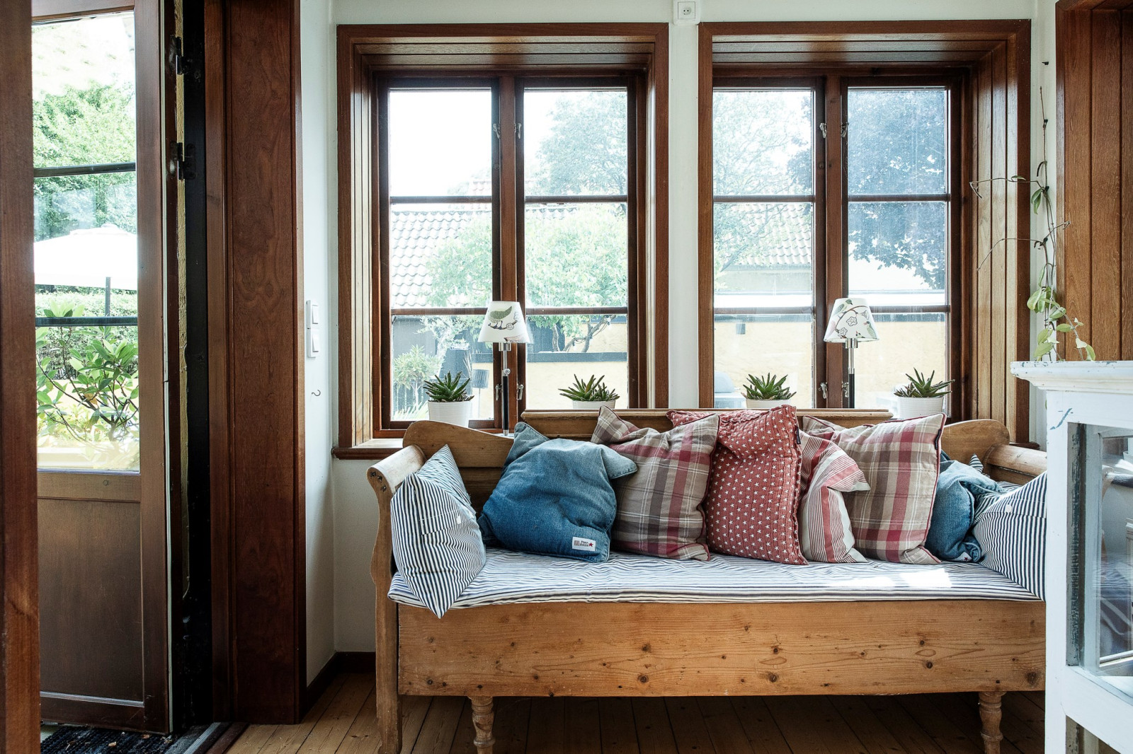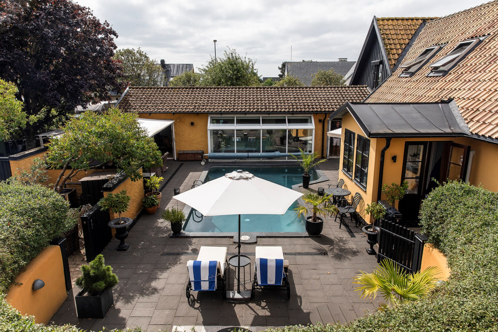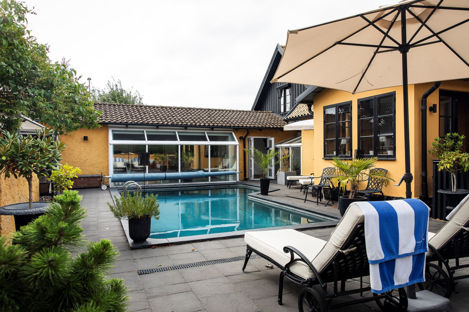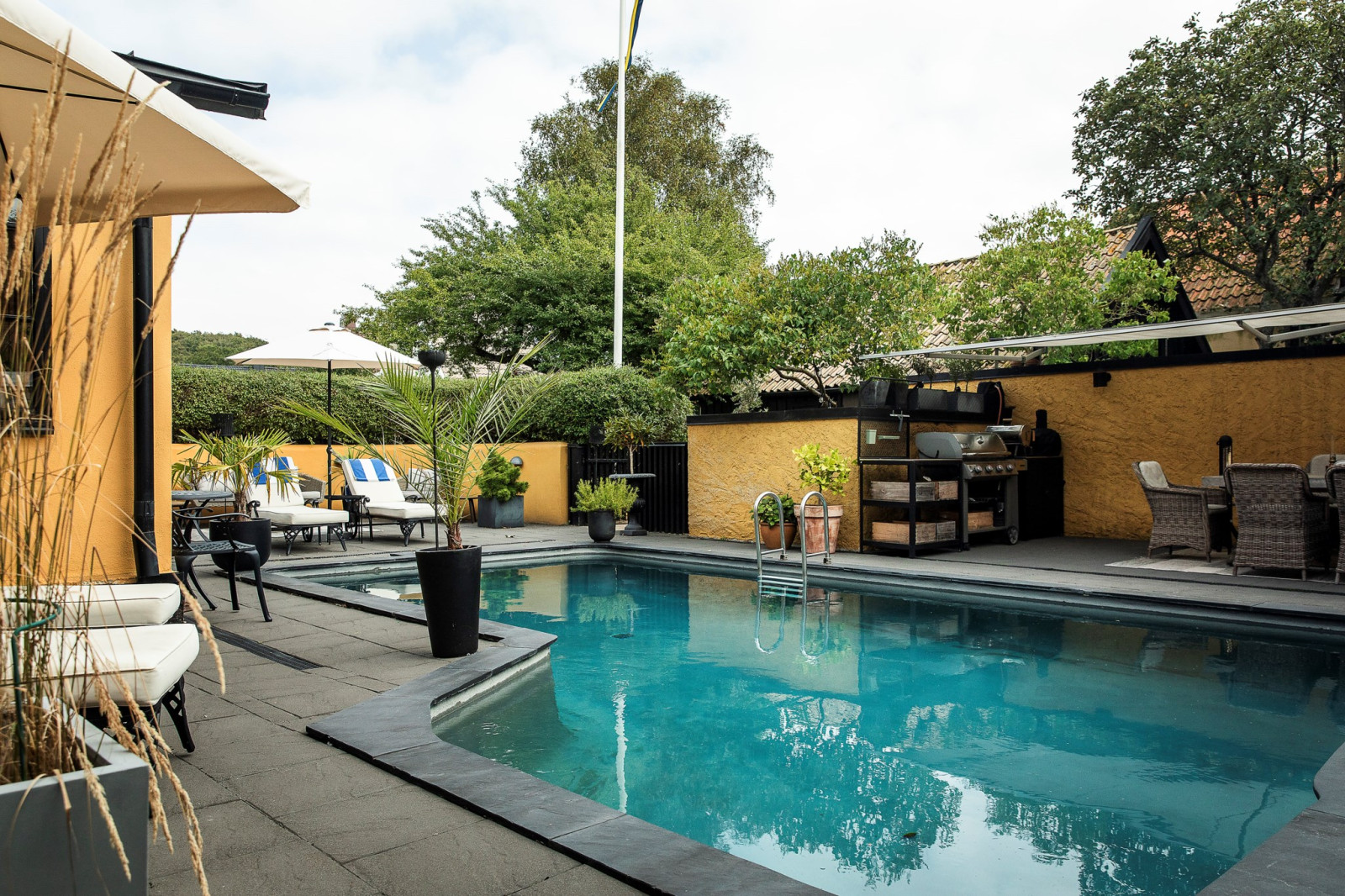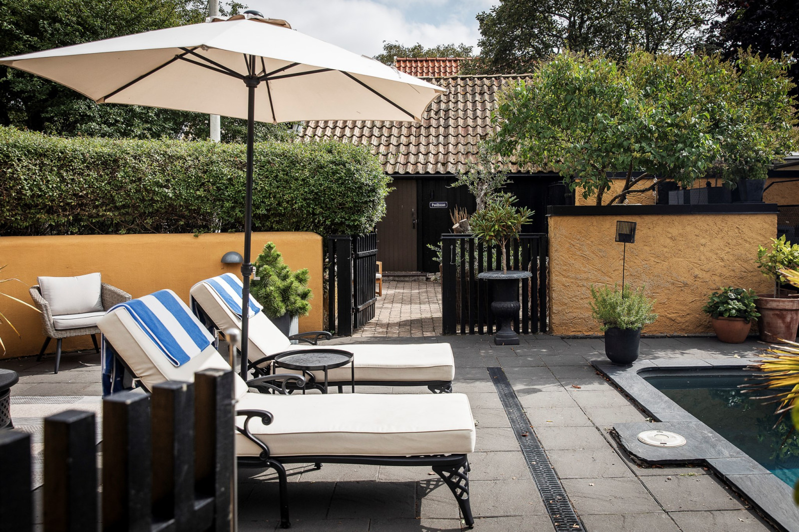 Innan du når utgången till poolområdet och husets innergård finns en ombonad och charmig veranda – en perfekt plats att slå sig ner, koppla av och njuta av lugnet. Här kan du sitta i skuggan under varma dagar eller njuta av svalka på sommarkvällarna, omsluten av en trivsam och rofylld atmosfär. Verandan blir en naturlig förlängning av hemmets sociala ytor och en favoritplats för både vardagsstunder och stilla stunder med en bok eller en kopp kaffe.