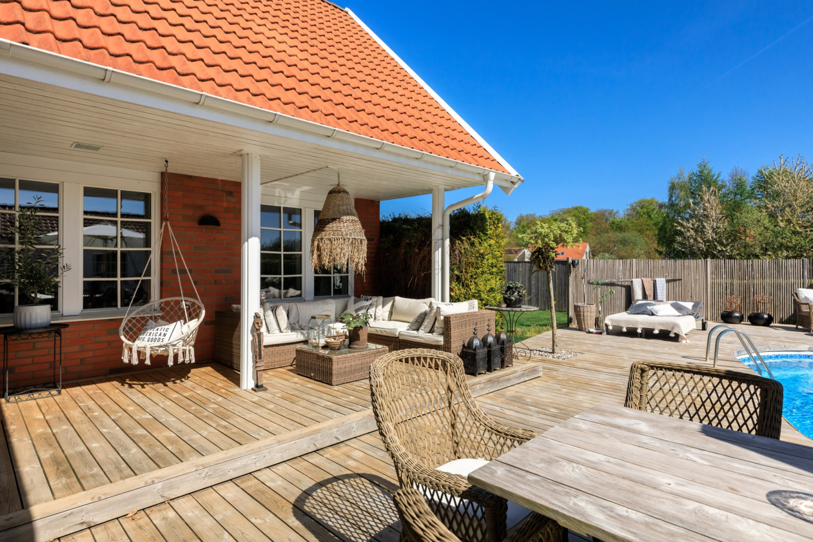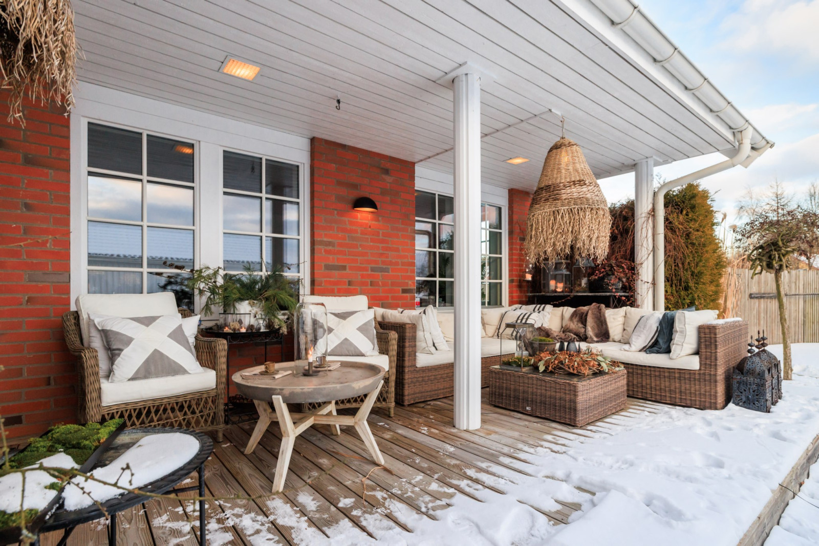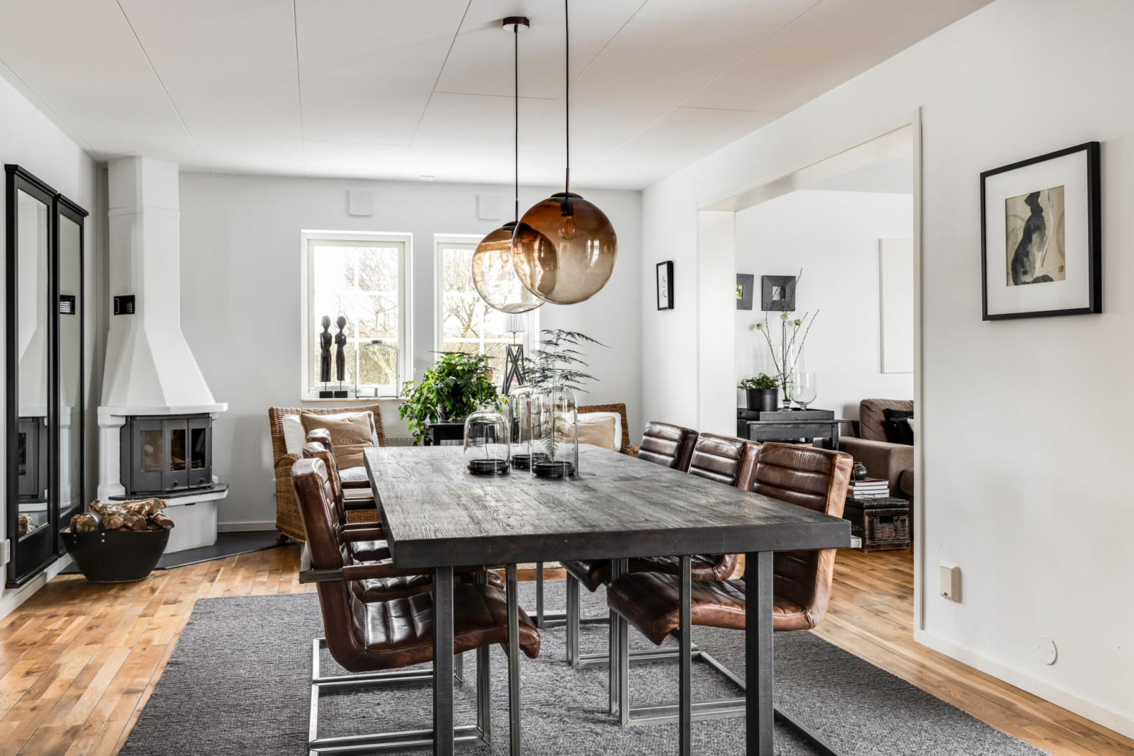 med skeppsgolv, kamin och utgång till uteplats på trädäck och trädgården