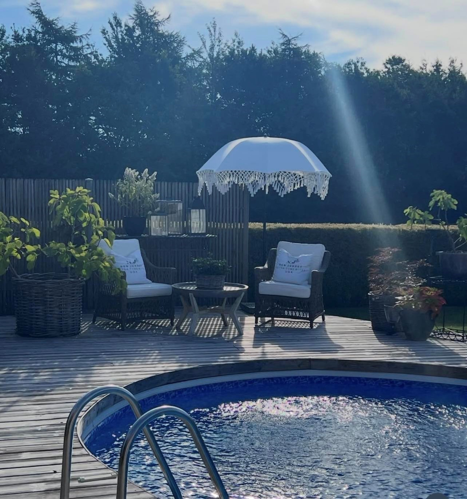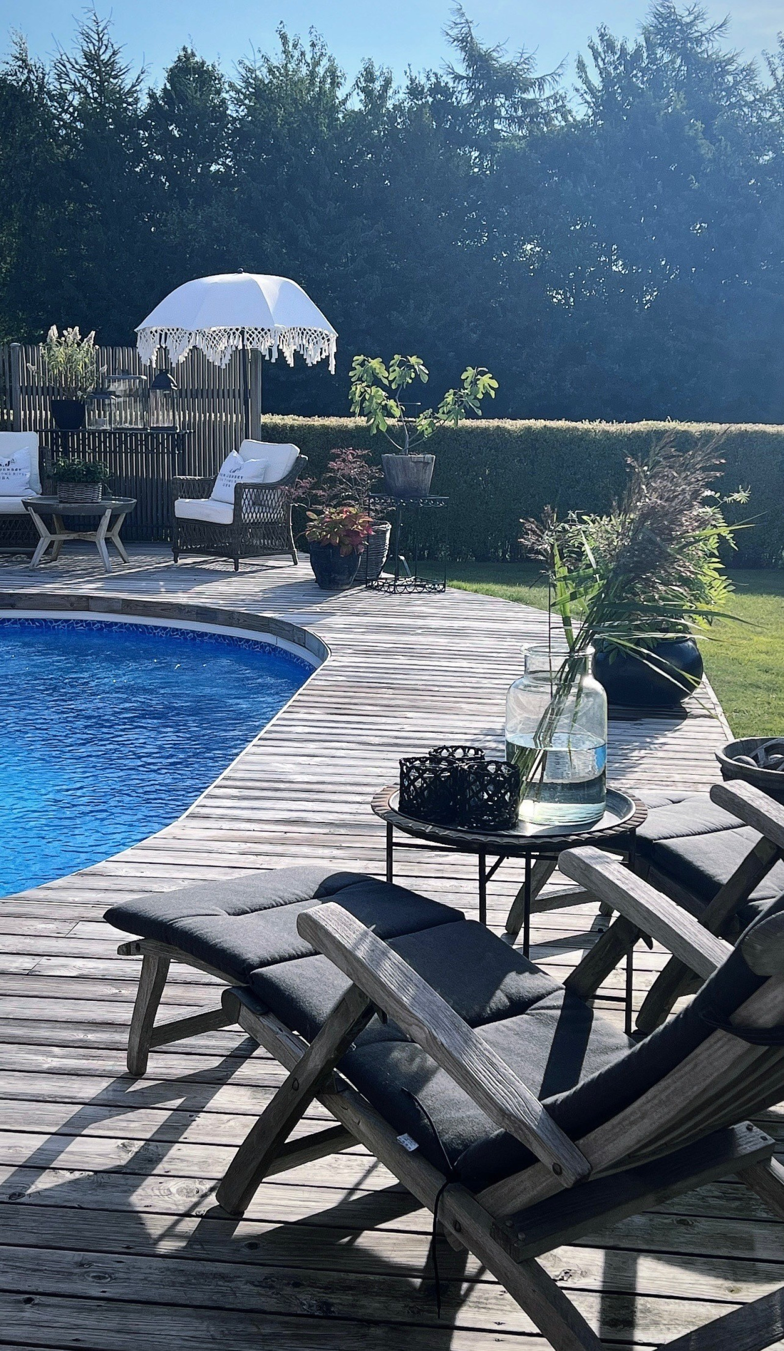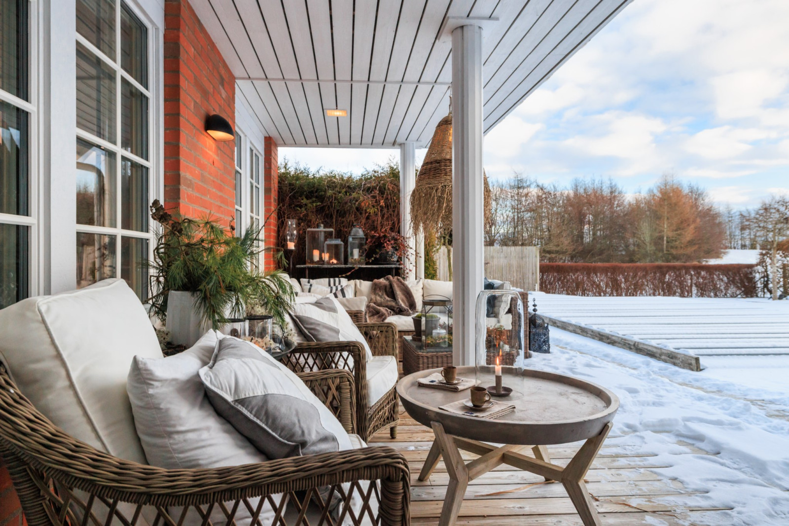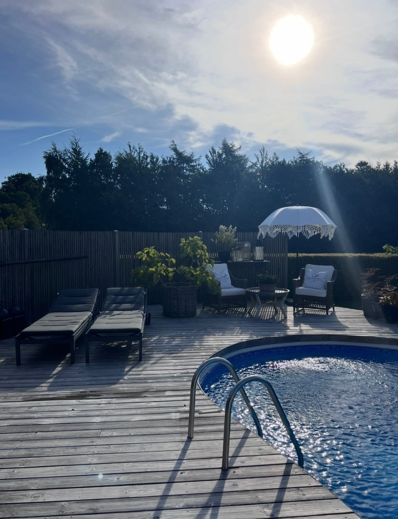 med skeppsgolv, kamin och utgång till uteplats på trädäck och trädgården