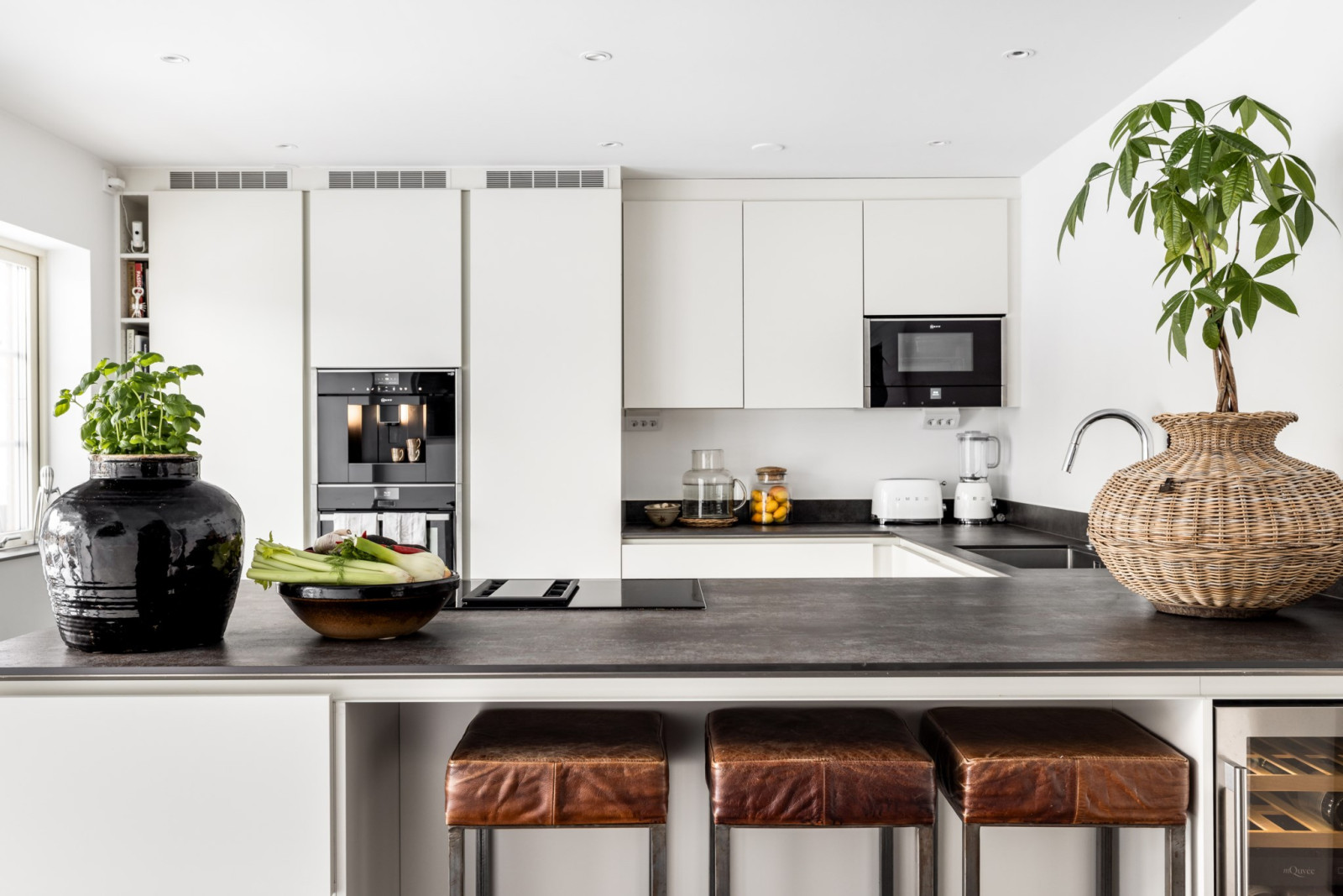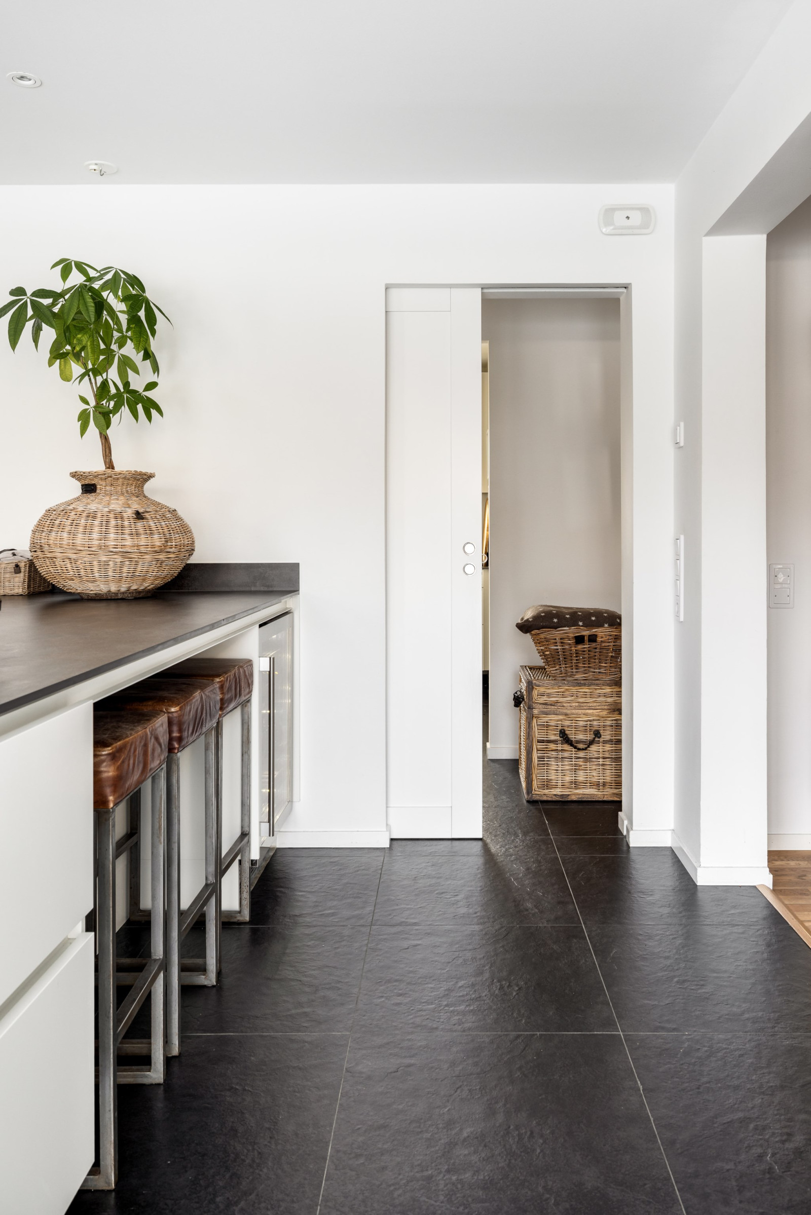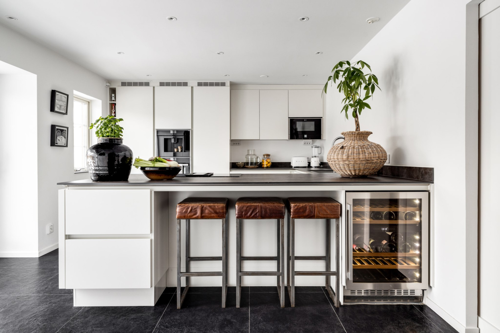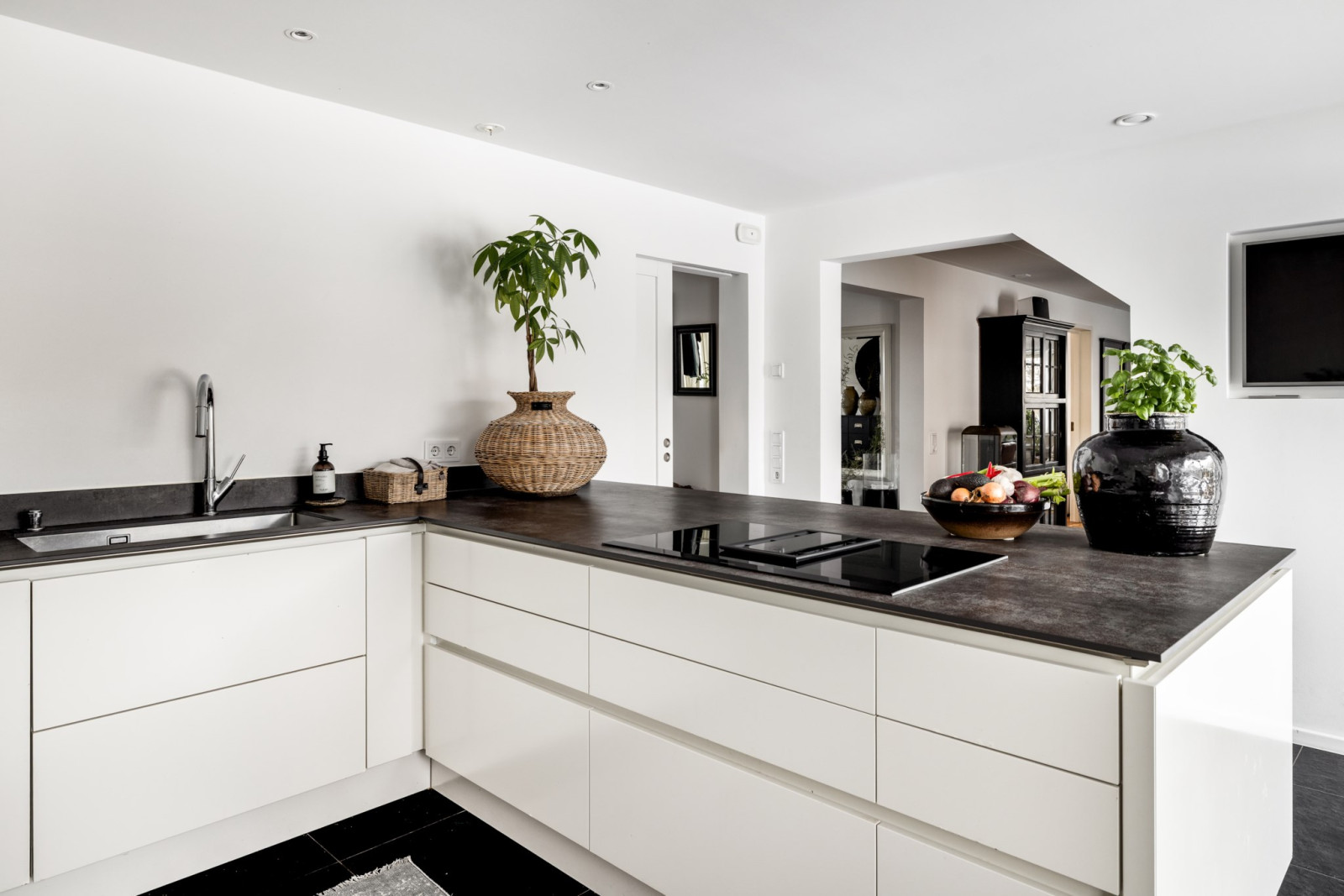 renoverat 2019 med klinker, vit köksinredning från HTH, bänkskiva i sten från Neolith, ugn, micro, induktionshäll med inbyggd fläkt, diskmaskin, kyl och frys (vitvarorna från 2018 av NEFF och Siemens), stort öppningsbart glasparti mot trädgården och uteplatsen
