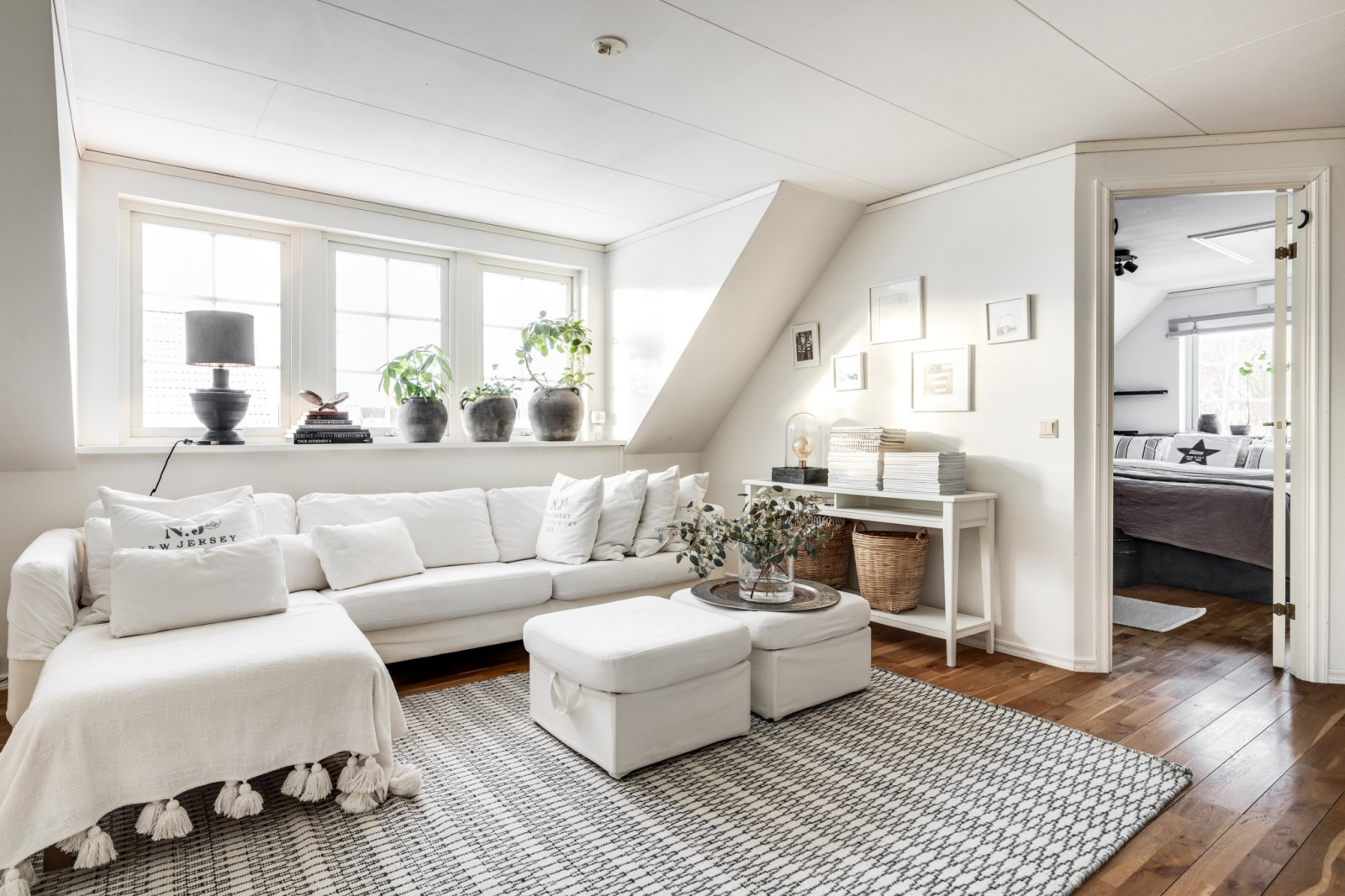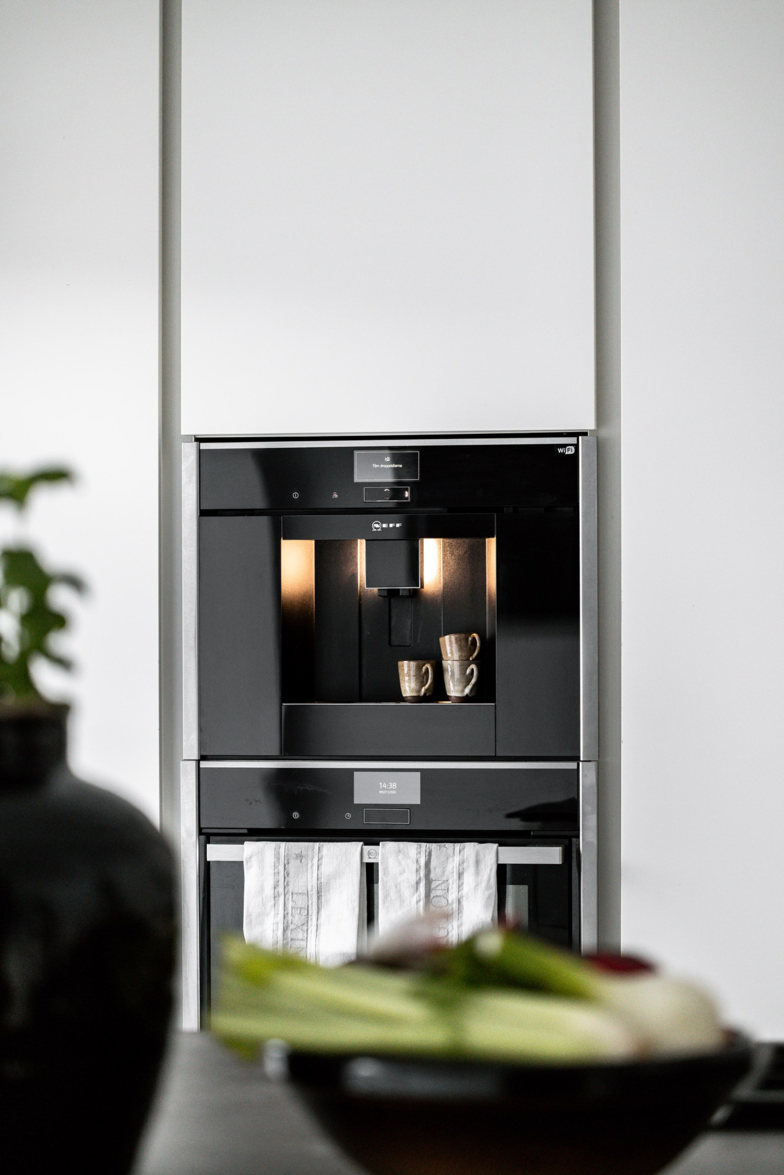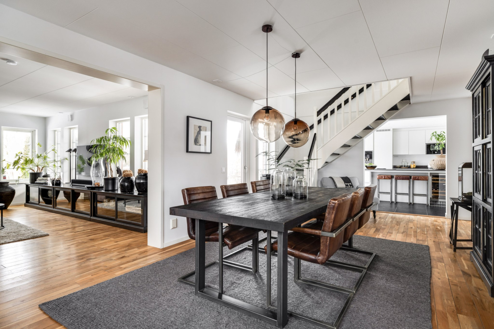 renoverat 2019 med klinker, vit köksinredning från HTH, bänkskiva i sten från Neolith, ugn, micro, induktionshäll med inbyggd fläkt, diskmaskin, kyl och frys (vitvarorna från 2018 av NEFF och Siemens), stort öppningsbart glasparti mot trädgården och uteplatsen