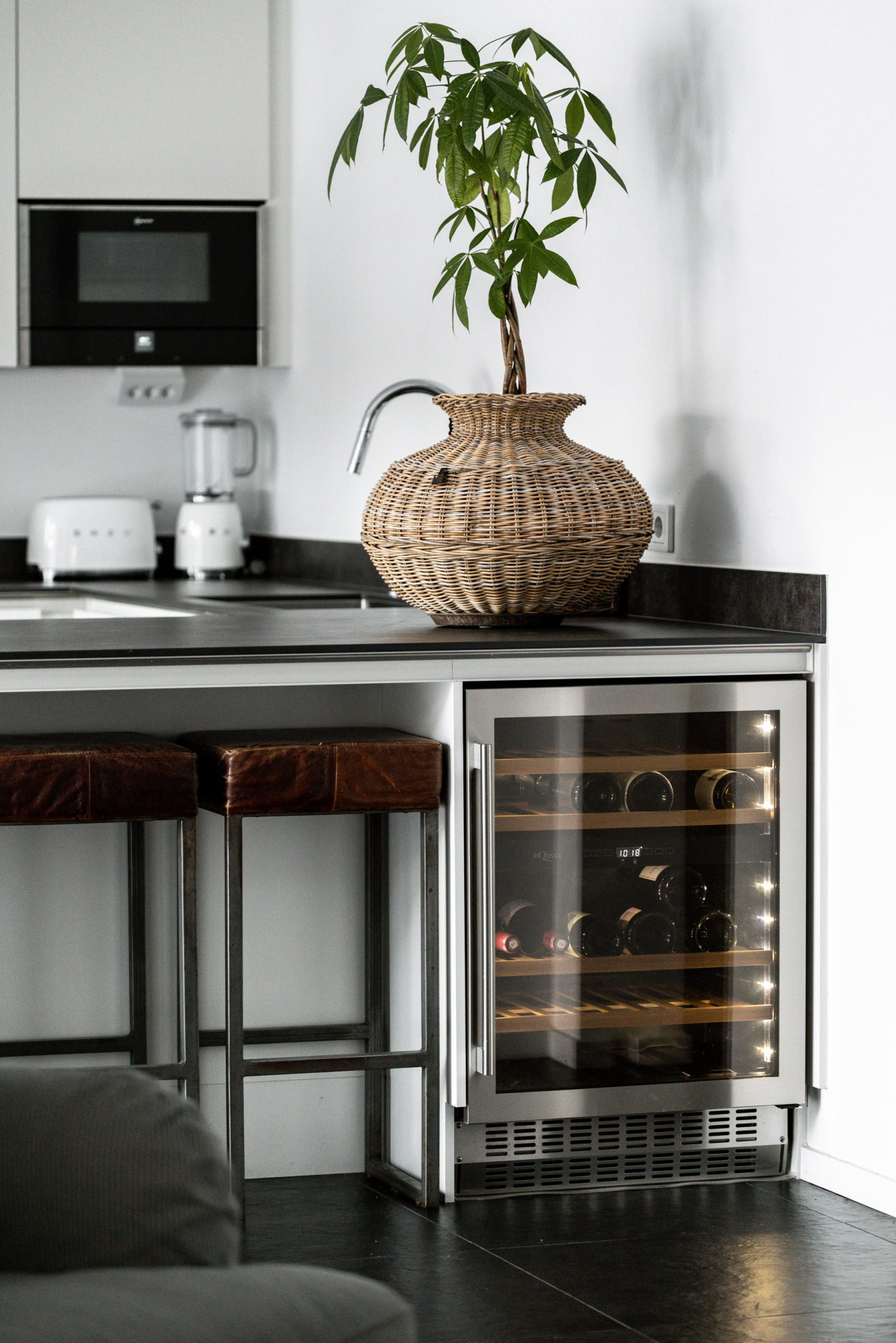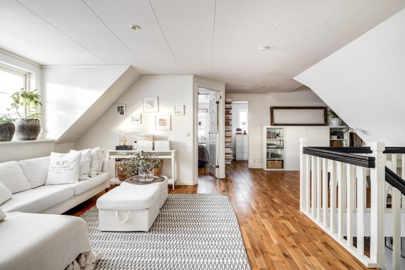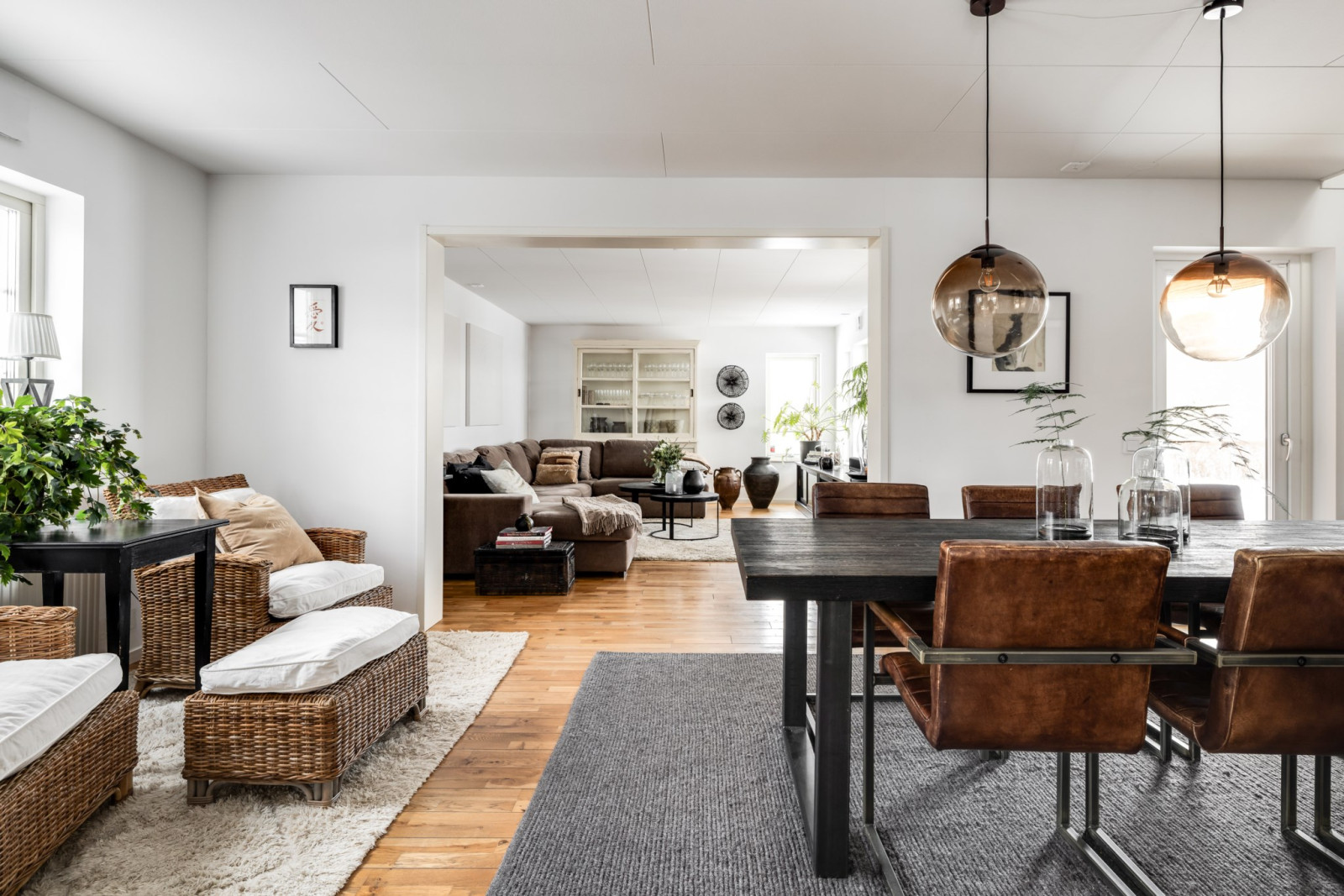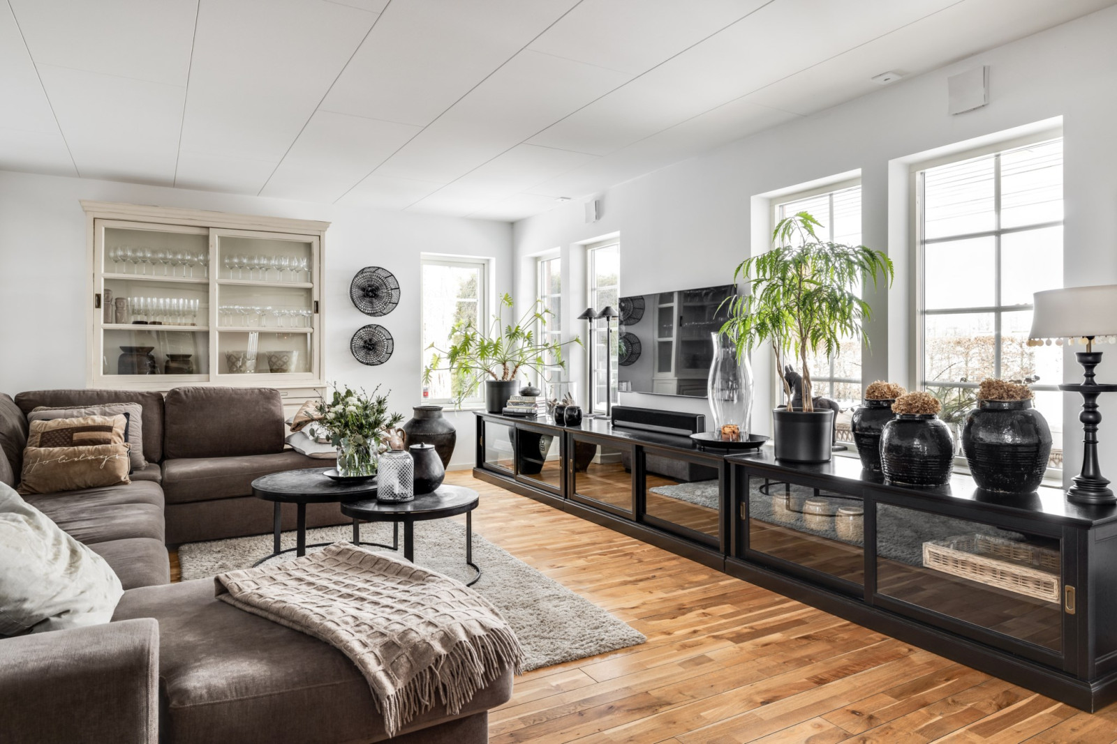 renoverat 2019 med klinker, vit köksinredning från HTH, bänkskiva i sten från Neolith, ugn, micro, induktionshäll med inbyggd fläkt, diskmaskin, kyl och frys (vitvarorna från 2018 av NEFF och Siemens), stort öppningsbart glasparti mot trädgården och uteplatsen
