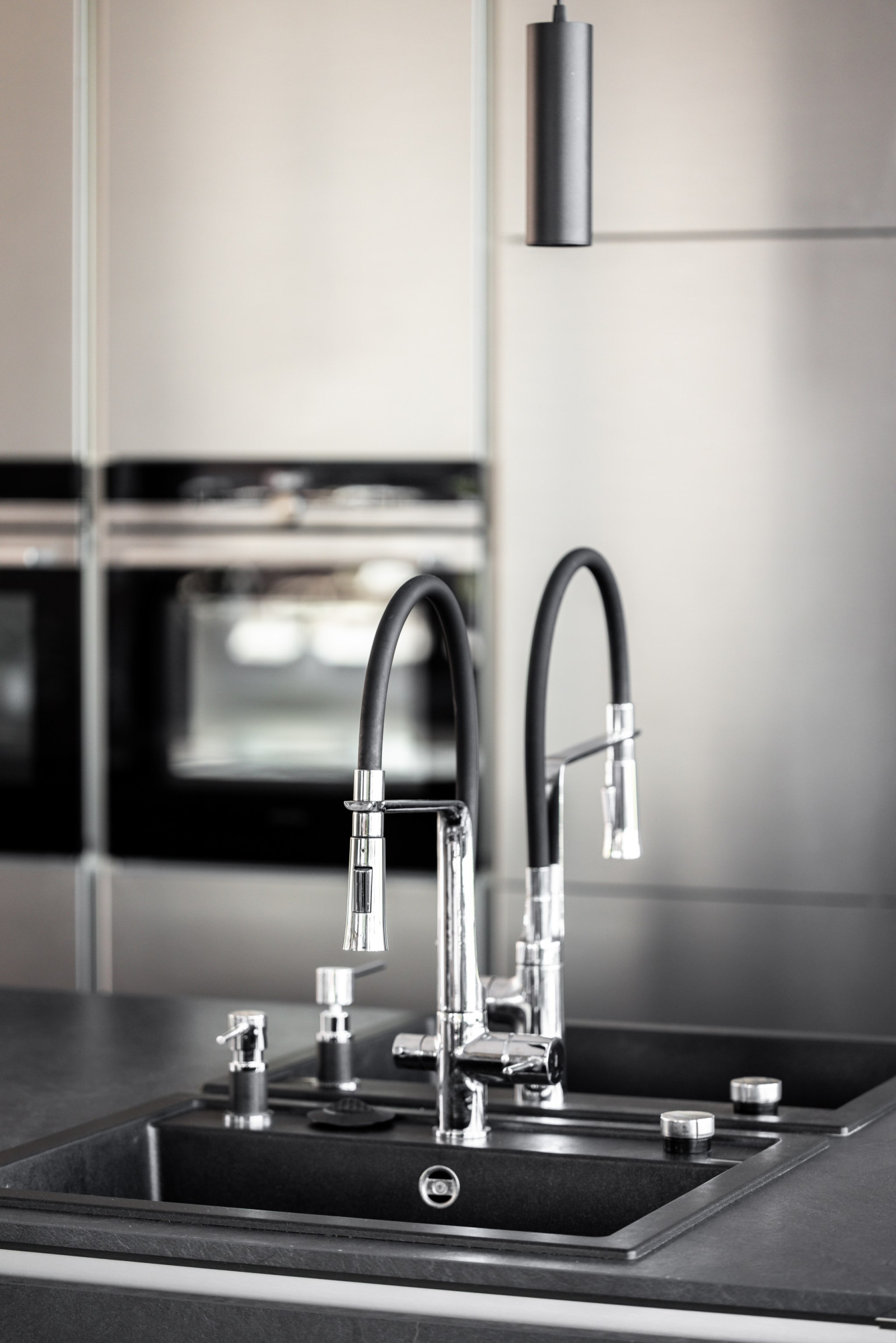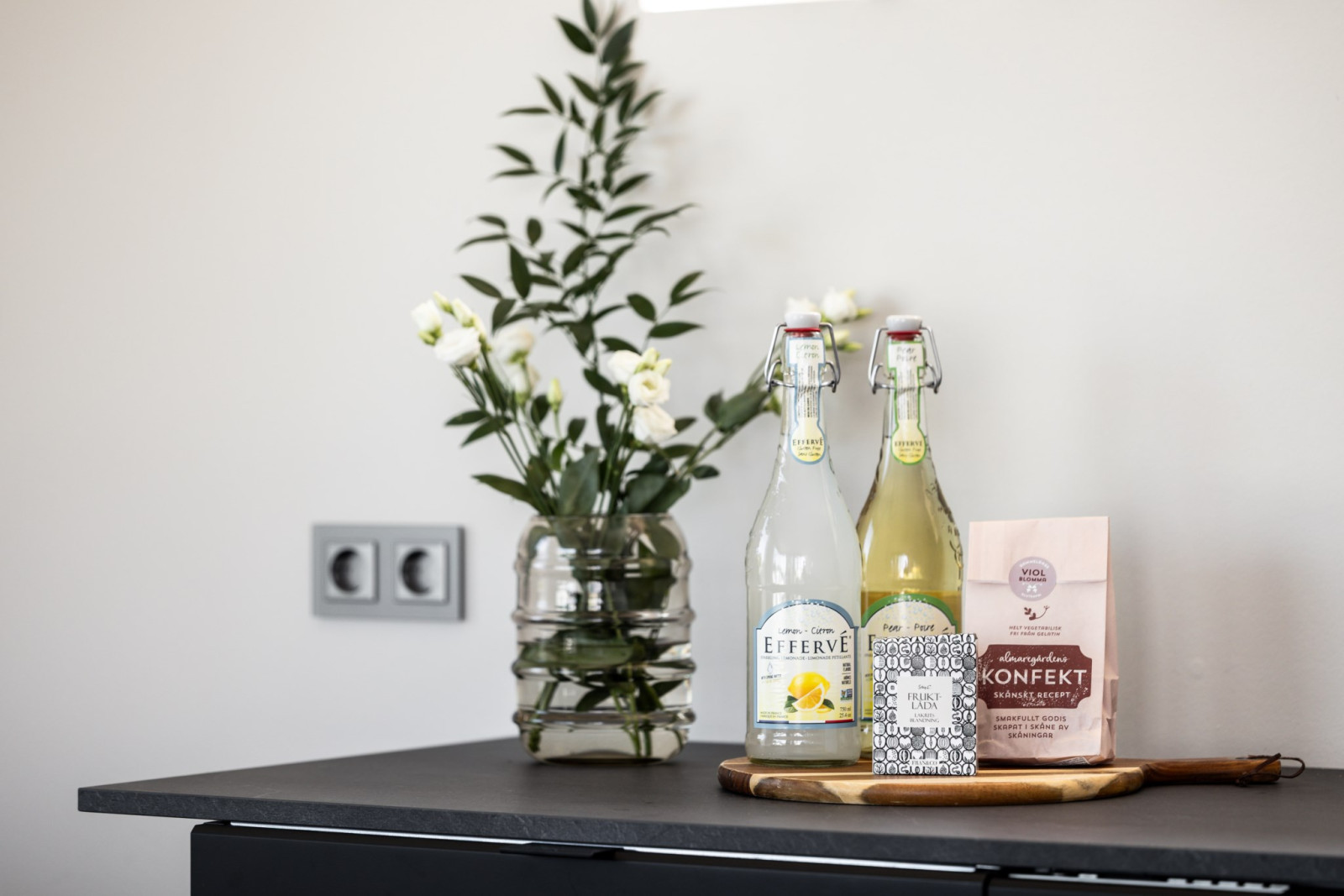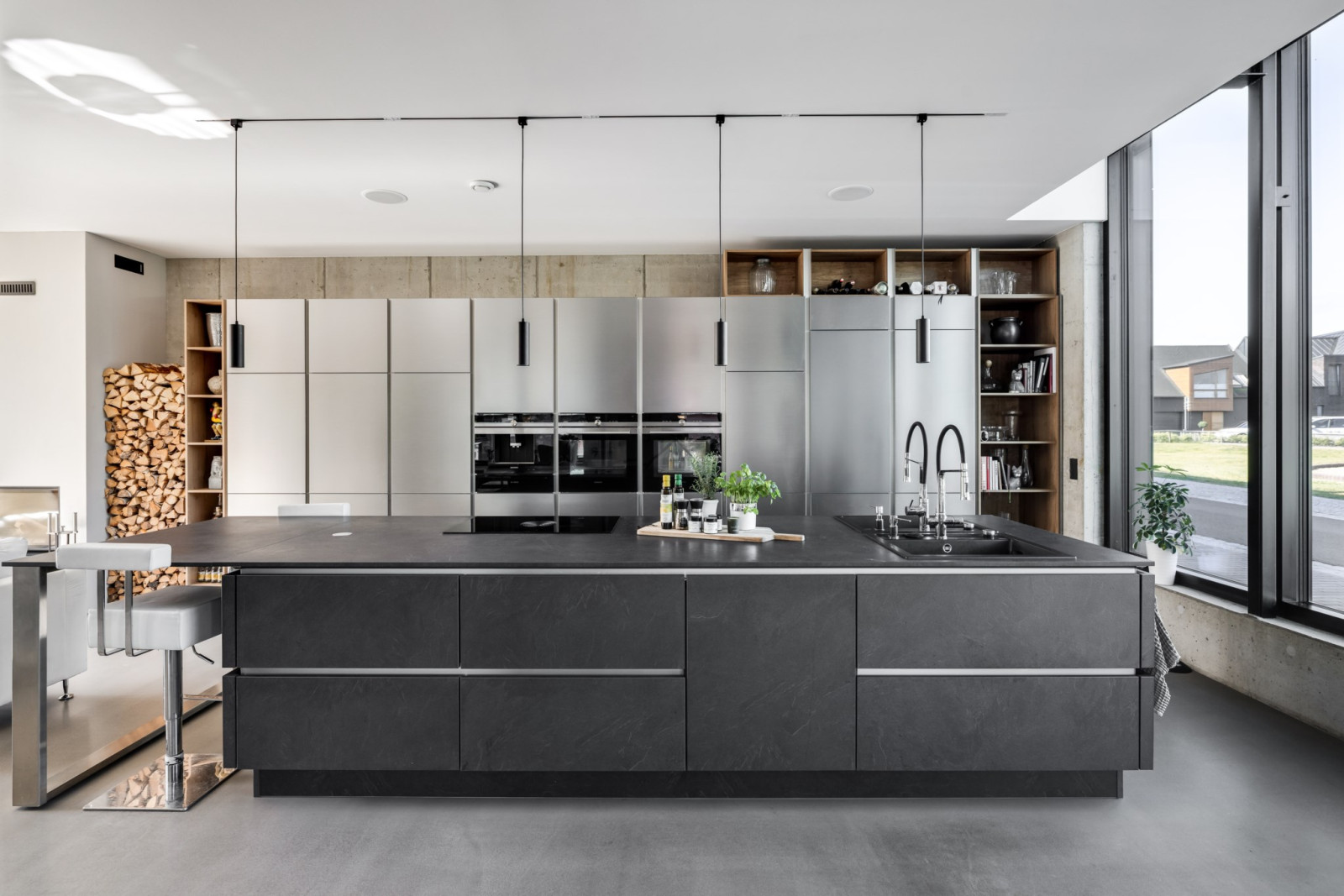 Köket är levererat av den tyska tillverkaren Ixina och är utrustat för den kräsne. En hel vägg med rostfria skåpsluckor rymmer integrerad kyl och frys, två ugnar, en med inbyggd micro samt en inbyggd kaffemaskin med koppvärmare. Den generösa köksön erbjuder två diskhoar, diskmaskin och rikligt med arbetsyta – en självklar samlingspunkt för både vardag och fest.