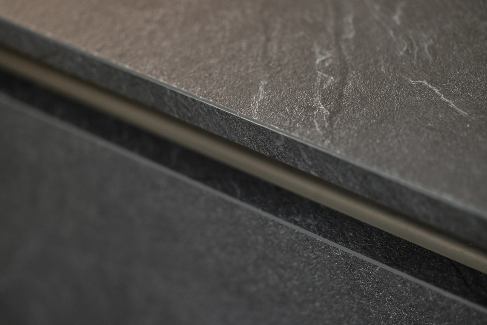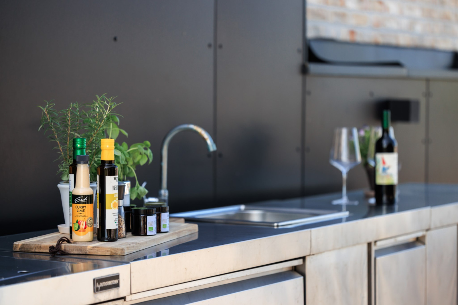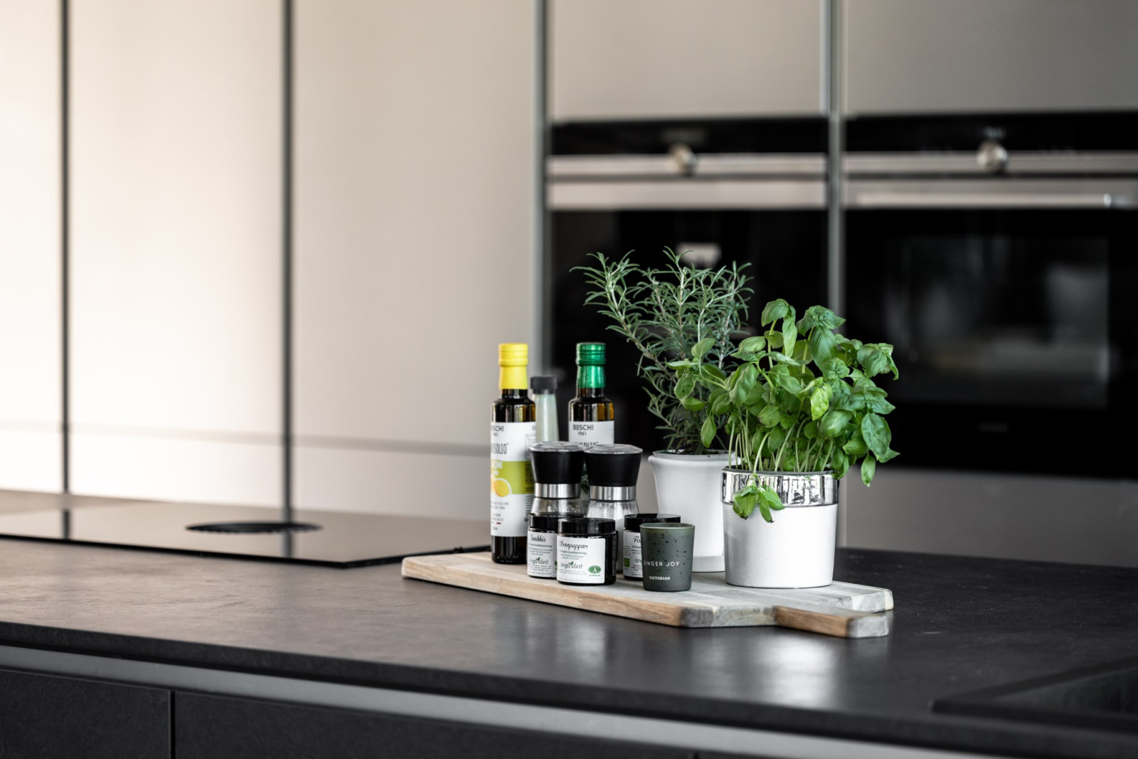 Köket är levererat av den tyska tillverkaren Ixina och är utrustat för den kräsne. En hel vägg med rostfria skåpsluckor rymmer integrerad kyl och frys, två ugnar, en med inbyggd micro samt en inbyggd kaffemaskin med koppvärmare. Den generösa köksön erbjuder två diskhoar, diskmaskin och rikligt med arbetsyta – en självklar samlingspunkt för både vardag och fest.