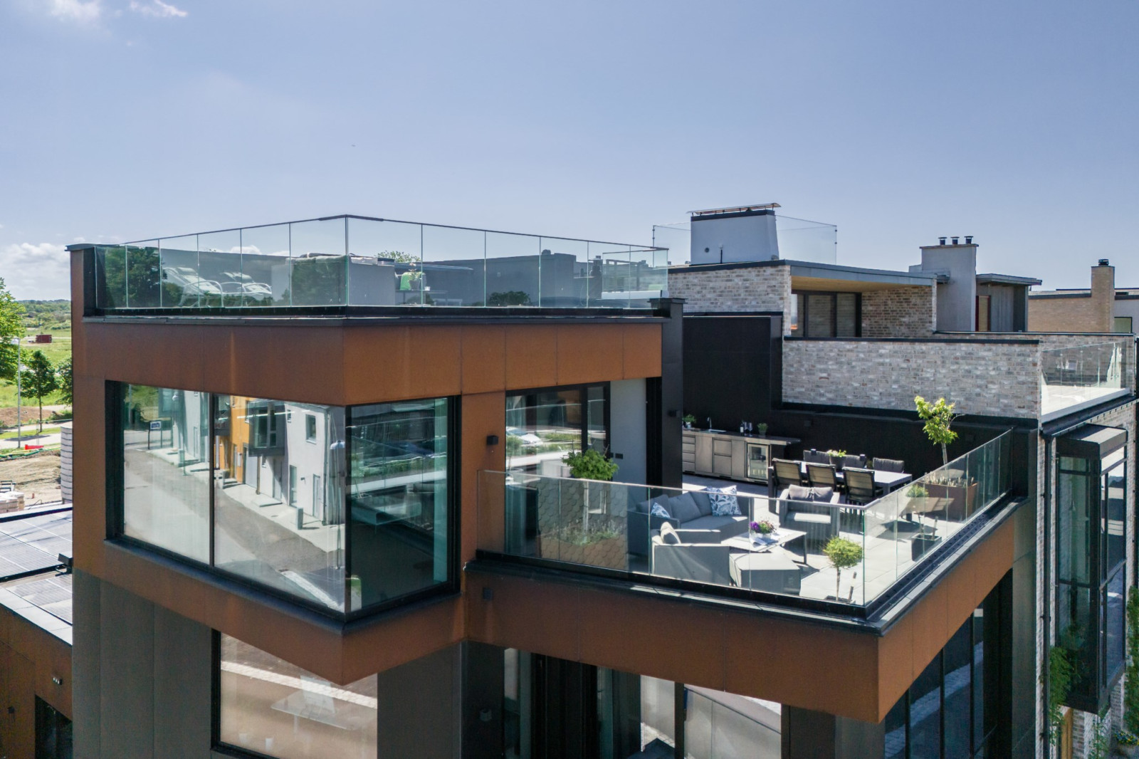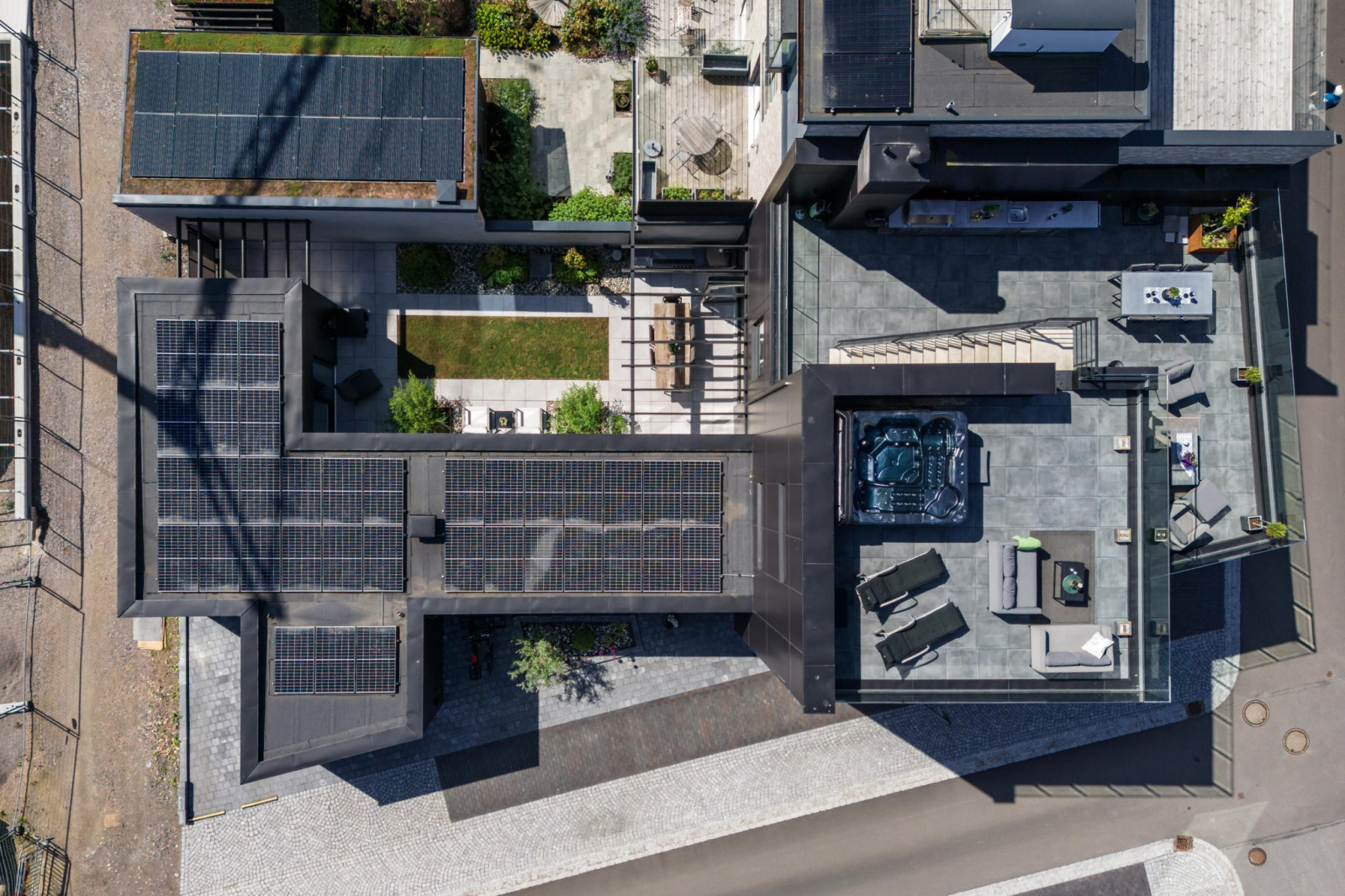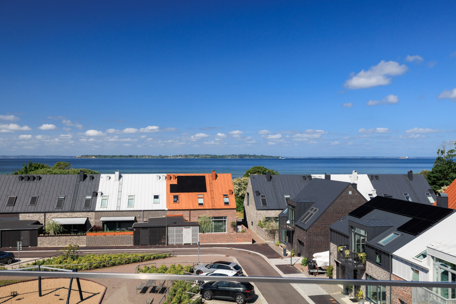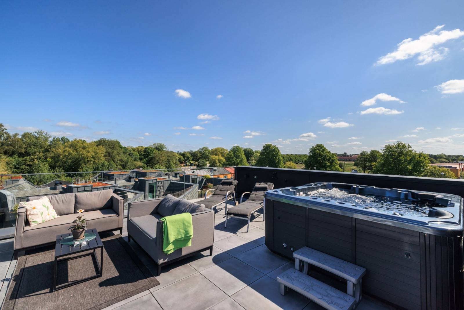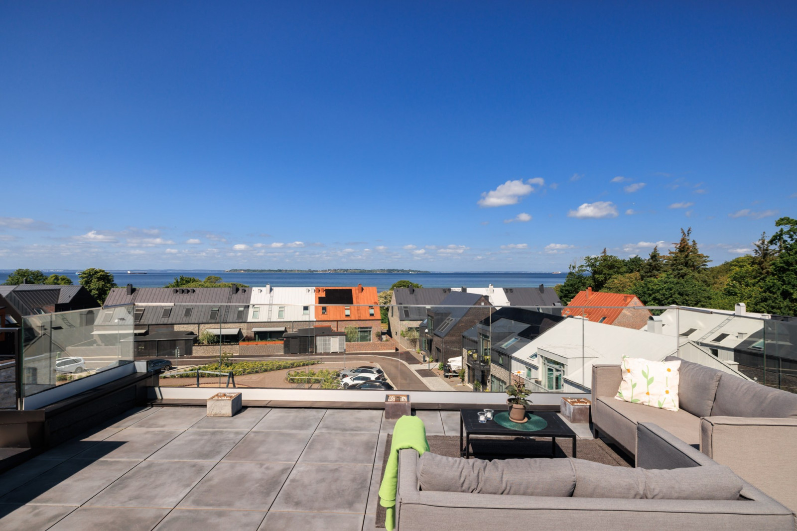 Från den stora terrassen på tredje våningen leder en trappa upp till husets fjärde plan – en helt privat takterrass med fri utsikt över sundet, Ven och ända ner till Köpenhamn. Här står ett bubblande spabad och det finns gott om plats att möblera med matbord eller loungemöbler.