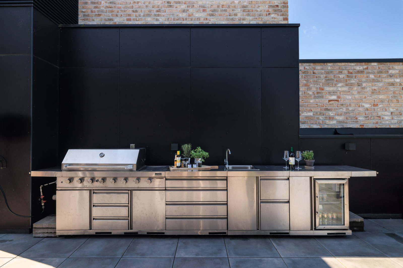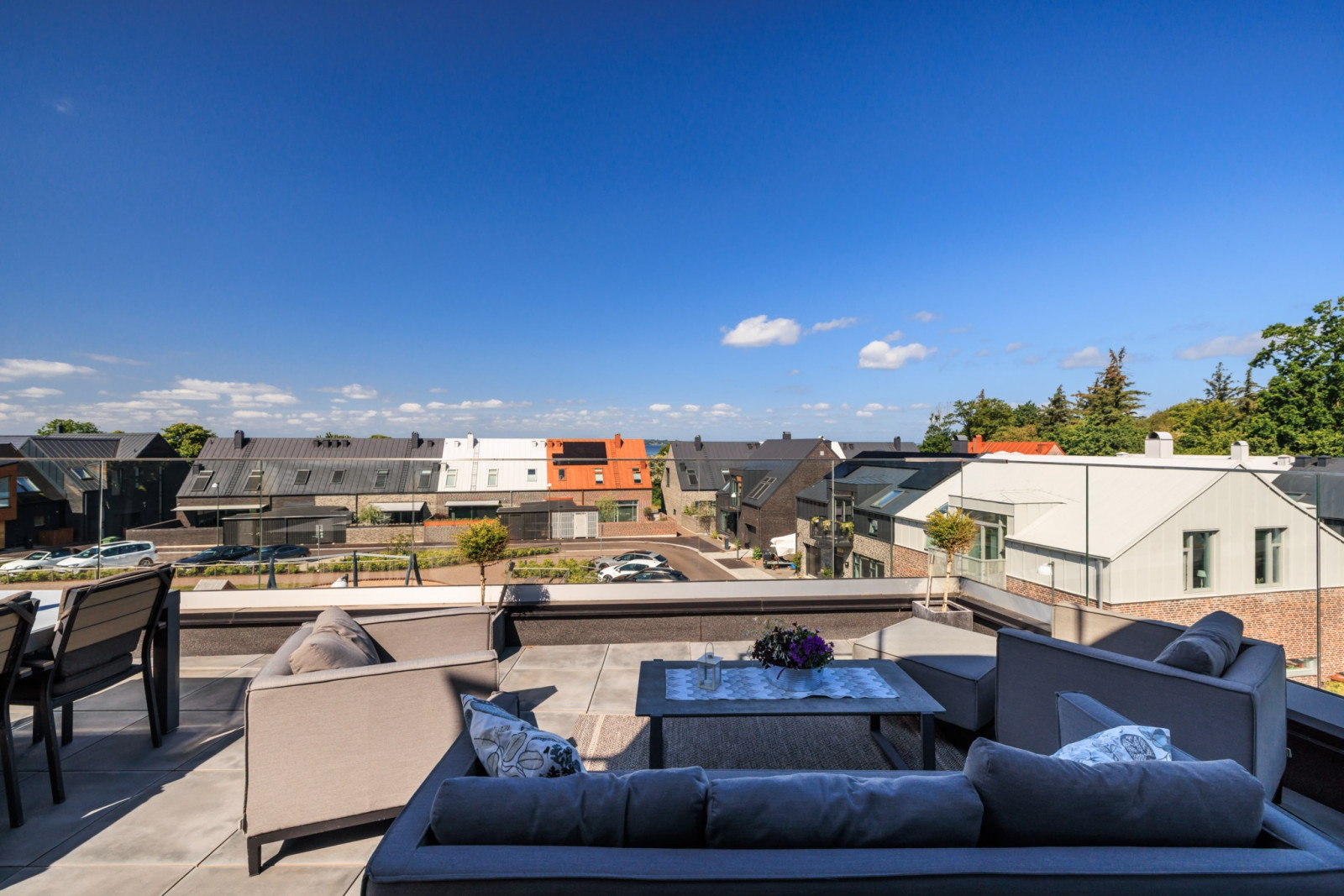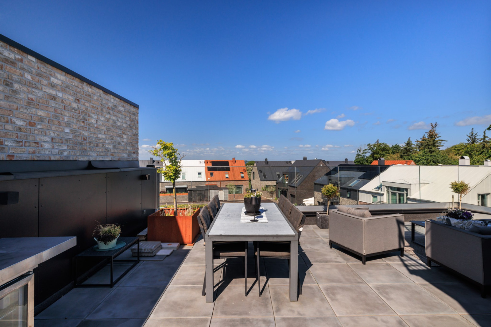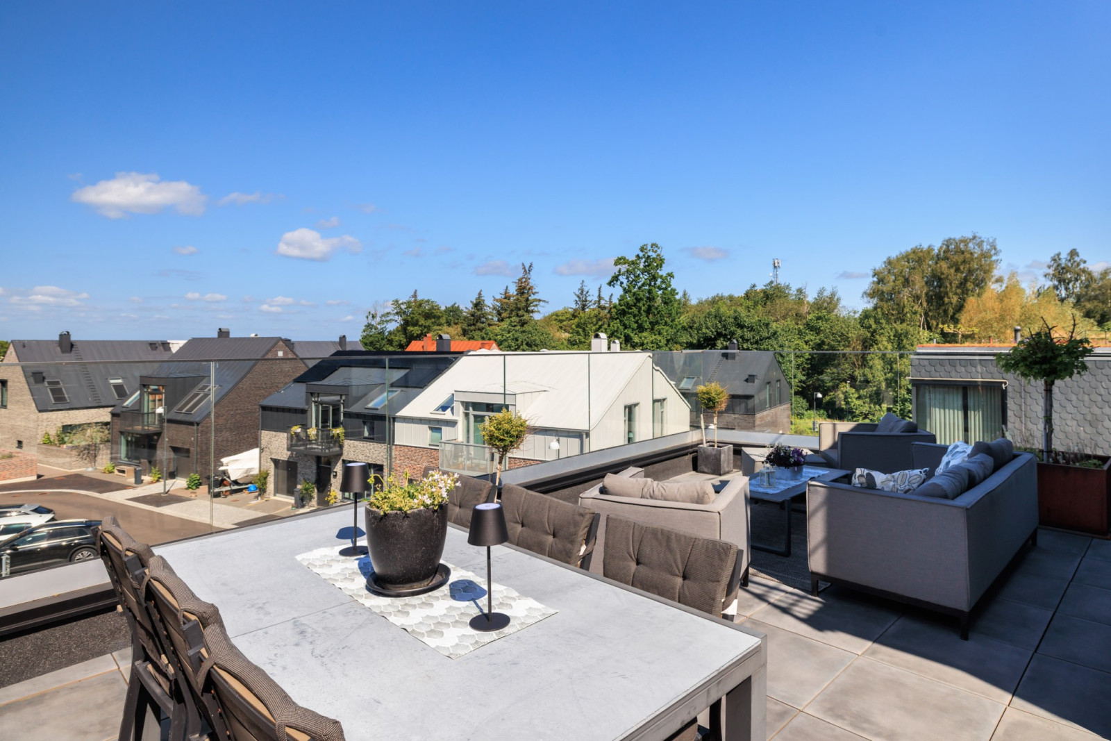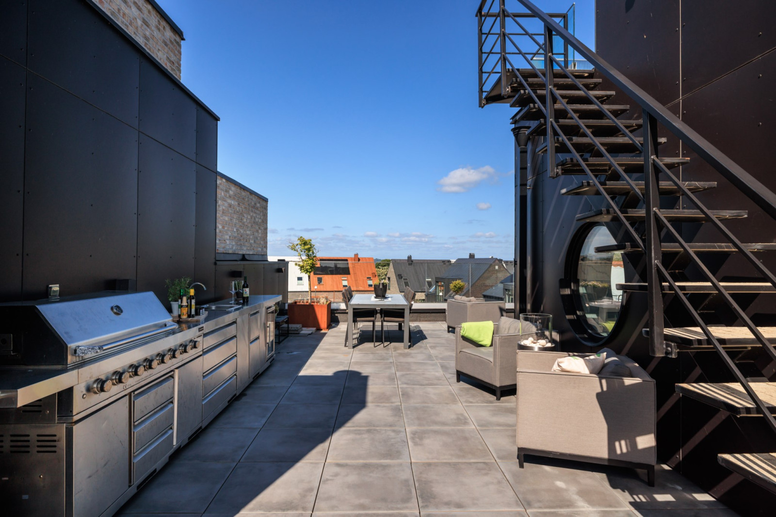 Från den stora terrassen på tredje våningen leder en trappa upp till husets fjärde plan – en helt privat takterrass med fri utsikt över sundet, Ven och ända ner till Köpenhamn. Här står ett bubblande spabad och det finns gott om plats att möblera med matbord eller loungemöbler.